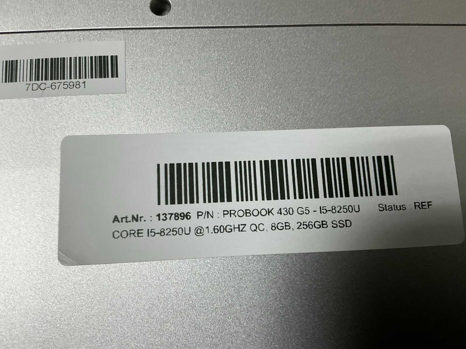 Laptops, Probook 430 G5, CPU: i5-8250U 1.60Ghz, MEM: 8GB, SSD: 256GB NVMe, Cosmetic Damage: palmrest white spots, no adapter, , ( cleaned and tested ) [ID: 137896] Merk: HP