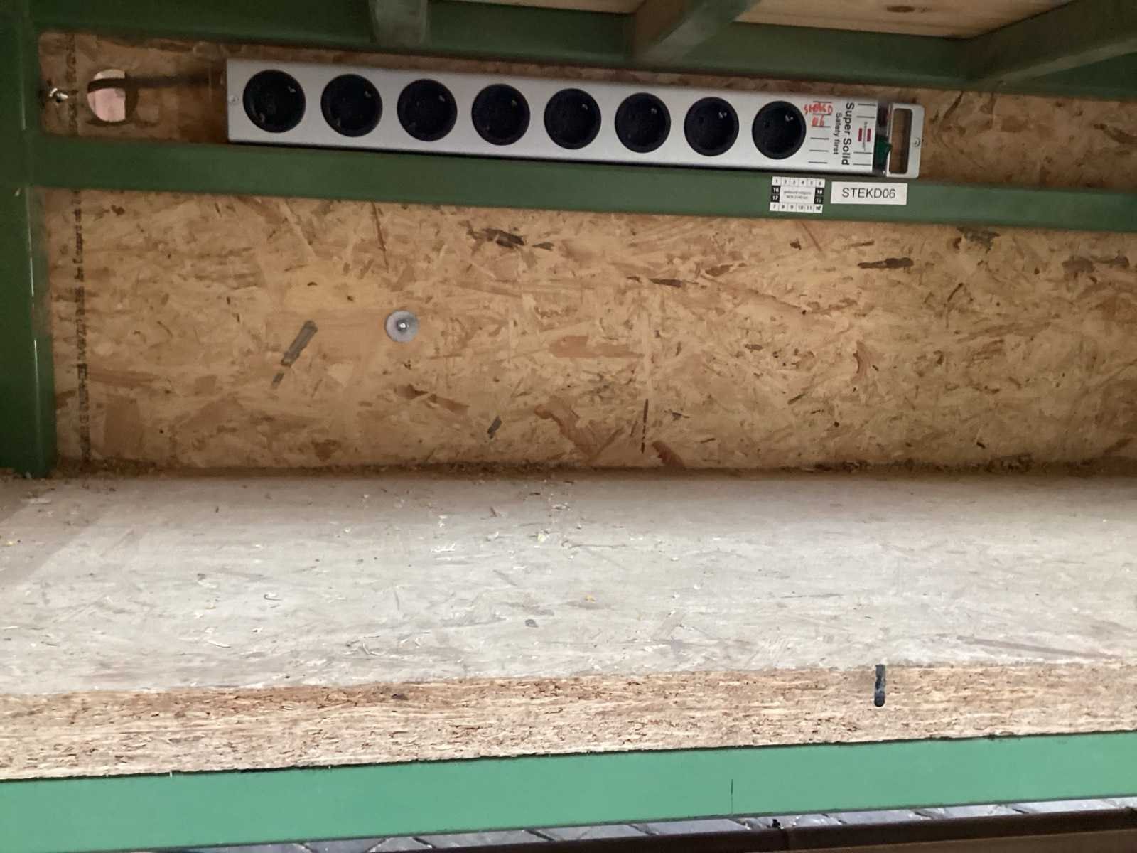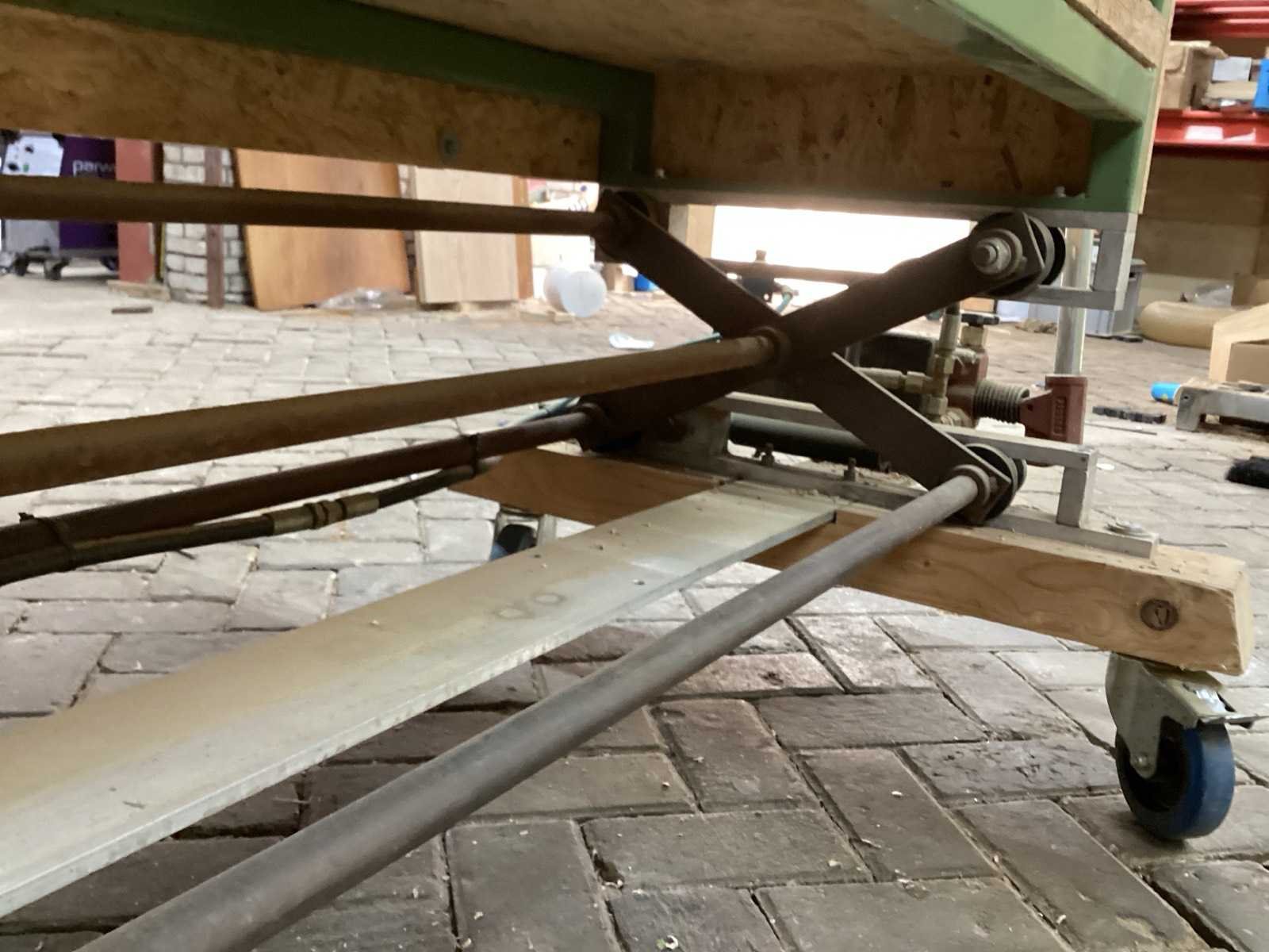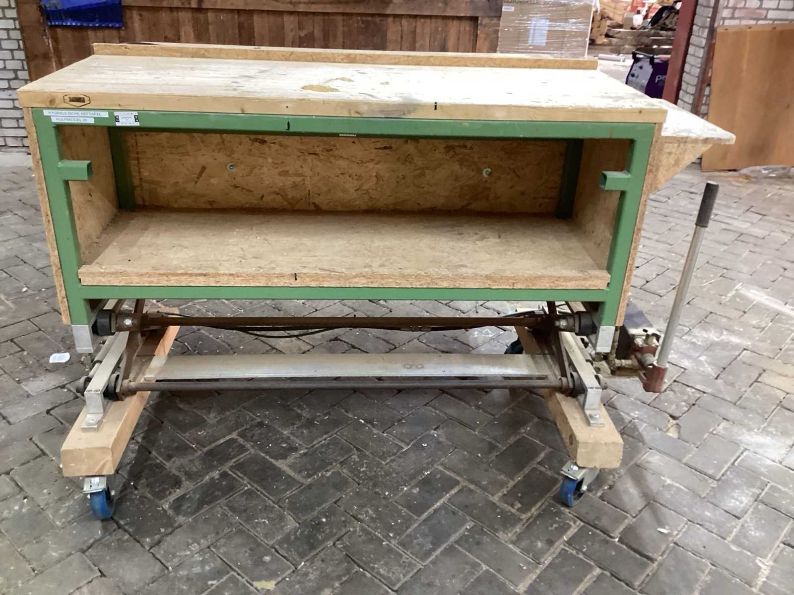 Hydraulische hefinrichting en aanleunblad. Lengte: 180cm Breedte: 135cm Hoogte: 110cm