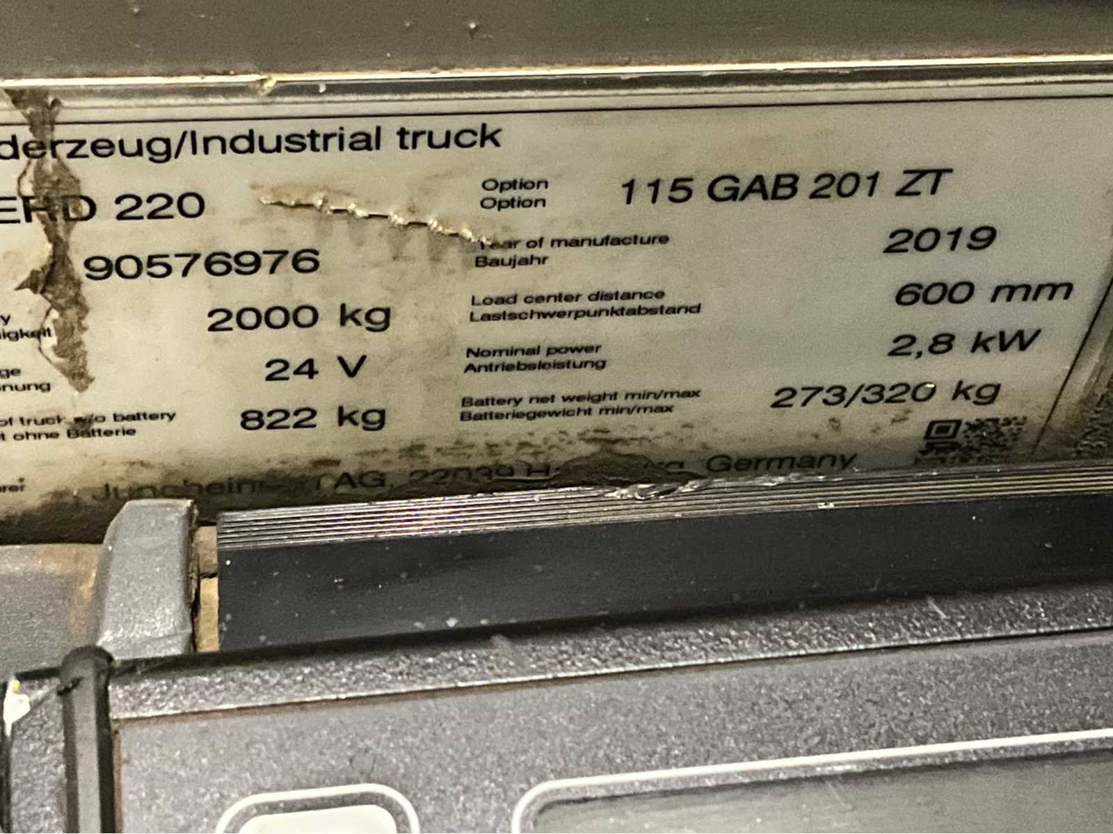 Merk: Jungheinrich Type: ERD 220 Bouwjaar: 2019 Serienummer: 90576976 Hefvermogen: 2000kg Hefhoogte: 2010mm Eigen gewicht: 1142kg Totale afmeting L: 2210mm Totale afmeting Breedte: 730mm Meerij stapelaar: true
