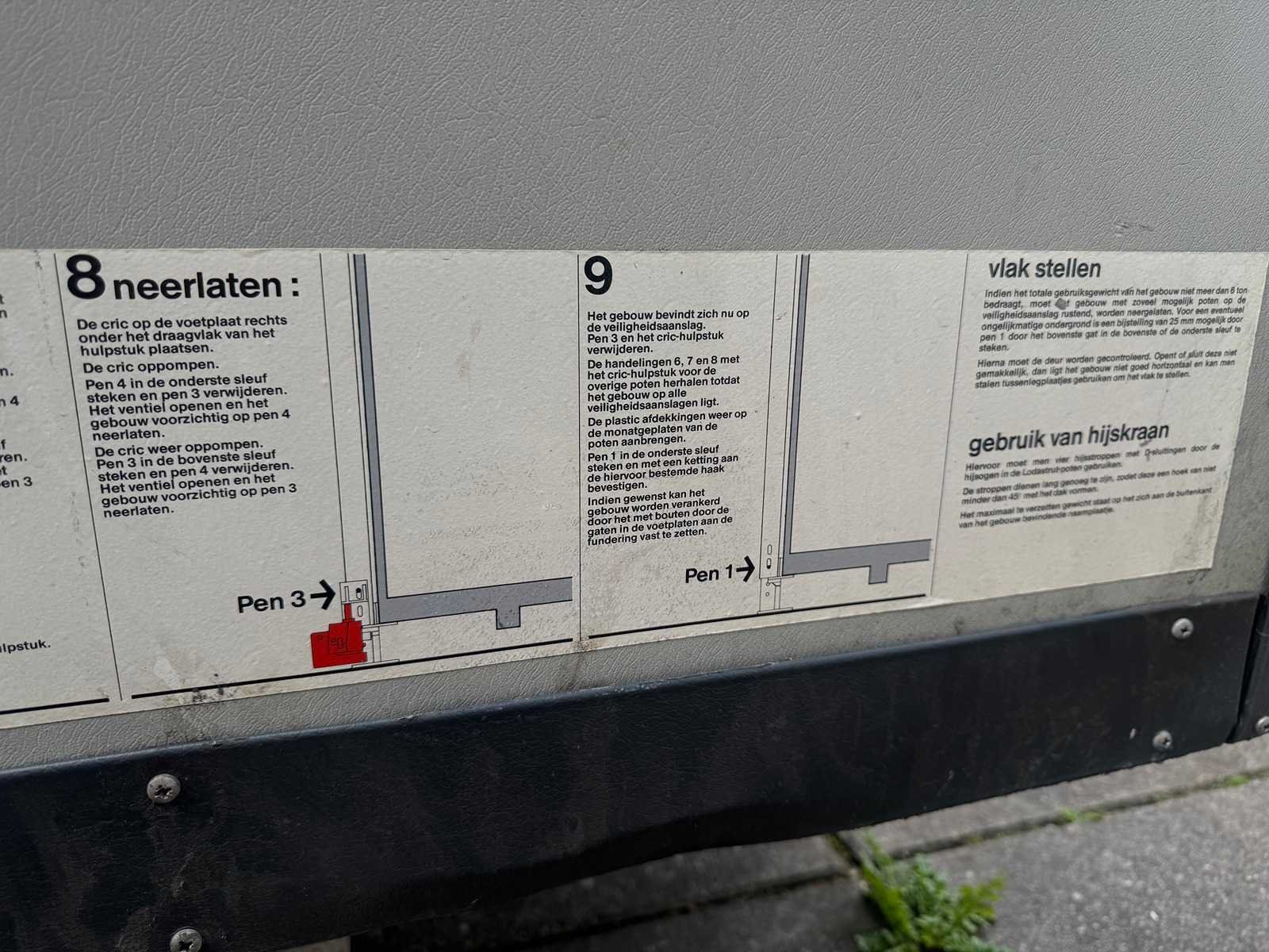Maximale hoogte met stelpoten 2850mm; v.v. verdeelkast; ramen en deuren; metalen stelpoten; gebruikt; Merk: Portakabin Type: Pacemaker Eigen gewicht: 3350kg Totale afmeting L: 12400mm Totale afmeting Breedte: 3270mm Totale afmeting Hoogte: 2640mm