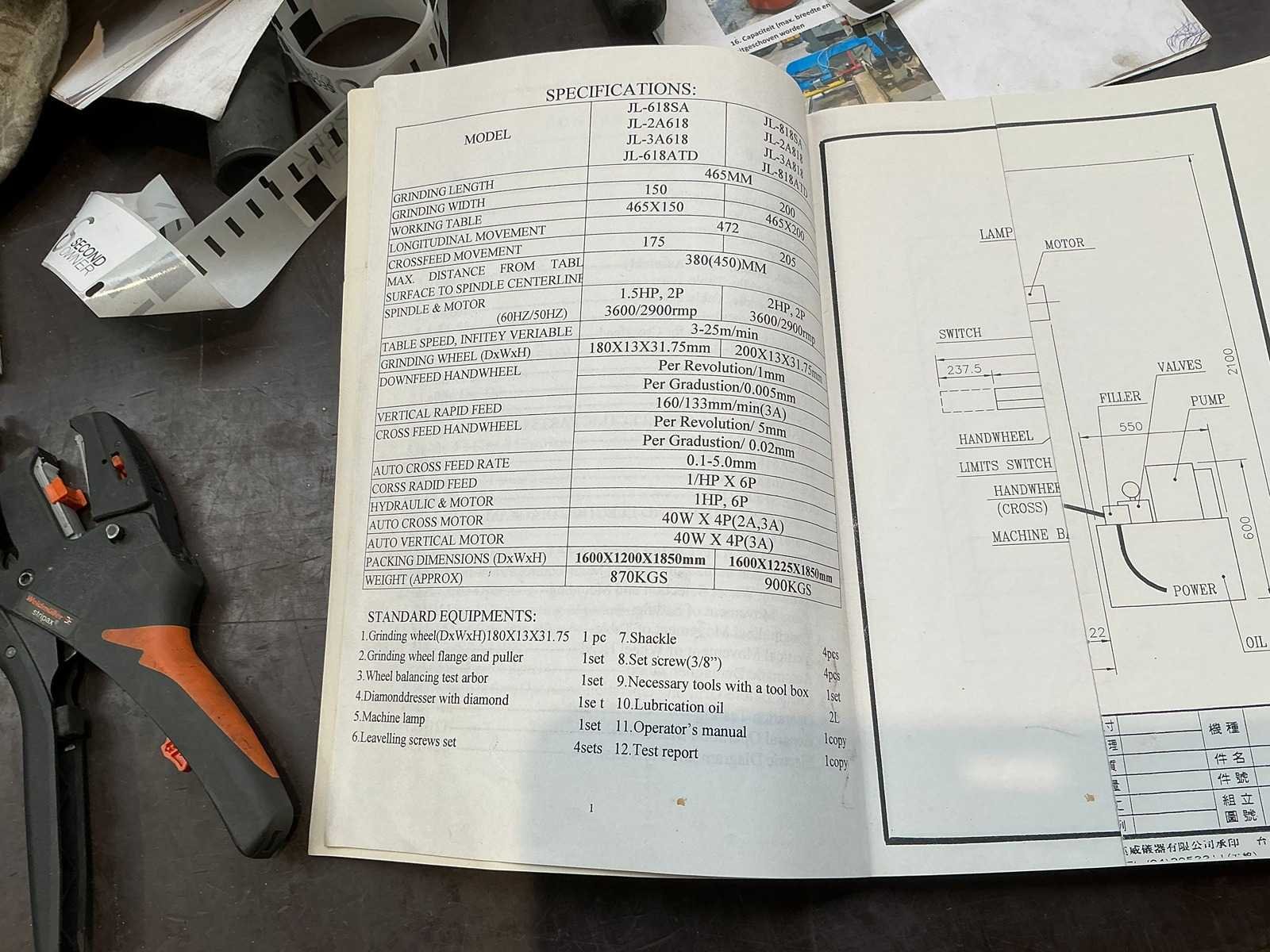 Merk: Joen Lih Type: JL-3A818 Bouwjaar: 2004 Serienummer: C30029 Tafel afmeting l: 465mm Tafel afmeting b: 200mm Afstand tafel / spil: 450mm Snelheid tot n =: 2900rpm Magnetische opspantafel afm.: 400mm Machinegewicht: 900kg Afmeting l: 1700mm Afmeting b: 1500mm Afmeting h: 2000mm GS Code: 84.601.900