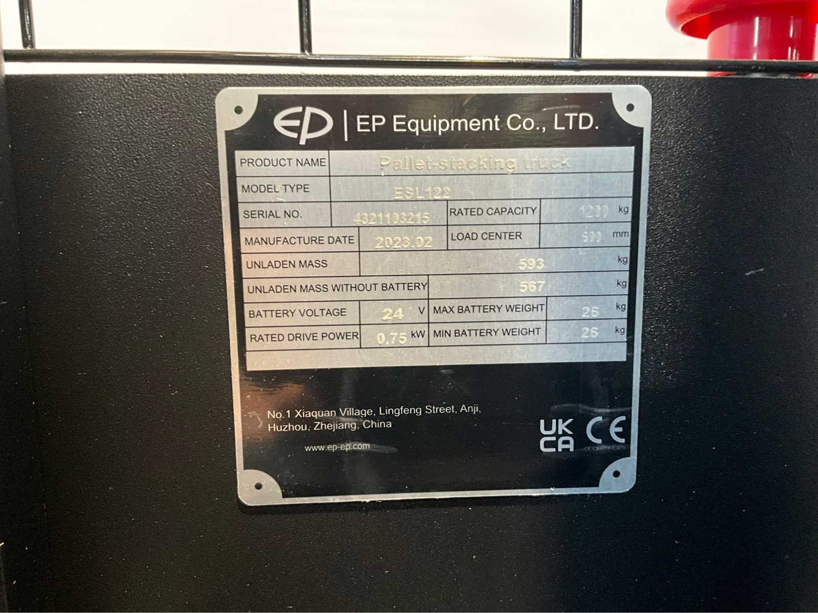 Ongebruikt , interne lader ingebouwd , Li-on accupakket Merk: Ep Type: ESL 122 3,6 Bouwjaar: 2025 Hefvermogen: 1200kg Hefhoogte: 3600mm Lepellengte: 1150mm Afgelezen urenstand: 1 Eigen gewicht: 591kg Minimale doorrijhoogte: 2390mm Totale afmeting L: 1720mm Totale afmeting Breedte: 800mm Totale afmeting Hoogte: 2390mm Accu lader: true