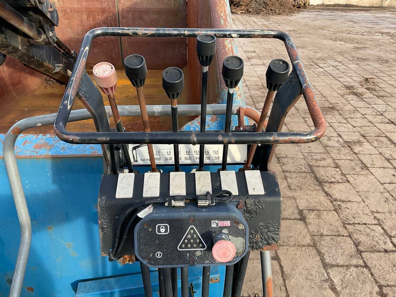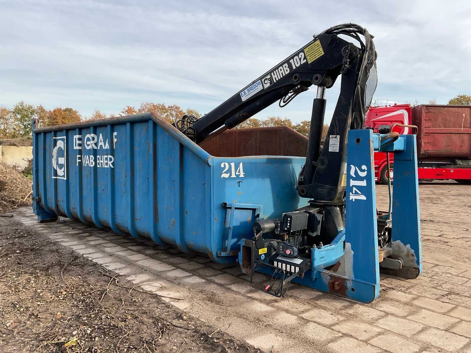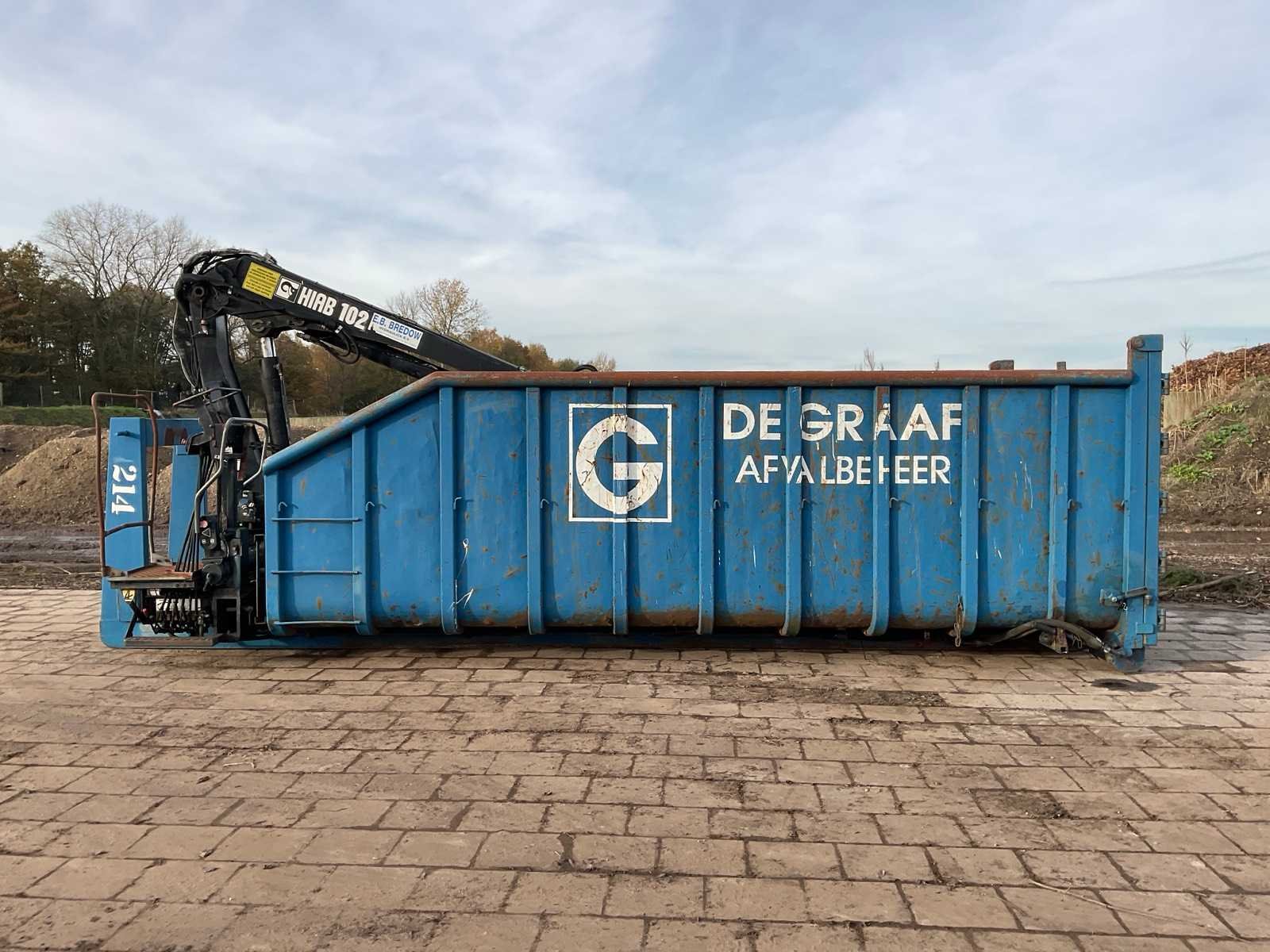 Voorzien van: Hiab 102-2 laadkraan (3900kg, 14500mm, bouwjaar 1999), 20,4 m3 container (lengte 5000mm, hoogte 1750, breedte 2400), haakarm aanspan, containerslede, Inhoud: 24 Totale afmeting L: 6300mm Totale afmeting Breedte: 2400mm Totale afmeting Hoogte: 2630mm