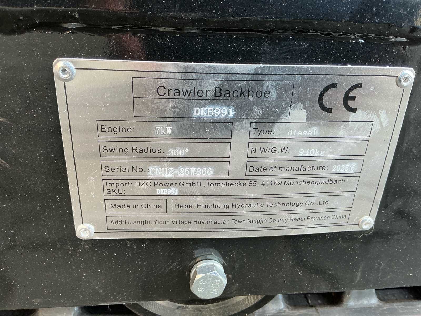 Voorzien van: Voorzien van: bakken set 1x 6100mm, 1x 200mm, hark bak, standaard bak, met snelwissel. Extra ventiel voor, uitschuifbare rubsbanden, 2 JOYSTICKS, DKB991 is een compacte rupsgraafmachine uit 2025 met een 7 kW (9,5 pk) dieselmotor, werkgewicht van 940 kg, 360° zwenkbereik, een graafdiepte van circa 1,8 meter, reikwijdte van ongeveer 2,9 meter, hydraulische systeemdruk van circa 16 MPa, rijsnelheid tot 2 km/u. NOOIT GEBRUIKT. Merk: HZC POWER Type: DKB991 Bouwjaar: 2025 Serienummer: CNHZ-25W866 Merk motor: Koop Motorvermogen (kW): 7kW Aantal cilinders: 1 Brandstof: Diesel Bedrijfsgewicht: 940kg Gieklengte: 3000mm Max. graafdiepte: 2000mm Inclusief graafbak: Set van 4 Graafbak afm. l: 400mm Graafbak afm. b: 400mm Graafbak afm. h: 300mm Rups breedte: 180mm Afgelezen urenstand: 0 Eigen gewicht: 940kg Totale afmeting L: 2500mm Totale afmeting Breedte: 940mm Totale afmeting Hoogte: 2350mm