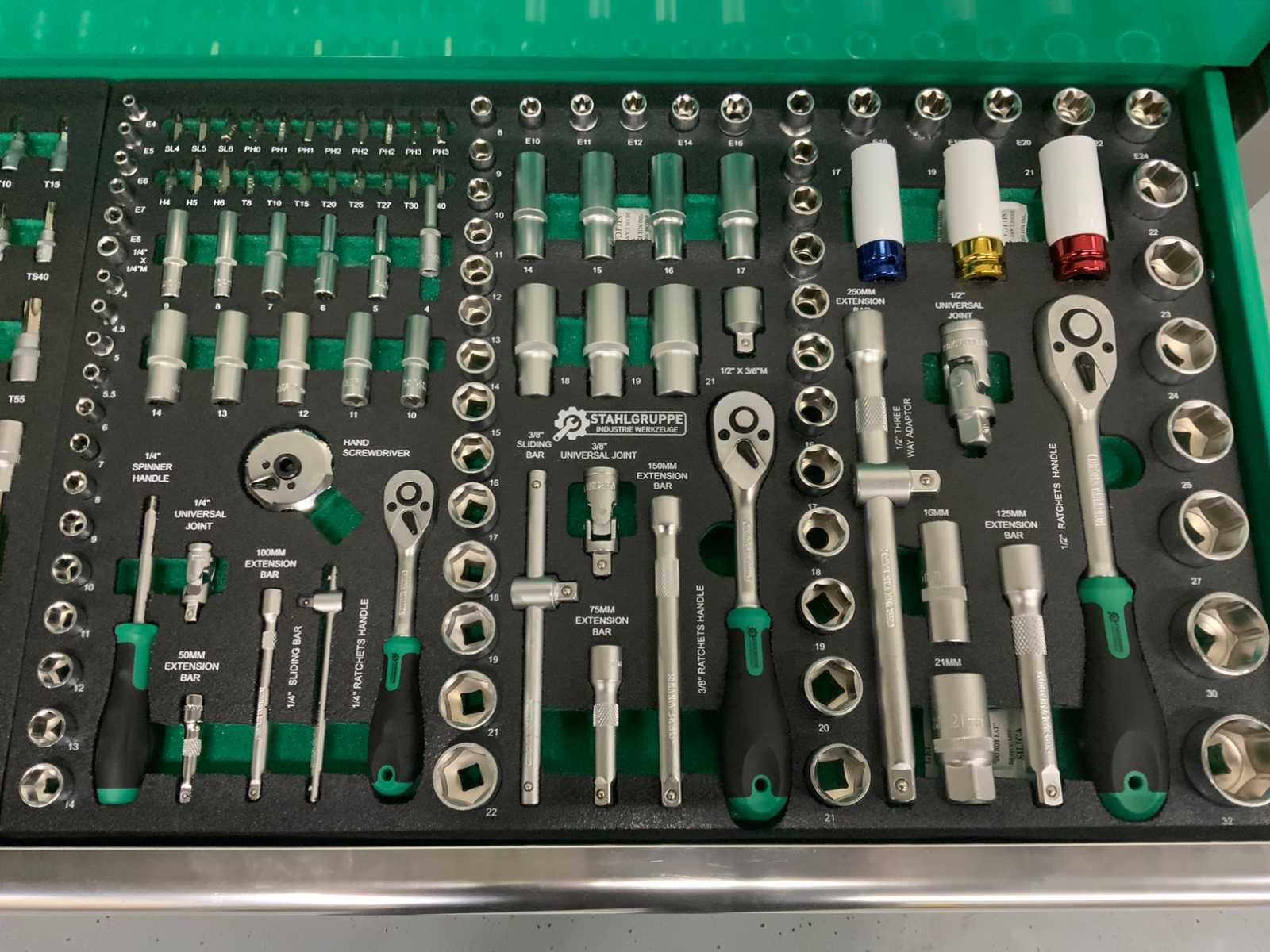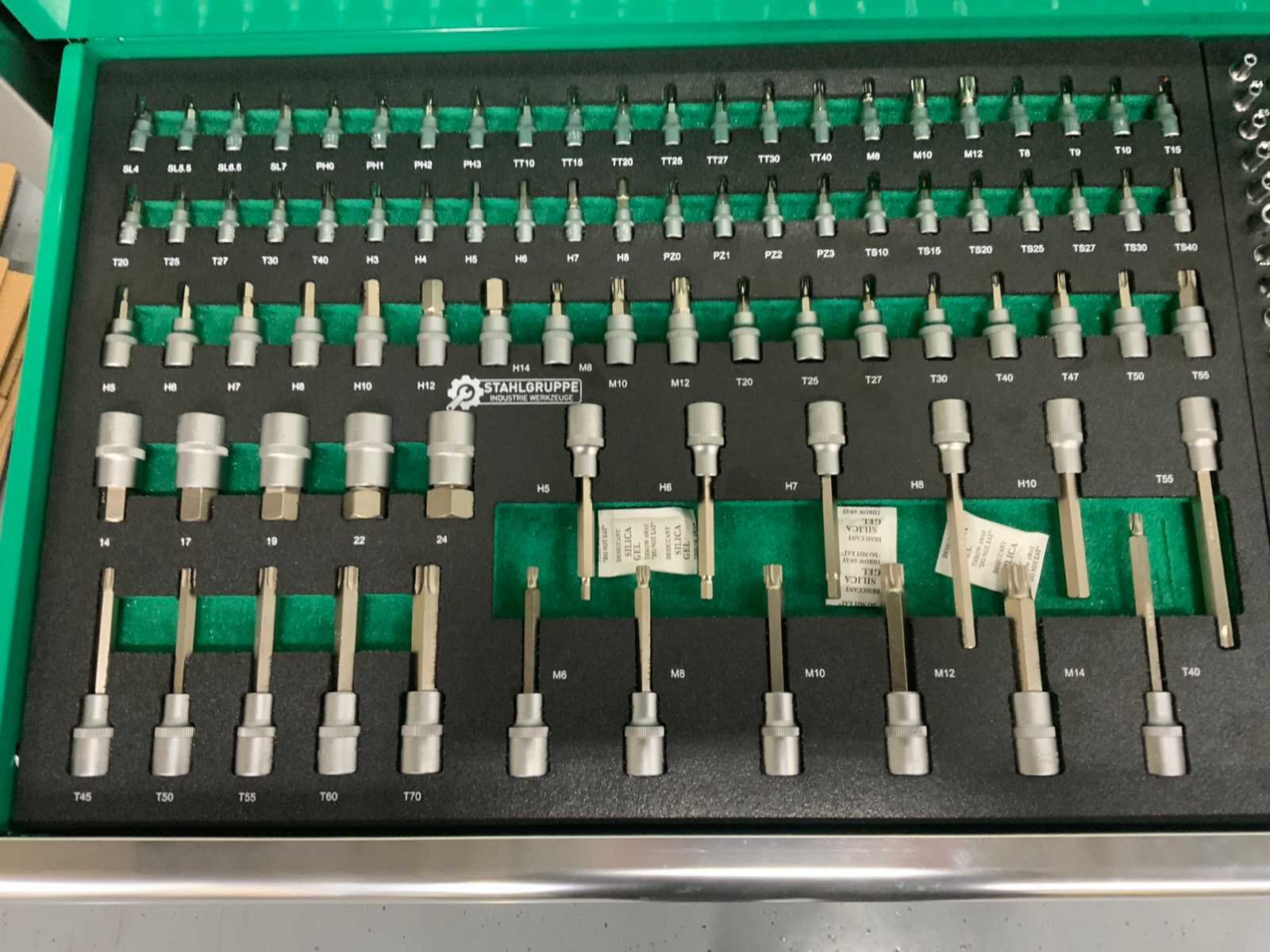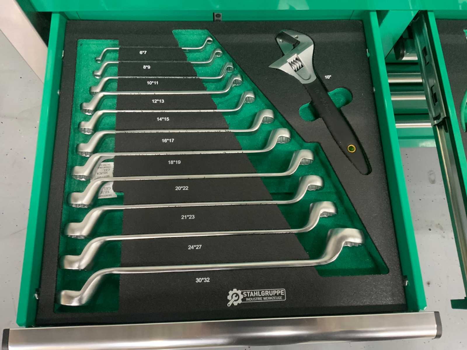 4 zwenkwielen rattelset en doppenset tot en met maat 50 386 st Heavy Duty gereedschapswagen gebruik: voor professionals aantal laden: 11 laden aantal gevulde laden: 9 gevulde laden gereedschap: chroom-vanadium gereedschap inhoud: 29-delige ring-steeksleutel set (6 mm - 50 mm) 3 ratelsleutel sets met doppen & bitsen (1/4”, 3/8” & 1/2”) 11-delige ring-ringsleutel set (6*7 mm - 30*32 mm) verstelbanre moersleutel 12-delige tangen set 2 hamers & 4 vijlen puntslag en beitel set 12 schroevendraaiers inbussleutels, Torxsleutels, precisiegereedschap 21-delige T-sleutelset 34-delige krachtdoppen set (12 mm - 50 mm) + Torx & inbus doppen & ratelsleutel 3/4,” LED-lamp, zaag, schaar, mes, meetgereedschappen enzovoort... in de originele verpakking, Ongebruikt Merk: Stahlgruppe Type: Jumbo xxl prof Bouwjaar: 2025 Aantal laden: 11 Met inhoud: true Eigen gewicht: 201kg Totale afmeting L: 1370mm Totale afmeting Breedte: 520mm Totale afmeting Hoogte: 1110mm