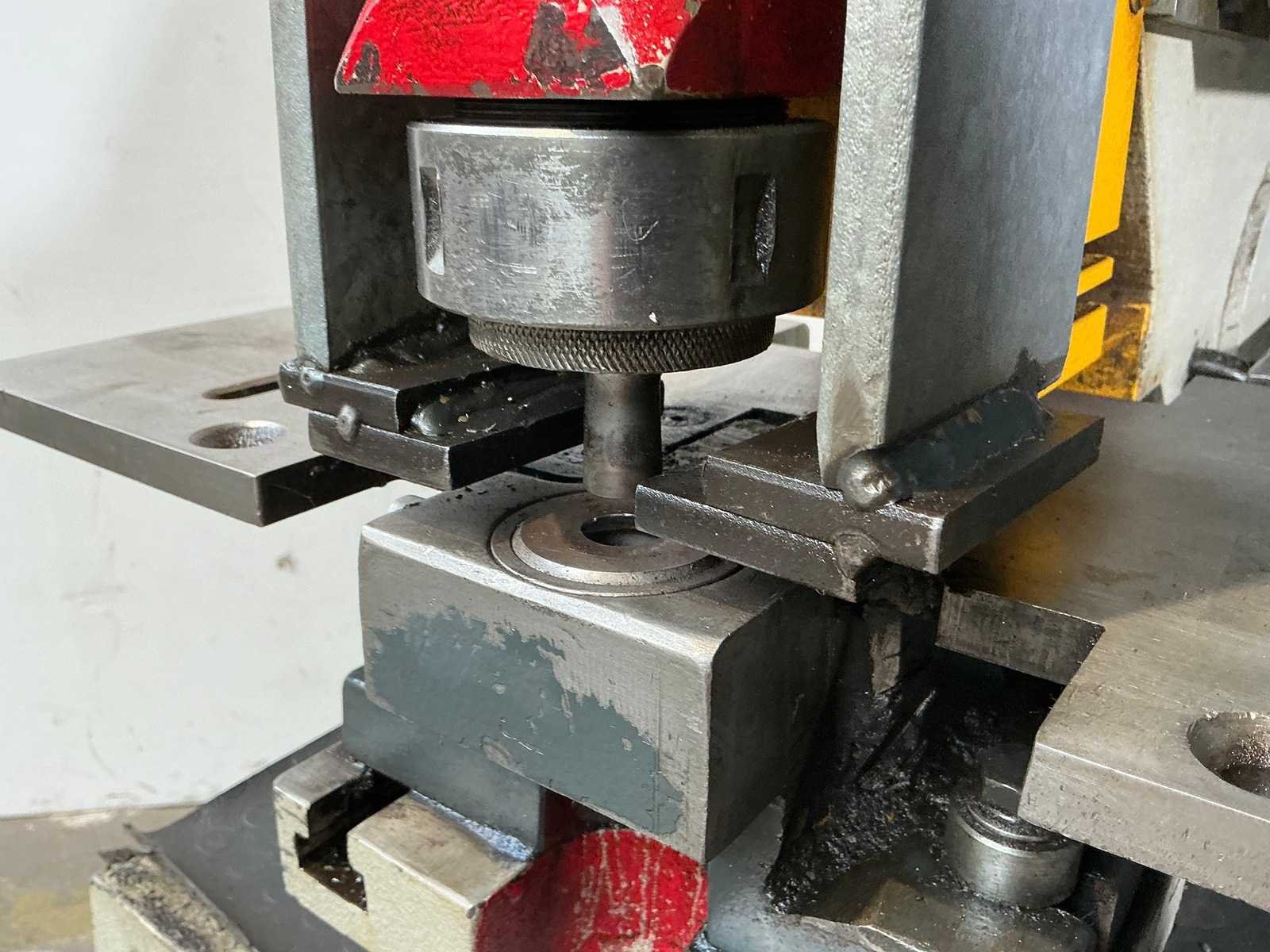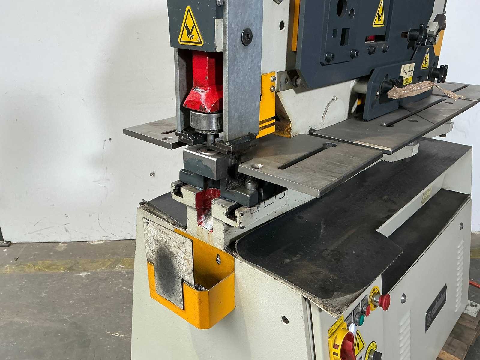 Steel round: 40mm Steel flat: 200x20mm / 300x15mm Notching + Punching + cutting Video available! Merk: Sahinler Type: HKM-60 Bouwjaar: 2017 Serienummer: 155976 Ponskracht: 60kN Voetbediening: true Motorvermogen (kW): 4kW Machinegewicht: 1400kg Afmeting l: 1500mm Afmeting b: 900mm Afmeting h: 1700mm