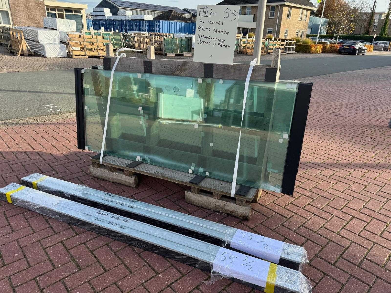4 sets van 3 schuiframen – 78 cm x 205 cm, helder glas • Afmetingen per raam: breedte 78 cm, hoogte (dagmaat) 205 cm • Maximale breedte complete set: 230 cm • Totaal: 12 ramen (4 sets van 3 stuks) • Materiaal & kleur: zwart aluminium frame, helder glas • Inclusief: 4 boven- en 4 onder-rails met 3 sporen • 4 handgrepen • Conditie: partijhandel – kan lichte strepen of vegen bevatten • Verpakking: op pallet met glas • Opmerking: foto van overkapping is ter illustratie • Heftruck is aanwezig voor het afhalen