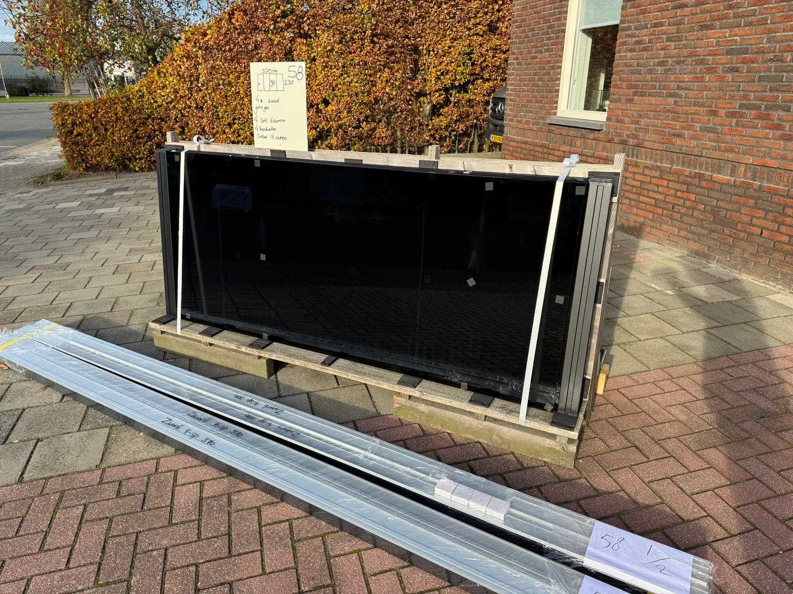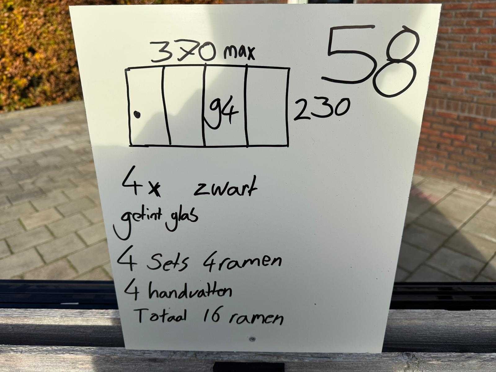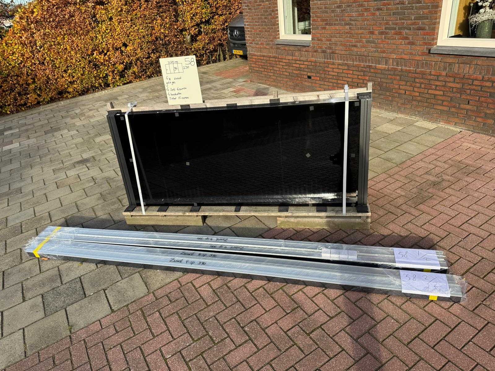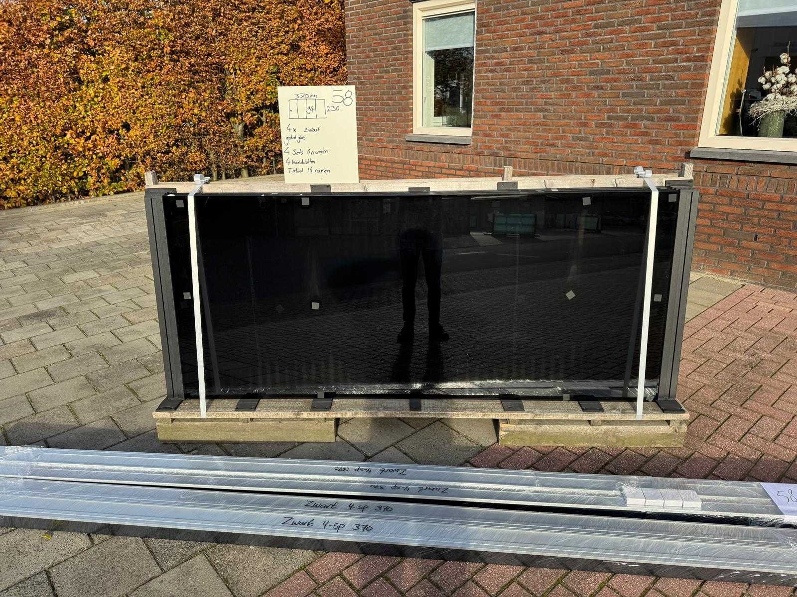 4 sets van 4 schuiframen – 94 cm x 230 cm, getint glas • Afmetingen per raam: breedte 94 cm, hoogte (dagmaat) 230 cm • Maximale breedte complete set: 370 cm • Totaal: 16 ramen (4 sets van 4 stuks) • Materiaal & kleur: zwart aluminium frame, getint glas • Inclusief: 4 boven- en 4 onder-rails met 4 sporen • 4 handgrepen • Conditie: partijhandel – kan lichte strepen of vegen bevatten • Verpakking: op pallet met glas • Opmerking: foto van overkapping is ter illustratie • Heftruck is aanwezig voor het afhalen