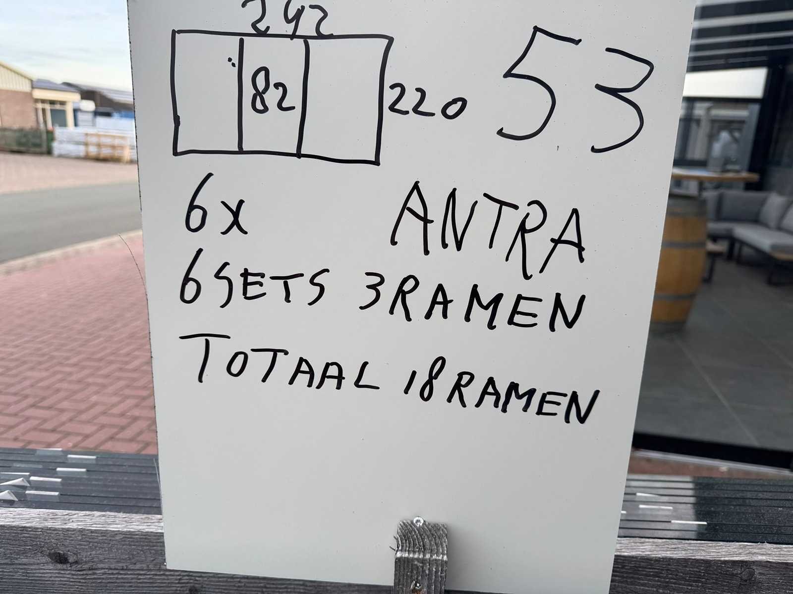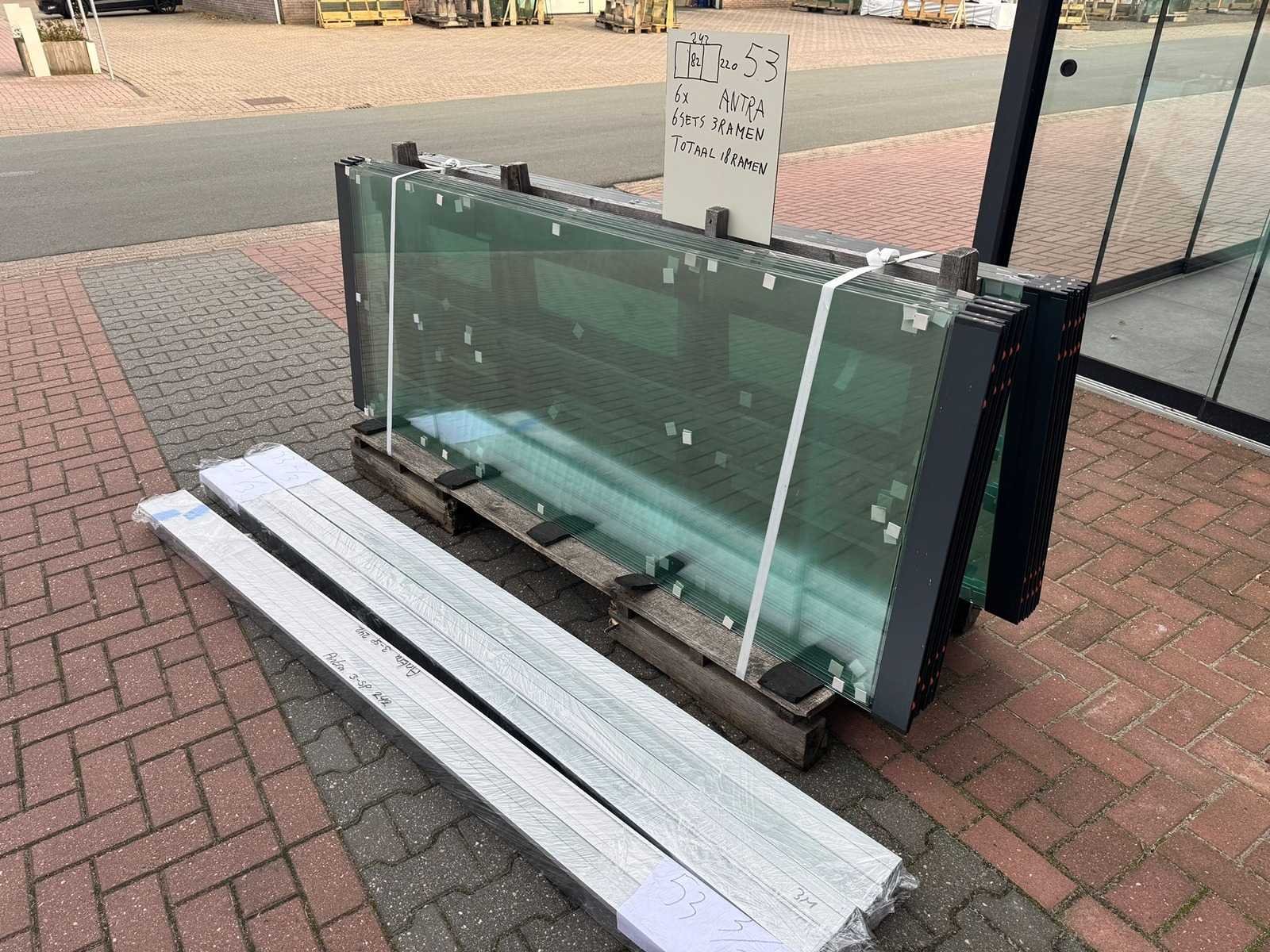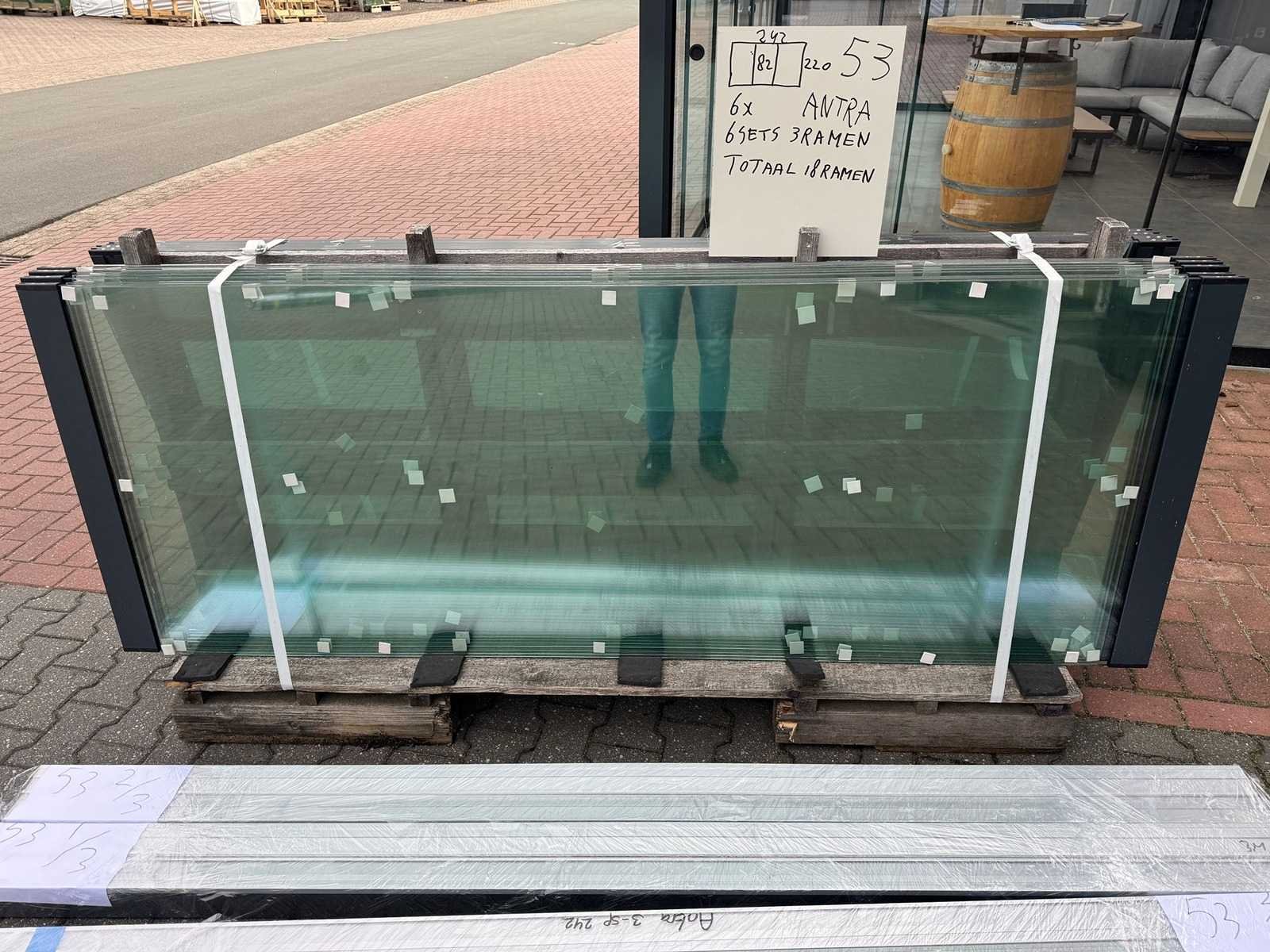 6 sets van 3 schuiframen – 82 cm x 220 cm, helder glas • Afmetingen per raam: breedte 82 cm, hoogte (dagmaat) 220 cm • Maximale breedte complete set: 242 cm • Totaal: 18 ramen (6 sets van 3 stuks) • Materiaal & kleur: antraciet aluminium frame, helder glas • Inclusief: 6 boven- en 6 onder-rails met 3 sporen • Conditie: partijhandel – kan lichte strepen of vegen bevatten • Verpakking: op pallet met glas • Opmerking: foto van overkapping is ter illustratie • Heftruck is aanwezig voor het afhalen