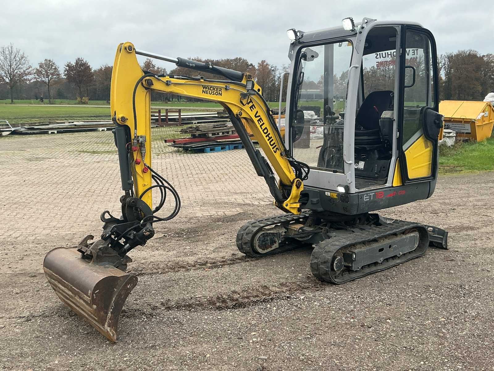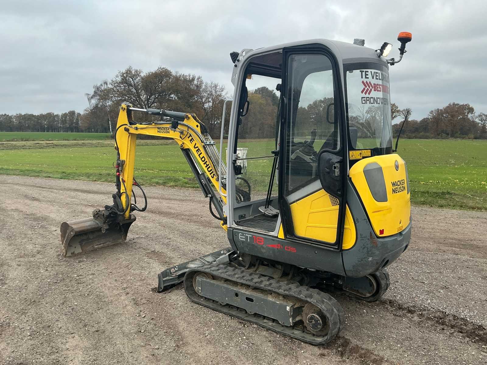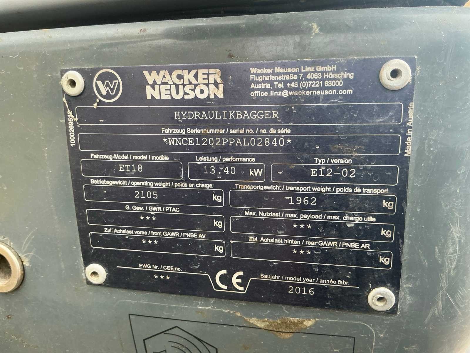 Voorzien van 5 diverse graafbakken 100, 120, 40, 2x20cm breed, rubberschuif 125cm, wortelmes. Voorzien van kantelbare cabine. Hydraulische CW05 snelwissel, kantelstuk, uitschuifbaar onderstel, VDS systeem, anti diefstal systeem met GPS (Wacker Neuson), startonderbreker. Led werkverlichting en led zwaailamp Merk: Wacker Neuson Type: ET18 Bouwjaar: 2016 Serienummer: WNCE1202PPAL02840 Merk motor: Yanmar Motorvermogen (kW): 13.4kW Aantal cilinders: 3 Brandstof: Diesel Bedrijfsgewicht: 2105kg Inclusief graafbak: Ja Rups breedte: 230mm Afgelezen urenstand: 2296 Eigen gewicht: 1962kg Totale afmeting L: 3854mm Totale afmeting Breedte: 990mm Totale afmeting Hoogte: 2290mm
