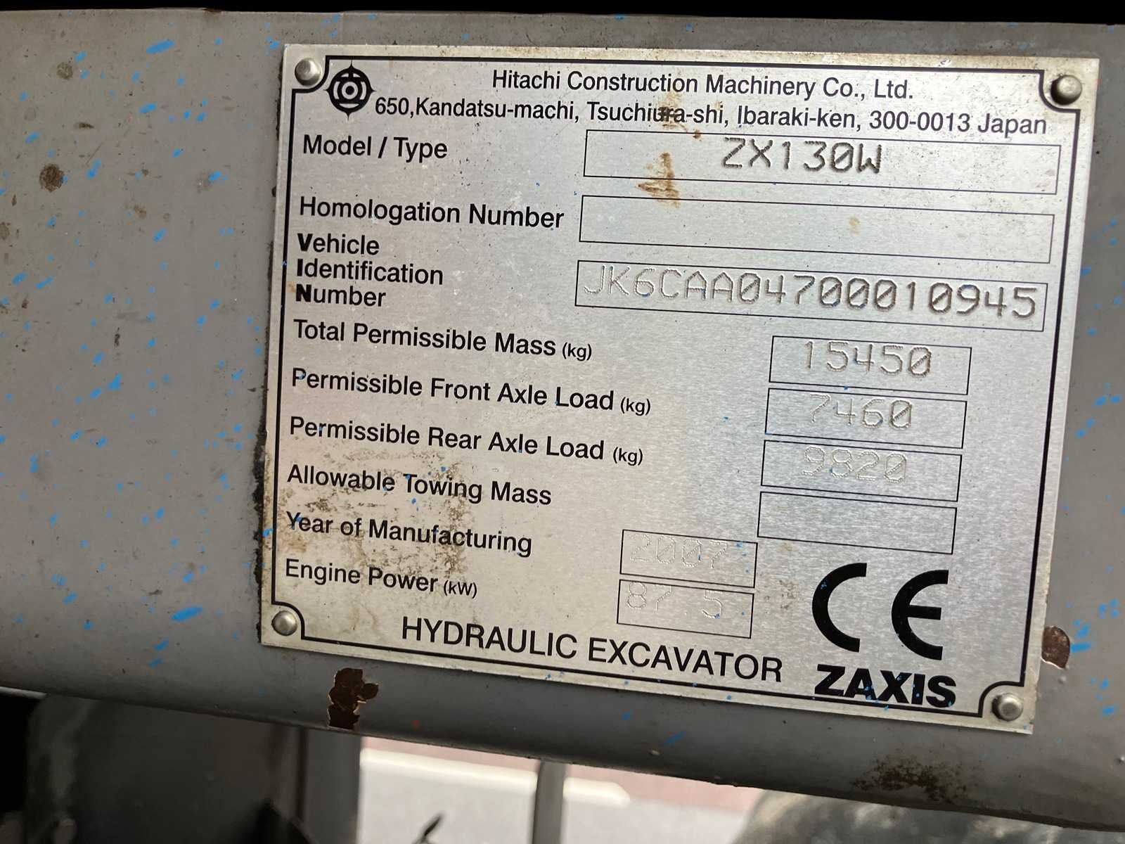 Voorzien van: De Hitachi ZX130W is een circa 15-ton zware mobiele hydraulische graafmachine uit bouwjaar 2008-2009, aangedreven door een Isuzu 4BG1T turbodieselmotor van ongeveer 90–100 kW (122–136 pk), met een maximaal toelaatbaar gewicht van 15.450 kg, een graafdiepte van circa 5 m, reikwijdte van 8,5 m, rijsnelheid tot 35 km/u, en een brandstoftank van 280 liter. Merk: Hitachi Type: ZX130W Bouwjaar: 2008 Serienummer: JK6CAA04700010945 Merk motor: Isuzu 4BG1T turbodiesel Motorvermogen (kW): 100kW Aantal cilinders: 4 Brandstof: Diesel Bedrijfsgewicht: 15000kg Gieklengte: 4600mm Max. werkbereik: 8500mm Max. graafdiepte: 5000mm Bandenmaat: 10.00-20 PR16 Cabine: true Afgelezen urenstand: 11278 Eigen gewicht: 15500kg Totale afmeting L: 8300mm Totale afmeting Breedte: 2500mm Totale afmeting Hoogte: 3160mm
