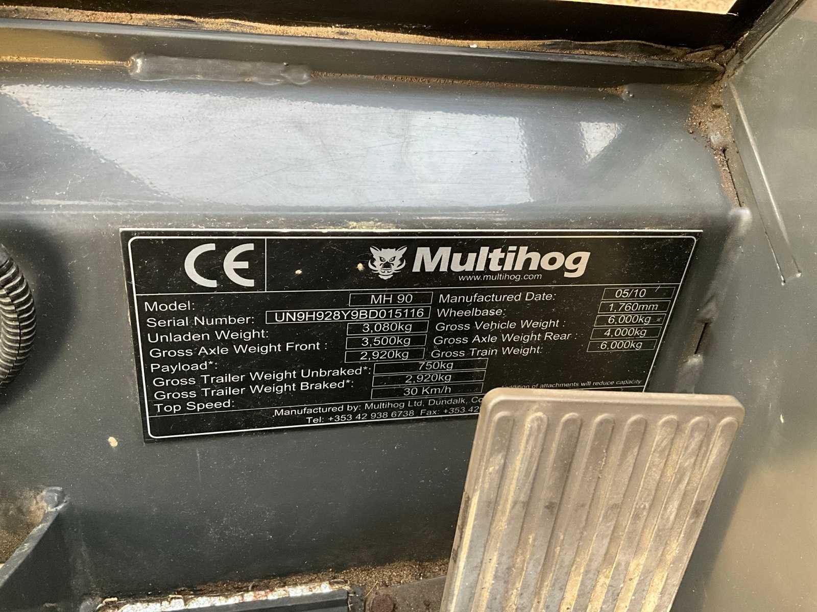 Hydrostatische aandrijving 30KM/H, knikbesturing, fronthef t.b.v. werktuigen, Yanmar 4-cilinder diesel motor, Sper, airconditioning, kachel, joystick bediening Merk: Multihog Type: MH90 Bouwjaar: 2010 Serienummer: UN9H928Y9BD015116 Kenteken: T-03-DPH Afgelezen urenstand: 1024 Versnellingsbaktype: Hydrostatisch Aantal hydraulische ventielen voor: 4 Aantal hydraulische ventielen achter: 4 Bandenmaat voor: 315/55R16 Bandenmaat achter: 315/55R16 Fronthefinrichting: true Cabine: true Luchtgeveerde stoel: true Eigen gewicht: 3080kg Totale afmeting L: 3600mm Totale afmeting Breedte: 1700mm Totale afmeting Hoogte: 2400mm Kentekenpapieren compleet?: true Datum eerste toelating: 2012-02-14 Nationaliteit documenten: Nederland