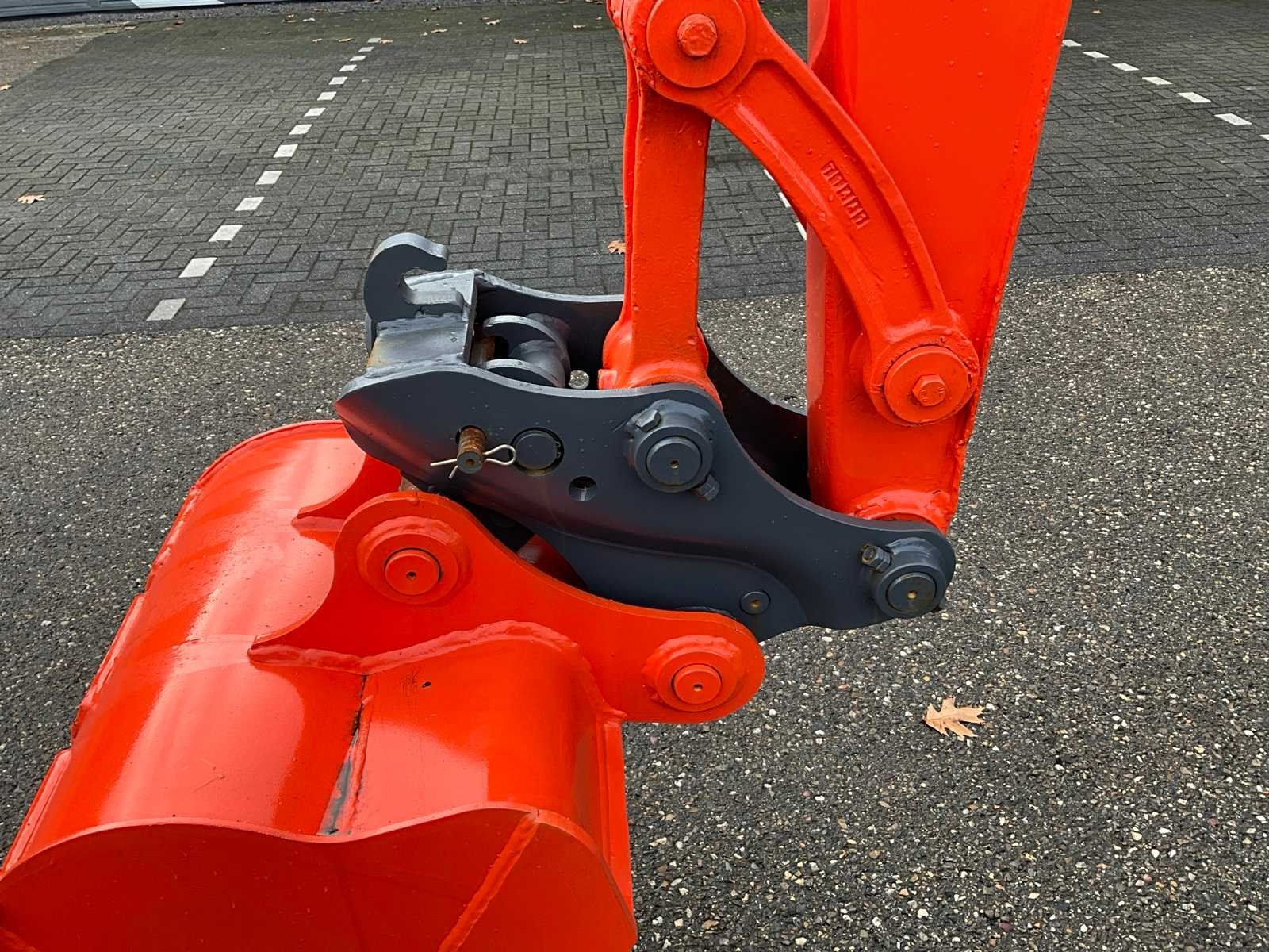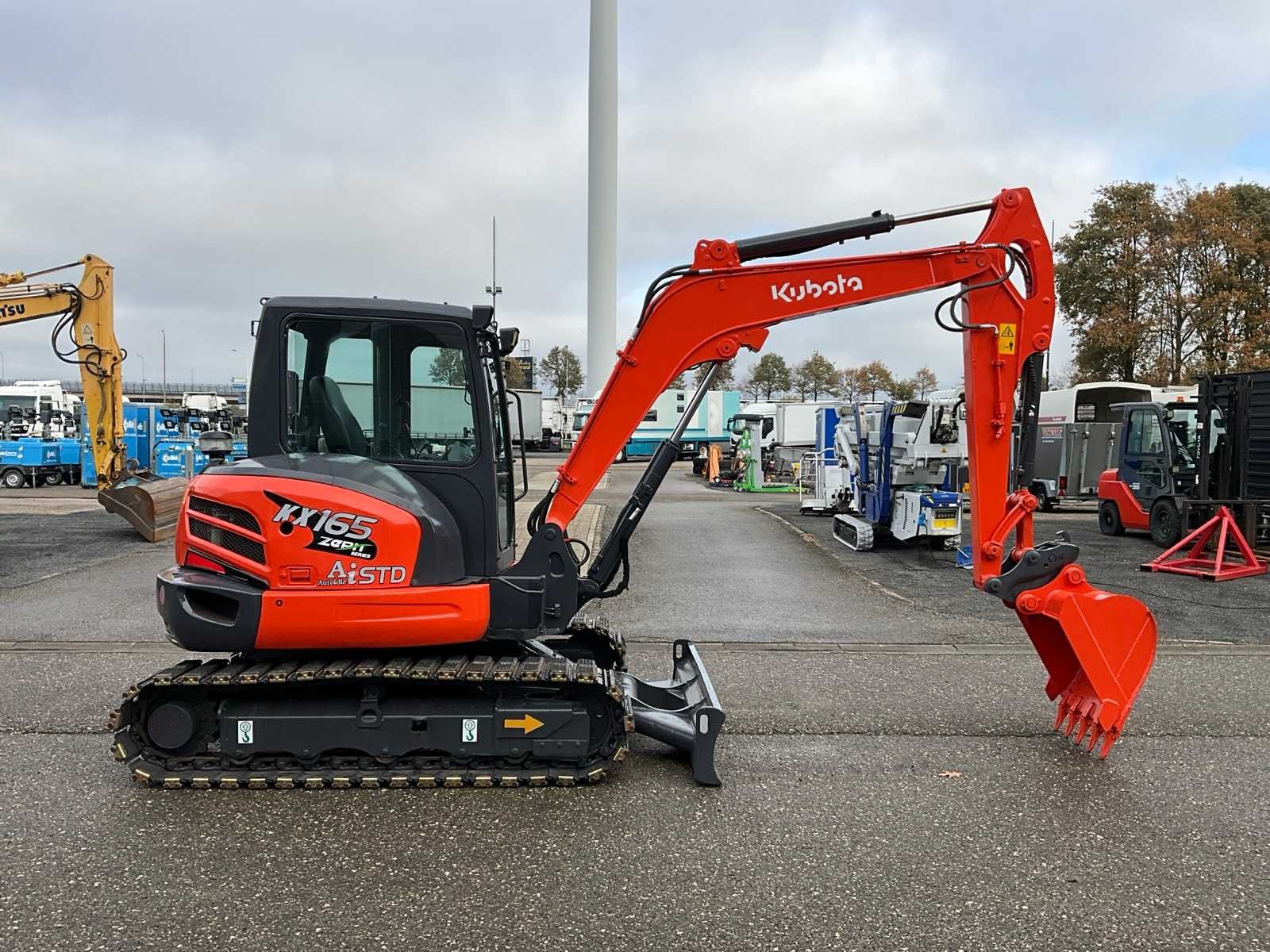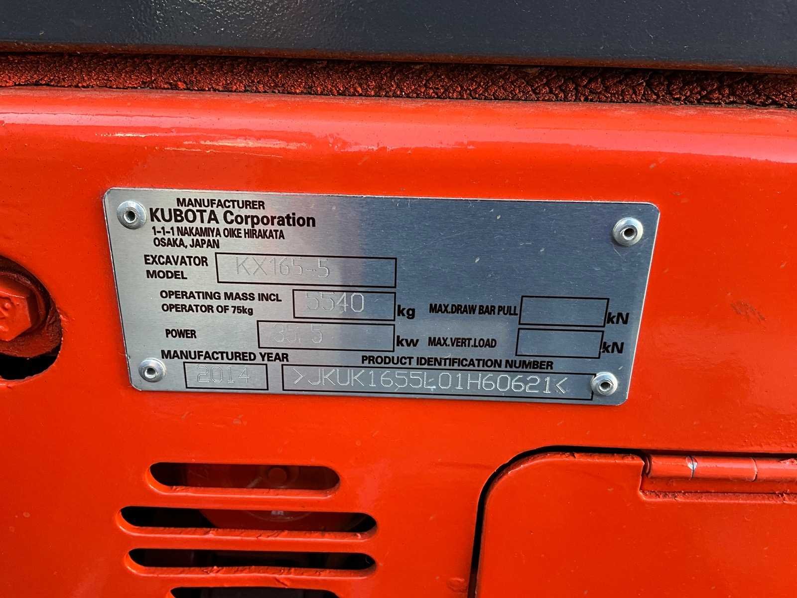 Dieplepelbak met tanden 700mm, mechanische snelwissel, extra hydraulische functie, schuifblad 1950mm, rubber pads op stalen rupsen, Auto Idle toert niet op, 2e rijsnelheid Merk: Kubota Type: KX165-5 Bouwjaar: 2014 Serienummer: 60621 Merk motor: Kubota Motorvermogen (kW): 35.5kW Aantal cilinders: 4 Brandstof: diesel Bedrijfsgewicht: 5540kg Met graafbak: true Graafbak afm. b: 700mm Rups breedte: 400mm Cabine: true Afgelezen urenstand: 4326 Totale afmeting L: 5700mm Totale afmeting Breedte: 2000mm Totale afmeting Hoogte: 2600mm