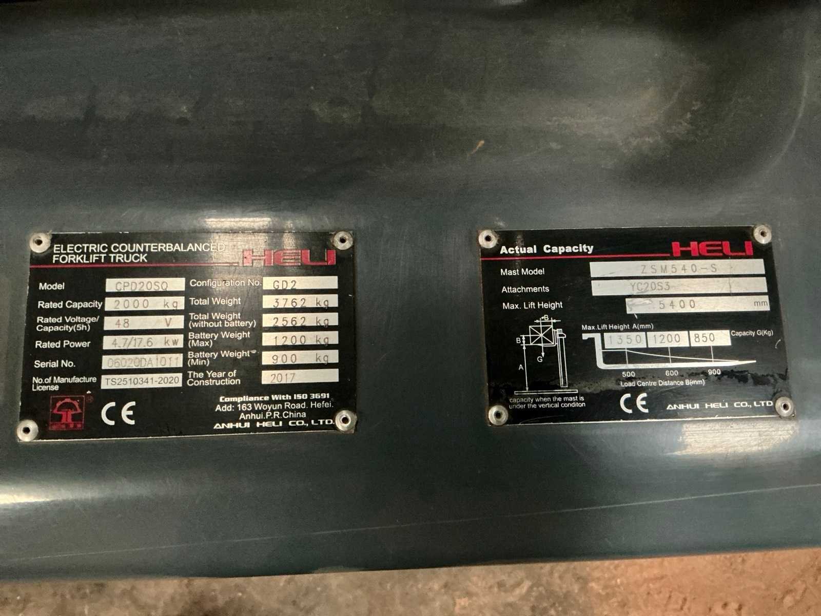 Voorzien van: HELI CPD20SSQ, elektrisch, hefvermogen: 2000Kg, volrubber banden, nieuwe accu's 2025, accu lader, defect rijmotoren, urenstand onbekend. Merk: Heli Type: CPD20SQ Bouwjaar: 2012 Serienummer: 06020DA1011 Brandstof: Elektrisch Soort band: Volrubber banden Aantal wielen: 4 Accu lader: true Side-shift: true Duplex mast: true Eigen gewicht: 2562kg Lepellengte: 1200mm Vol rubber banden: true Minimale doorrijhoogte: 2400mm Totale afmeting L: 3400mm Totale afmeting Breedte: 1100mm Totale afmeting Hoogte: 2400mm