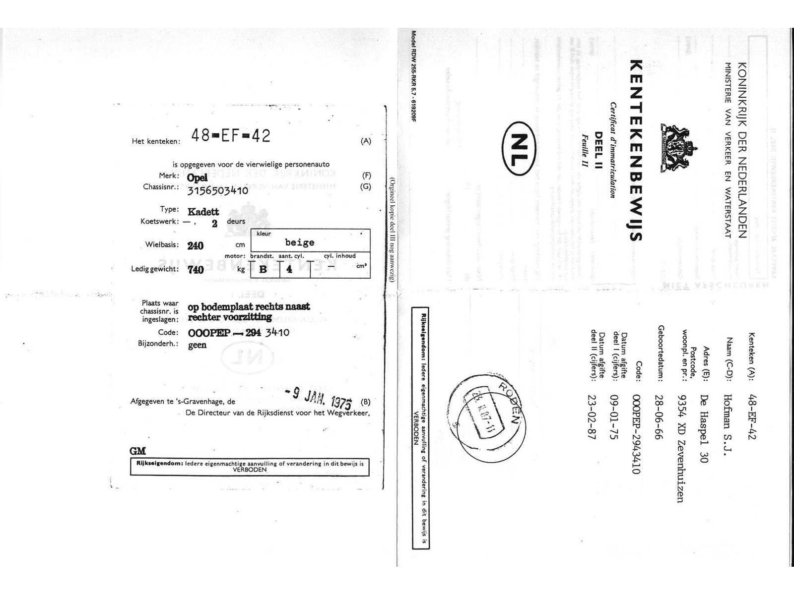 Let op!: Voor Nederlandse kopers zal het kenteken moeten worden geheractiveerd bij het RDW; Voor buitenlandse kopers is er enkel een digitaal kopie van de oude documenten beschikbaar Kenteken: 48-EF-42 Merk: Opel Type: 1.1 Standard Bouwjaar: 1975 Chassisnummer: 3156503410 Afgelezen kilometerstand: 57544 Model: Kadett Brandstof: benzine Datum eerste toelating: 1975-01-09 Datum eerste toelating (NL): 1975-01-09 APK vervaldatum: 1977-01-09 Carrosserie: onbekend Transmissie: Handgeschakeld Vermogen (pk): 0 Aantal deuren: 2 Aantal zitplaatsen: 5 Kleur: beige Cilinderinhoud: 0 Aantal cilinders: 4 Ledig gewicht: 740