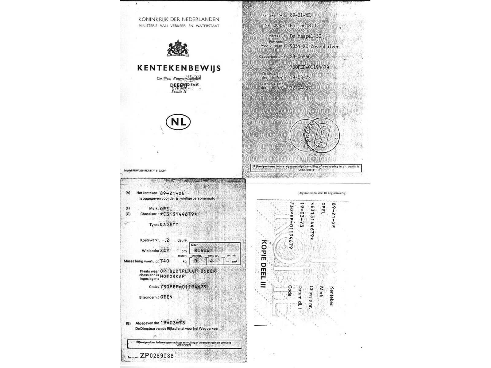 Let op!: Voor Nederlandse kopers zal het kenteken moeten worden geheractiveerd bij het RDW; Voor buitenlandse kopers is er enkel een digitaal kopie van de oude documenten beschikbaar Kenteken: 89-21-XE Merk: Opel Type: Kadett Bouwjaar: 1973 Chassisnummer: E313144679 Brandstof: Benzine Vermogen (pk): 0 Aantal deuren: 2 Aantal zitplaatsen: 5 Kleur: Blauw Aantal cilinders: 4 Ledig gewicht: 740