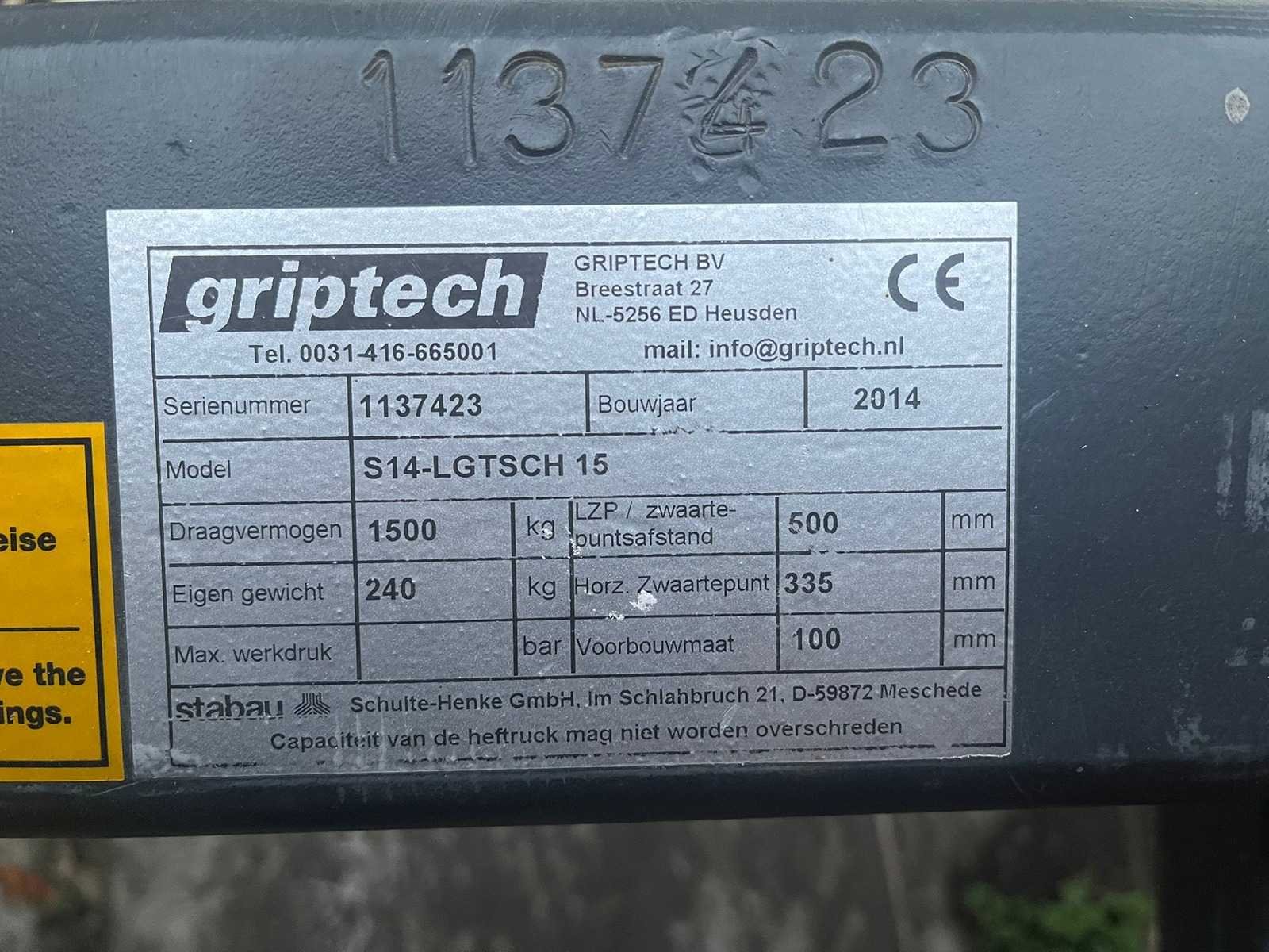 Lepellengte 1200mm; Merk: Griptech Type: S14-LGTSCH 15 Bouwjaar: 2014 Serienummer: 1137423 Eigen gewicht: 240kg Totale afmeting Breedte: 3000mm