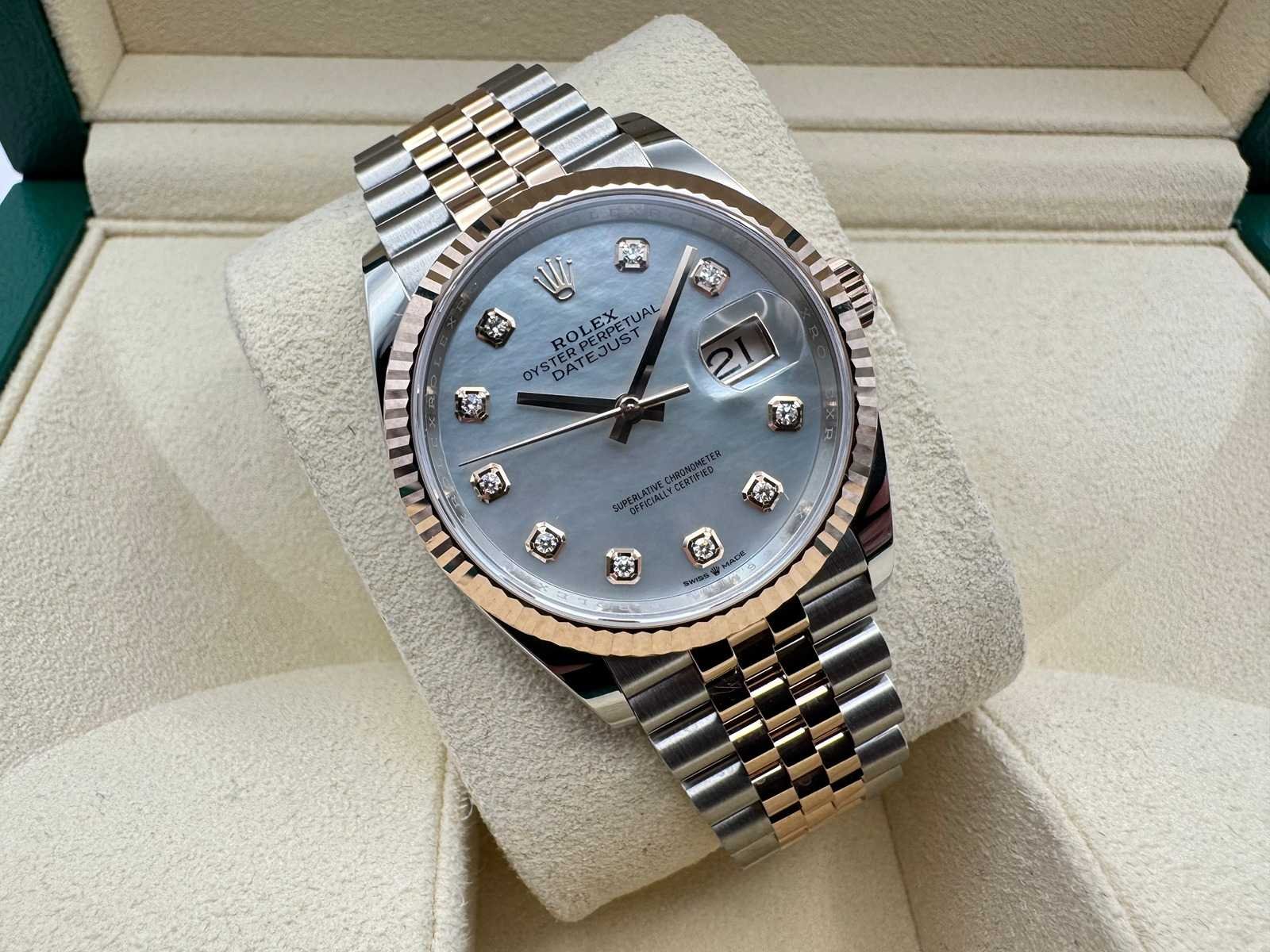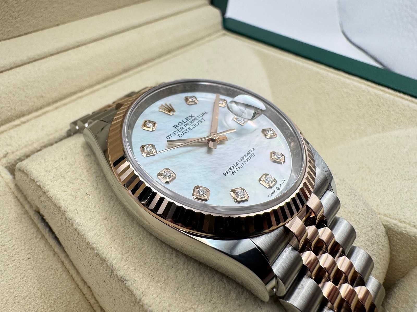 Brand new & unworn Rolex guarantee card Original box Booklets & wallet Rolex tag Full 5-year international Rolex warranty Specifications: Model: Rolex Datejust 36 Reference: 126231 Material: Stainless steel & 18k rose gold Dial: White Mother of Pearl with diamond hour markers Bracelet: Jubilee Bezel: Fluted Condition: Brand new, full set Merk: Rolex Model: Datejust 36 Bouwjaar: 2025 Referentienummer: 126231 Materiaal kast: Steel Materiaal horlogeband: Steel/Rose Gold Jubilee Materiaal sluiting: Steel/Rose Gold Wijzerplaat: Mother Of Pearl Diamonds Kastmaat: 36 mm