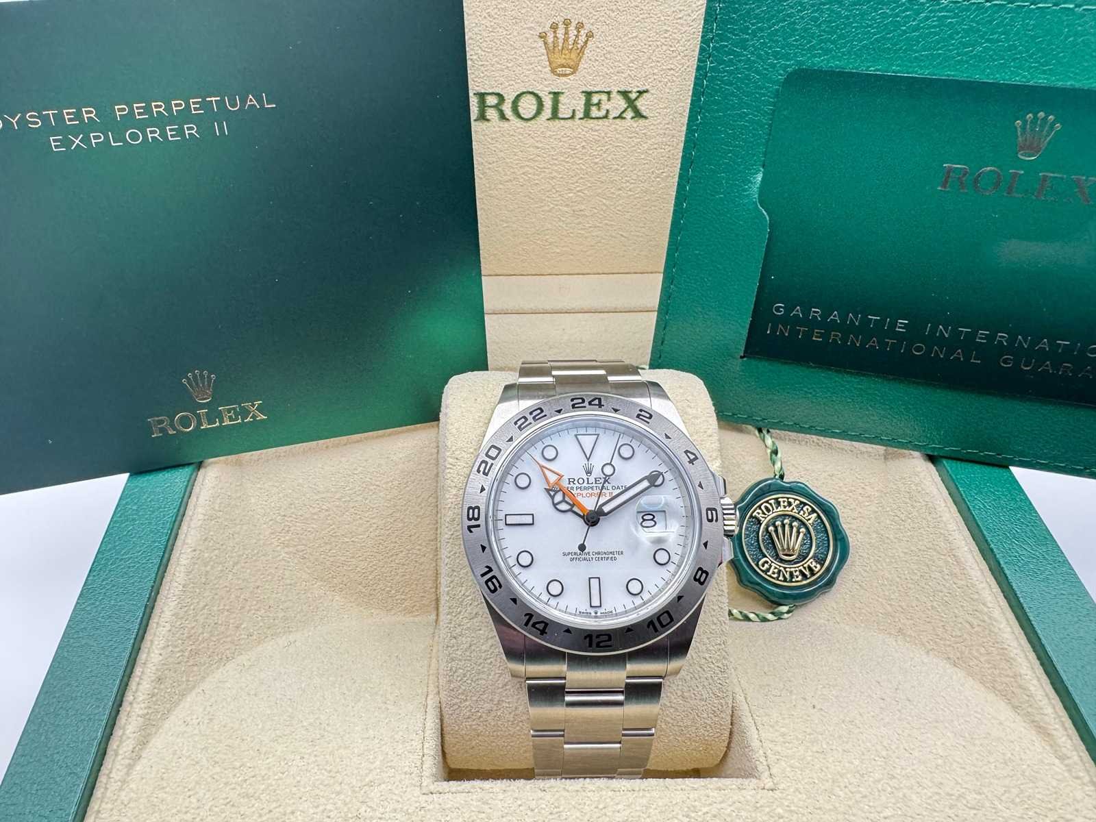 Key Features: Model: Rolex Explorer II Ref. 226570 Condition: Brand new, unworn Material: Stainless steel Dial: White ("Polar") Bezel: Fixed 24-hour stainless steel bezel Movement: Automatic, dual time zone (GMT function) Bracelet: Oyster International warranty: 5 years remaining Full set: Includes box, papers, warranty card, and Rolex tag Merk: Rolex Model: Explorer Bouwjaar: 2025 Referentienummer: 226570 Kastmaat: 42 mm