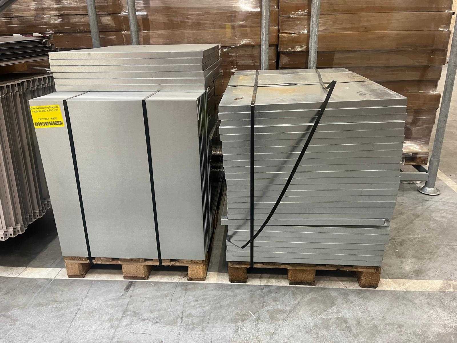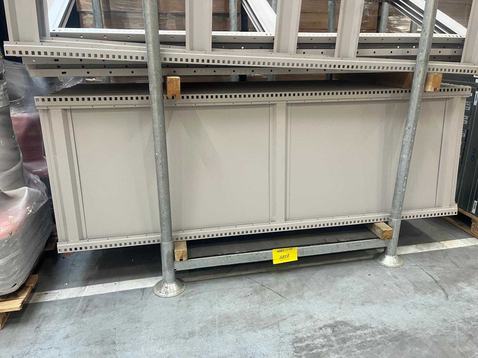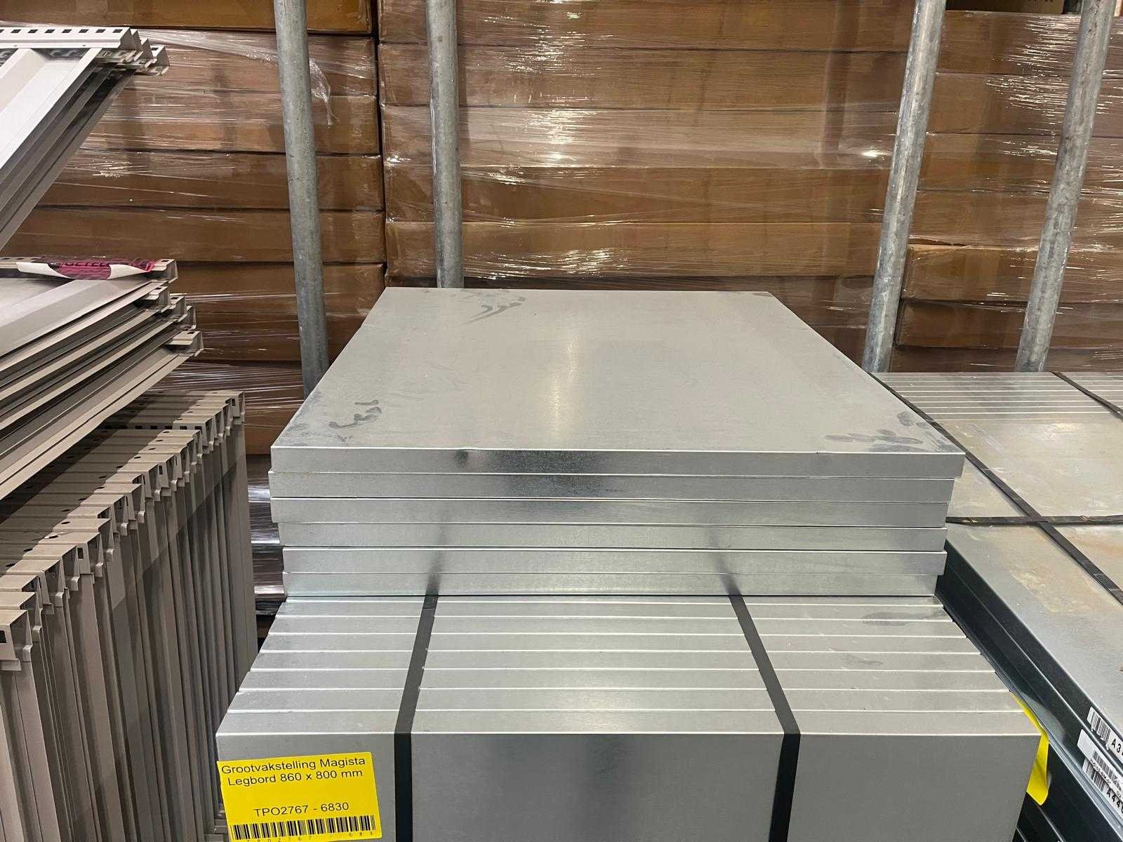 Let op zonder clips; Merk: Magista Aantal secties: 49 Sectie afm. b: 860mm Sectie diepte: 800mm Sectie afm. h: 2400mm Aantal staanders: 50 Aantal legborden: 136