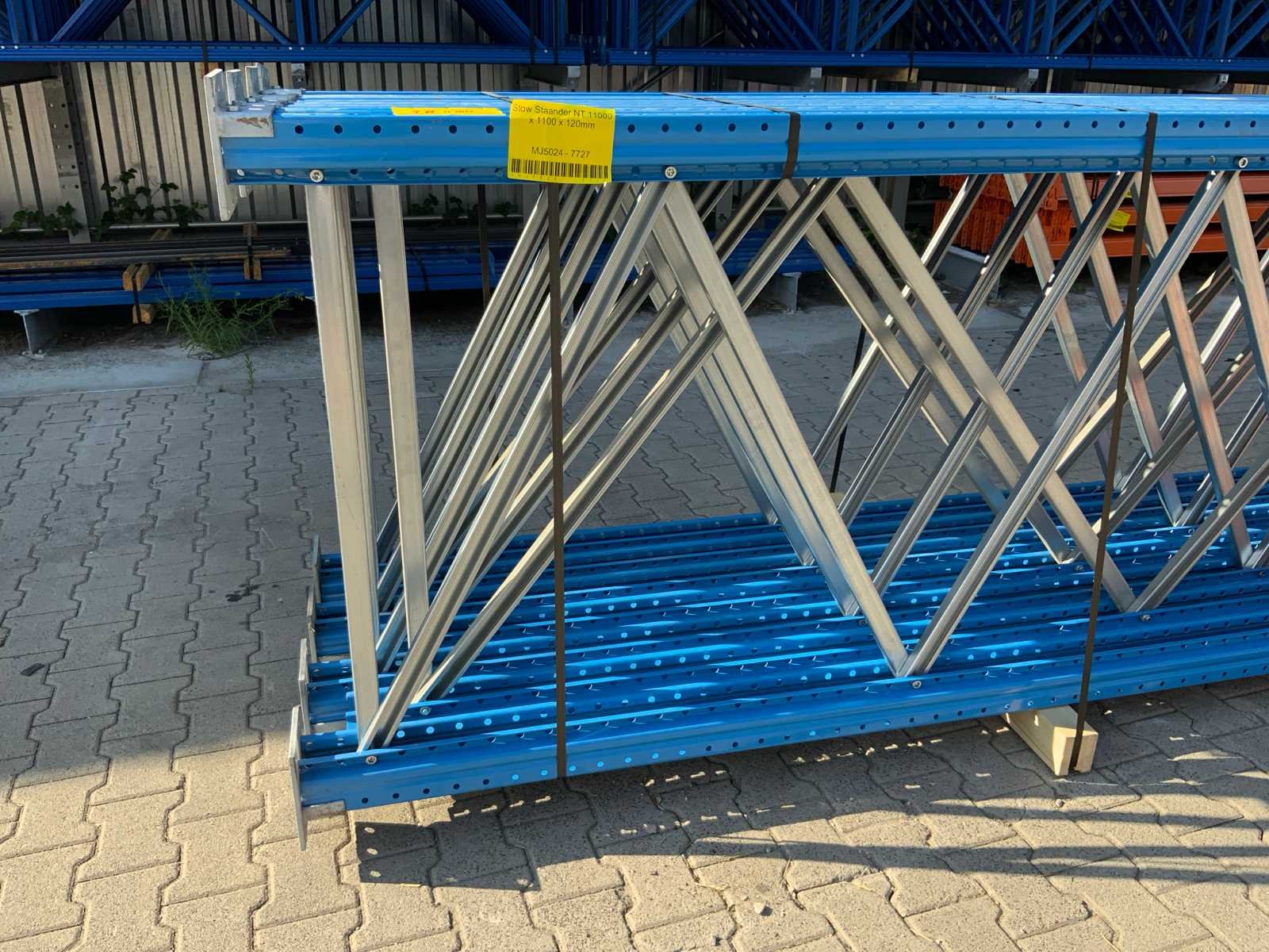 Staanders zijn 11000x1100x120mm; liggers zijn 3600x100x50mm; Merk: Stow Type: NT Aantal secties: 6 Sectie afm. b: 3600mm Sectie diepte: 1100mm Sectie afm. h: 11000mm Aantal staanders: 7 Aantal liggers: 62 Demontabel: true