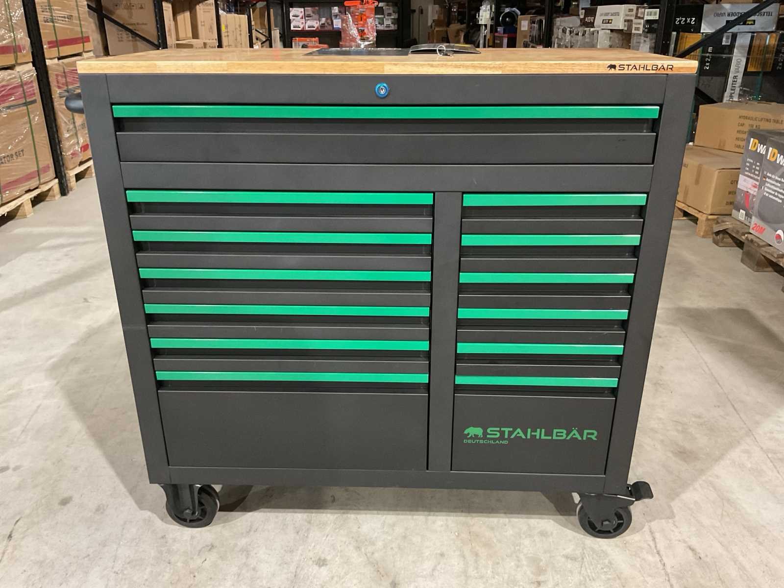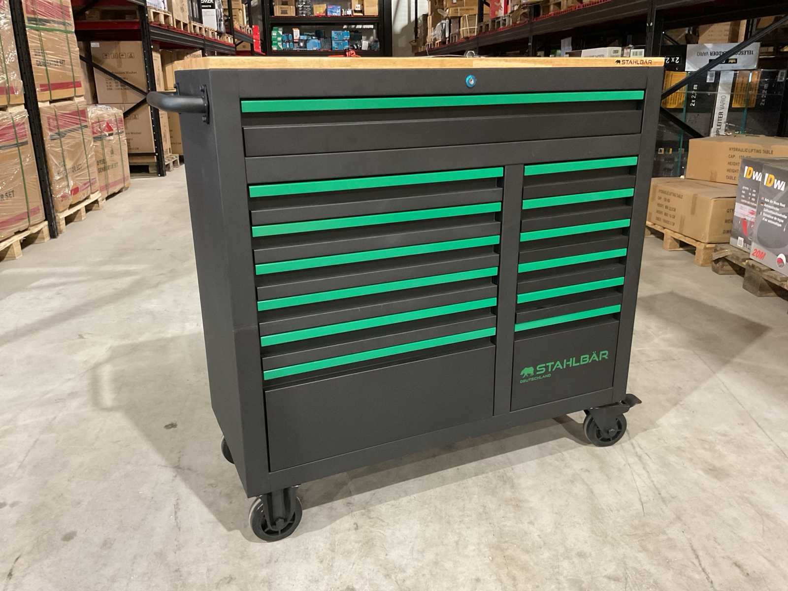 Voorzien van 13 lades waarvan 10 gevuld met gereedschap; professioneel chroom-vanadium gereedschap; heavy duty gereedschapswagen; houten werkblad; 4 wielen; stevig handvat; ongebruikt in doos (transport afmetingen 115x50x100 cm) Merk: Stahlbär Type: Deutschland Bouwjaar: 2025 Aantal laden: 13 Met inhoud: true Eigen gewicht: 134kg Totale afmeting L: 1150mm Totale afmeting Breedte: 500mm Totale afmeting Hoogte: 1000mm
