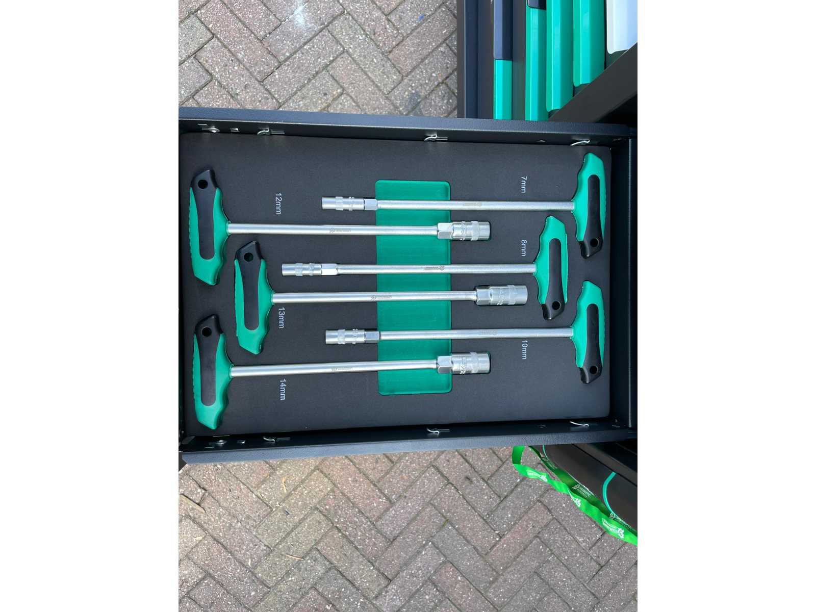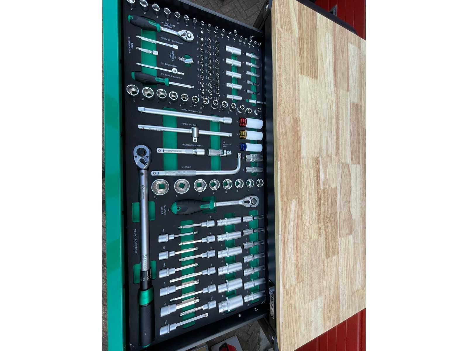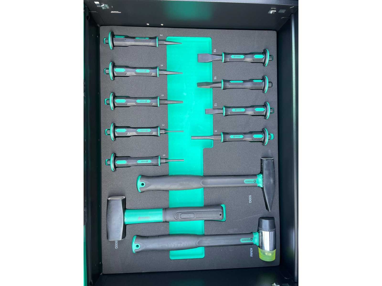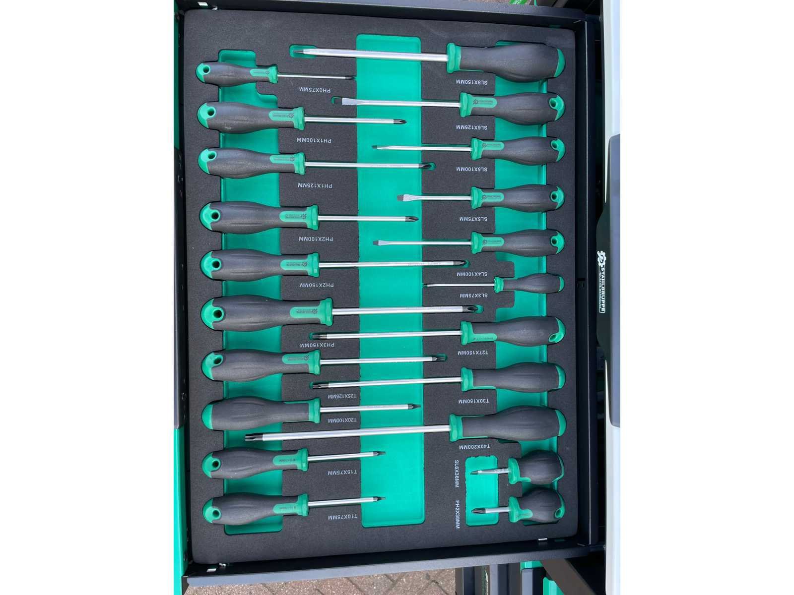 Voorzien van 11 gevulde laden; Gereedschap: chrome vanadium; Inhoud: 2 dopsleutel sets, momentsleutel, ringsteeksleutel set 6-32, ringratelsleutel 8-19, inbussleutel set, ringsleutel set 6-32, torx sleutel set T8-T70, schroevendraaier set (21 stuks), tangen set (9 stuks), beitel en doorslagen set (18 stuks), vijlen set (5 stuks), T-greep dopsleutel set 6-14, T-greep torx sleuel set T15-T45, hamers (3 stuks), VDE gereedschap (3 tangen en 7 schroevendraaiers), kabelschoentang set, enzovoort; Ongebruikt in doos Merk: Stahlgruppe Type: Jumbo GR Bouwjaar: 2024 Aantal laden: 13 Met inhoud: true Eigen gewicht: 138kg Totale afmeting L: 1100mm Totale afmeting Breedte: 620mm Totale afmeting Hoogte: 1120mm