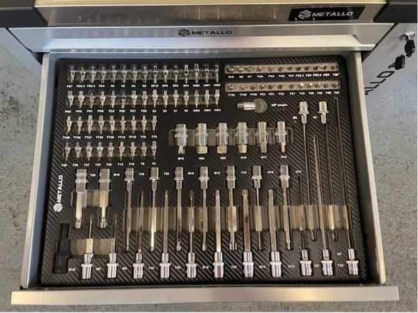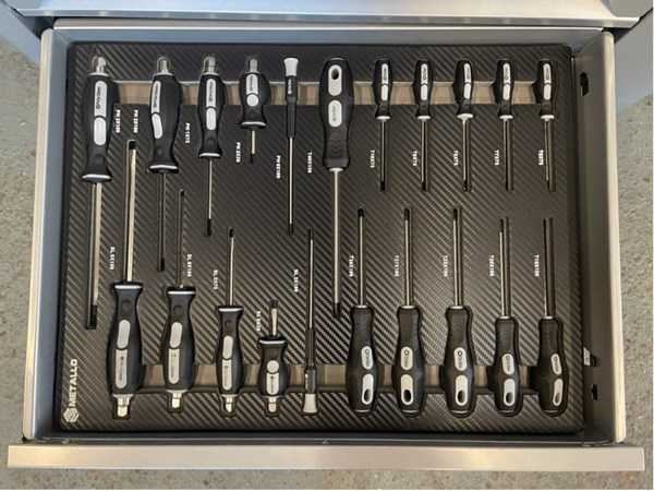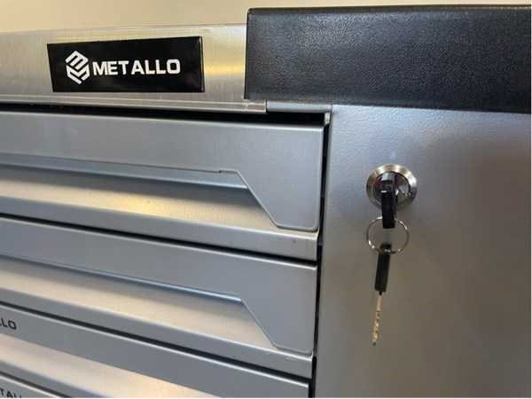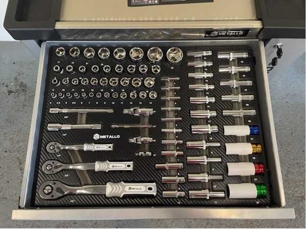 Voorzien van 8 laden waarvan 8 gevuld met professioneel gereedschap; Chroom-vanadium; RVS werkblad; Stevig handvat; Foam inleg; Zijdeur; 2 sleutels; 4 wielen waarvan 2 zwenkwielen; Ongebruikt in doos Merk: Metallo Type: 8 lades 8 gevuld Bouwjaar: 2024 Aantal laden: 8 Met inhoud: true