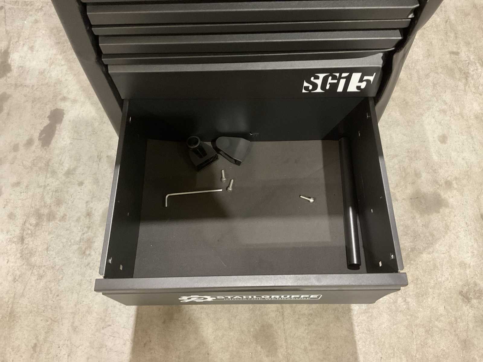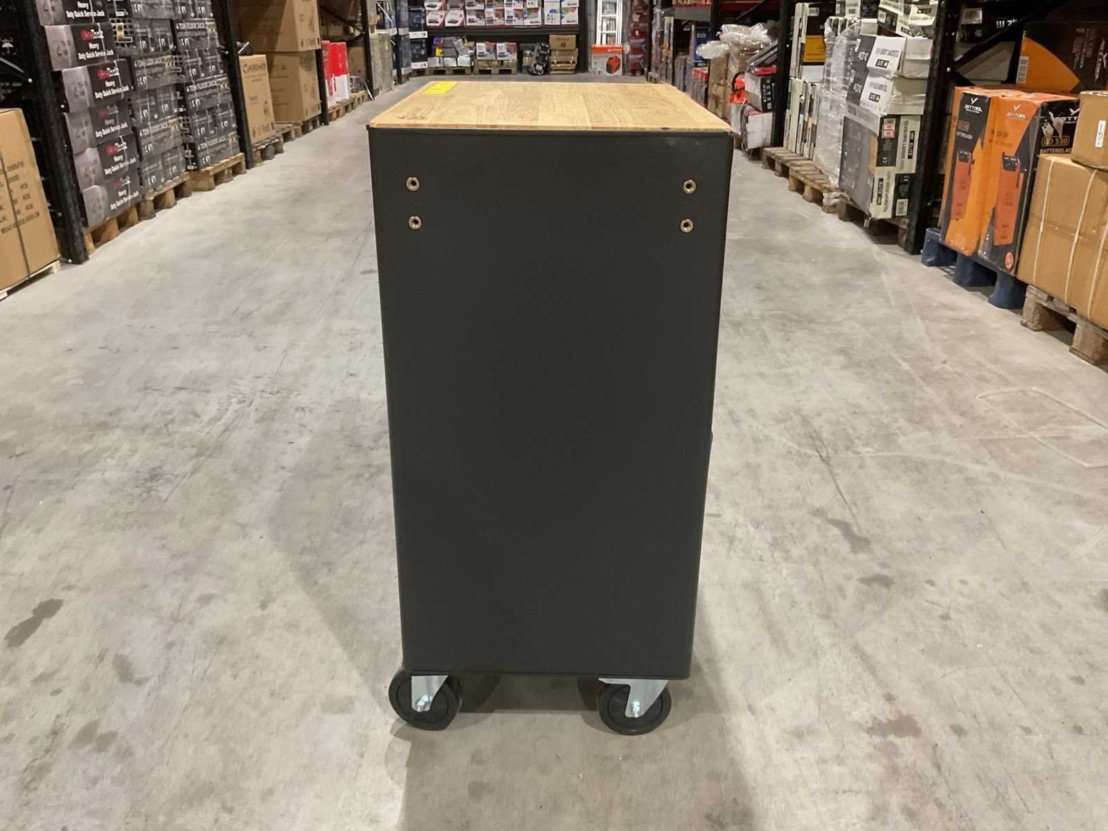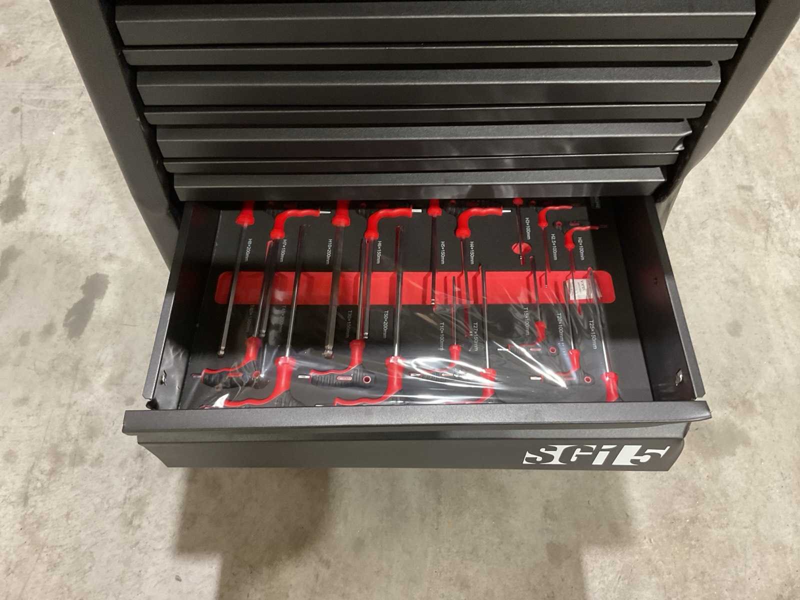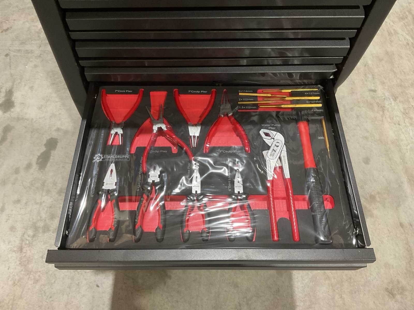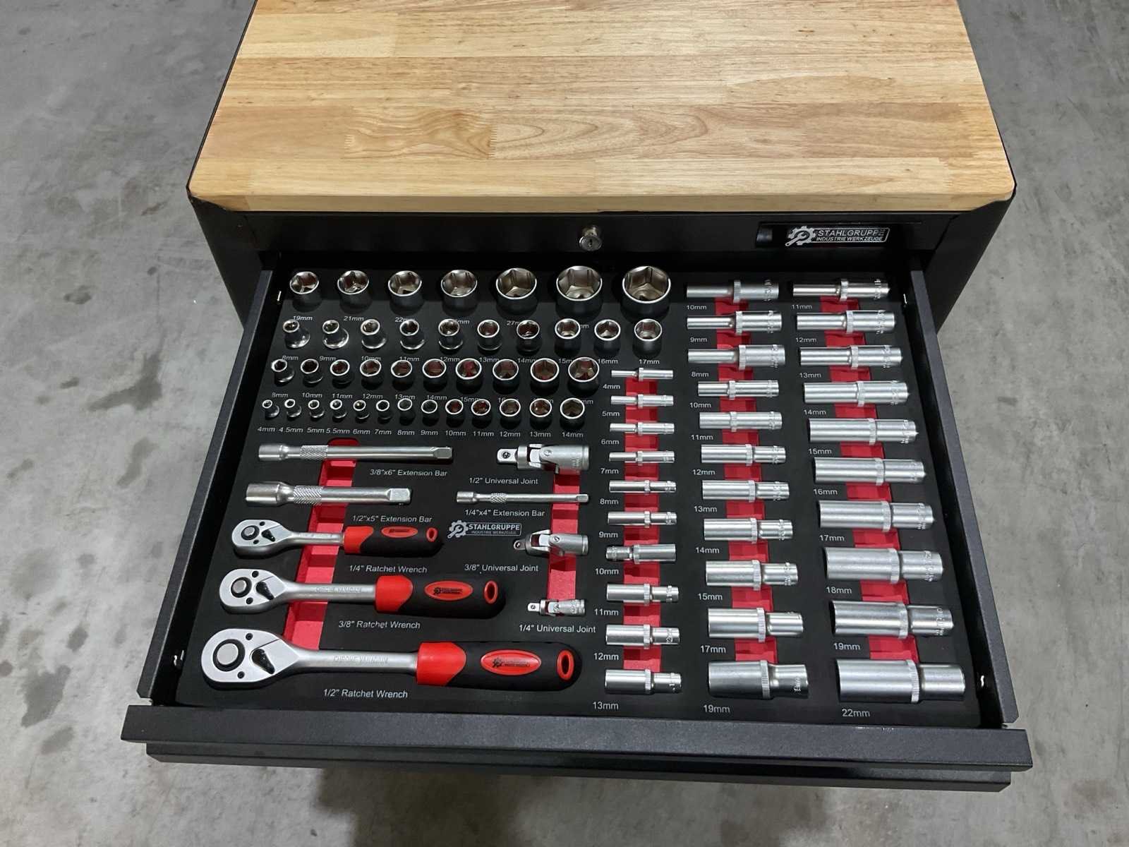 Voorzien van 7 lades waarvan 6 gevuld met gereedschap; professioneel chroom-vanadium gereedschap; heavy duty gereedschapswagen; houten werkblad; 4 wielen; stevig handvat; (transport afmetingen 70x50x105 cm); Let op transports schade Merk: Stahlgruppe Type: SG15 Bouwjaar: 2025 Aantal laden: 7 Met inhoud: true Eigen gewicht: 77kg Totale afmeting L: 68mm Totale afmeting Breedte: 48mm Totale afmeting Hoogte: 104mm