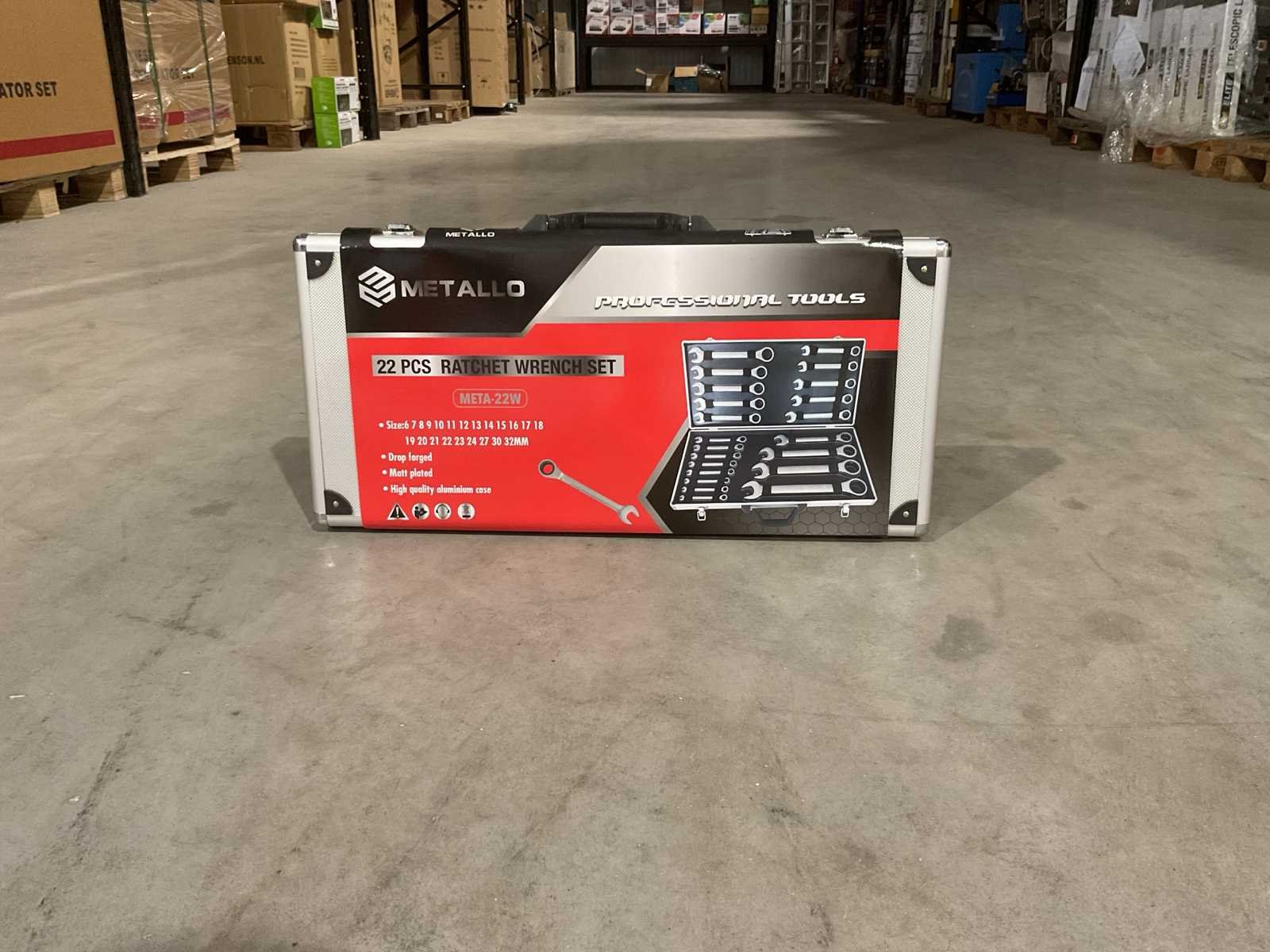 Voorzien van Steek/Ratelringsleutel maten: 6, 7, 8, 9, 10, 11, 12, 13, 14, 15, 16, 17, 18, 19, 20, 21, 22, 23, 24, 27, 30, 32mm; Aluminium koffer; Ongebruikt (Transport Afmeting 600 x 60 x 300mm, Gewicht: 7,42 kg) Merk: Metallo Set: true Delig: 22 Bouwjaar: 2025 Type: META-22W