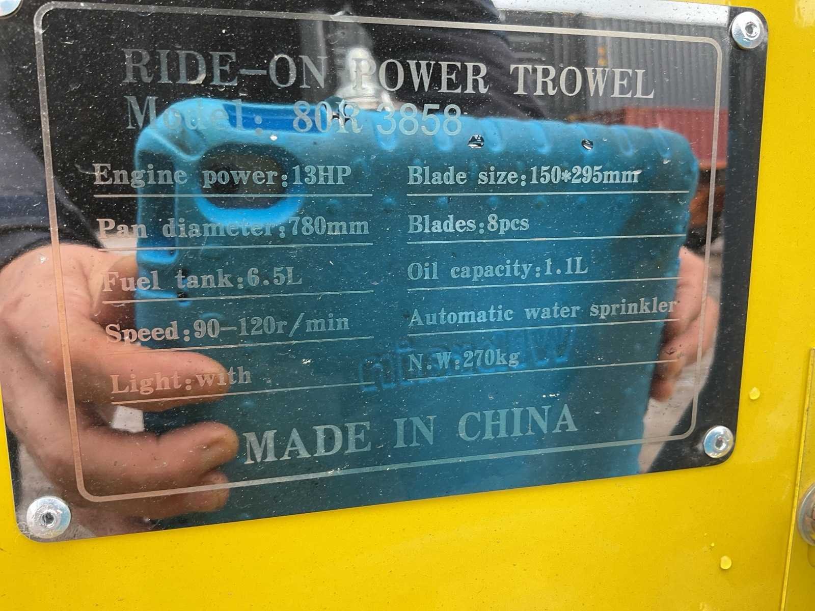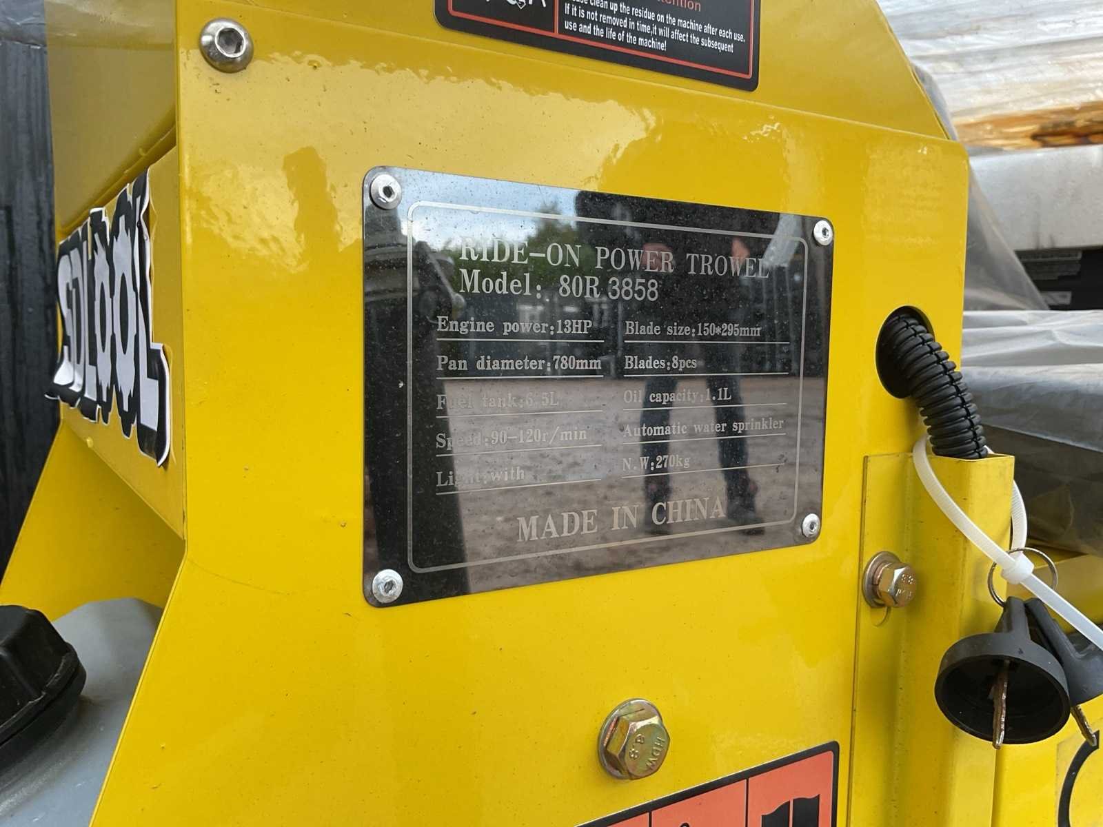 Voorzien van; motor 13pk; diameter pan 780mm; tankinhoud 6,5 liter; snelheid 90-120r/minuut; mes grote 150x295mm; aantal bladen 8; olie capaciteit 1.1 liter; automatische water sprinkler Merk: SDLOOL Type: 80R3858 Bouwjaar: 2025 Afmeting l: 1640mm Afmeting b: 860mm Afmeting h: 940mm Eigen gewicht: 270kg
