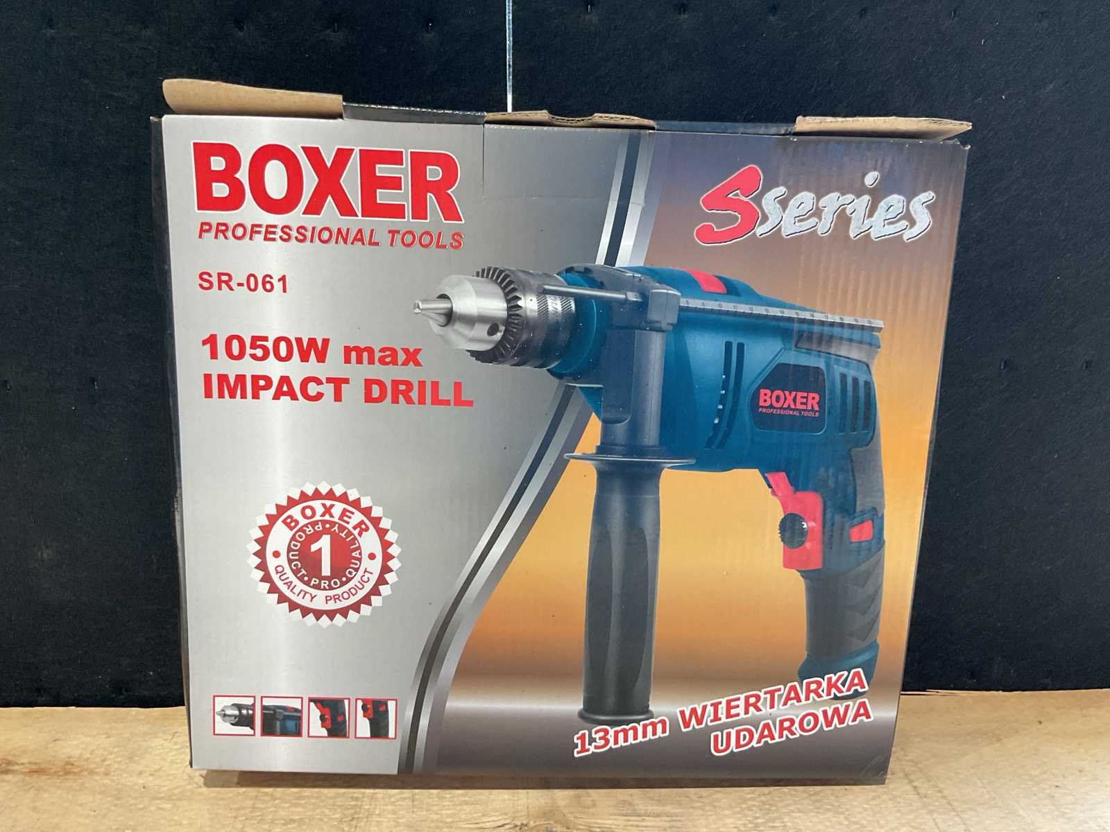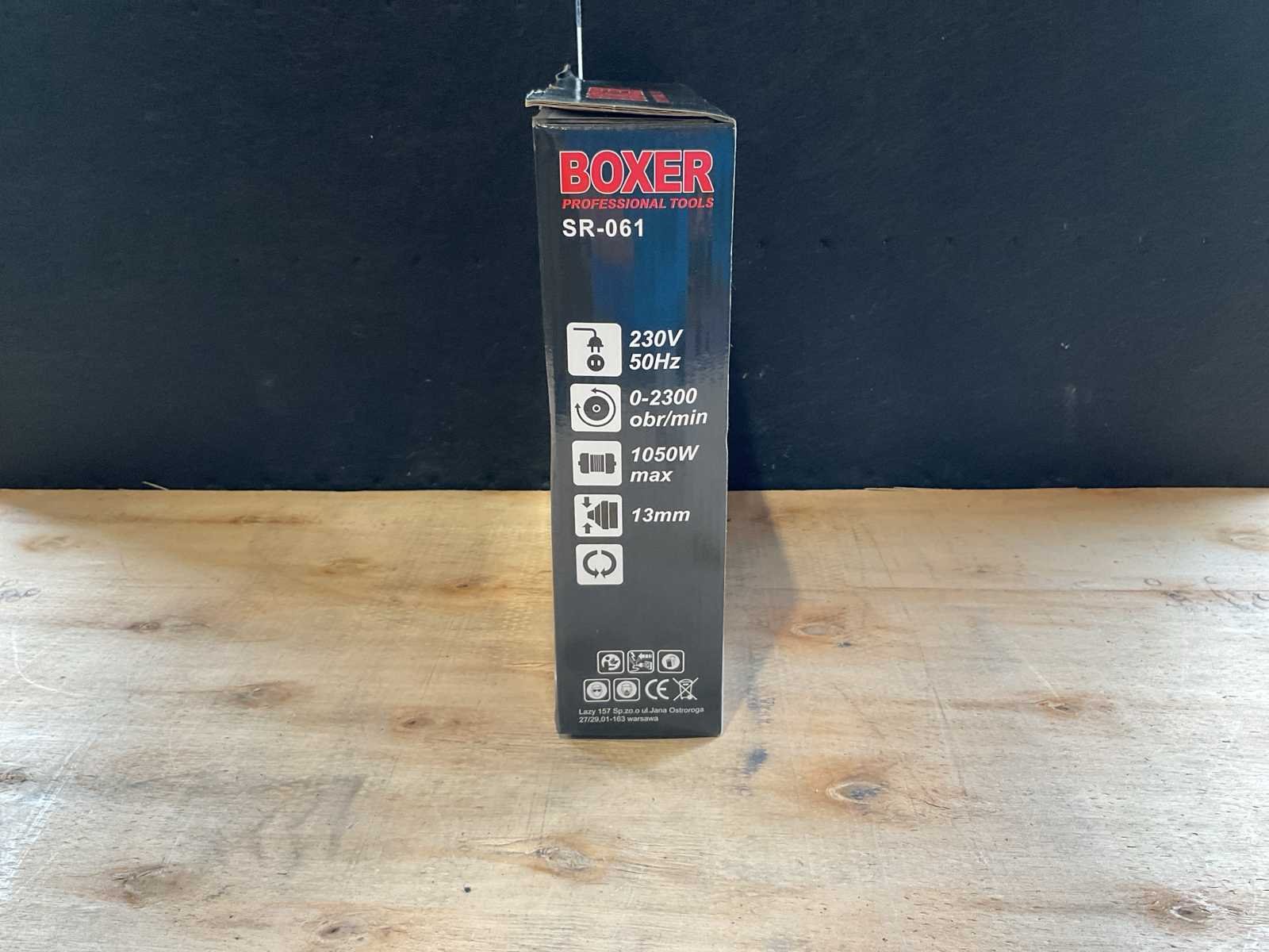 Eigengewicht 2,3kg verpakking afmeting 300x75x265mm Merk: Boxer Type: SR-061 Bouwjaar: 2025 Klopboormachine: true Capaciteit.: 13mm Vermogen: 1050W Aansluiting: 230V