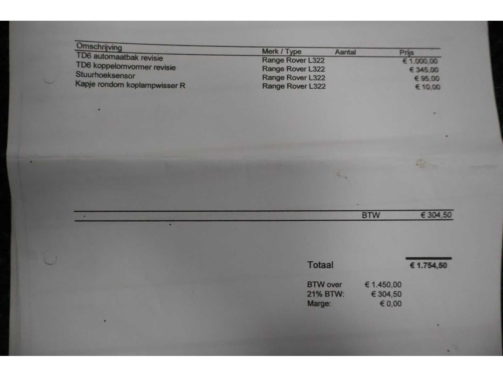Grijs kenteken. onderhoudshistorie aanwezig Kenteken: Vhz78v Merk: land rover Type: Range Rover Chassisnummer: SALLMAMC45A195255 Afgelezen kilometerstand: 500459km Cilinderinhoud: 2926cc Vermogen (kW): 130kW Brandstof: Diesel Datum eerste toelating: 2005-02-11 Datum eerste toelating (NL): 2005-02-11 APK vervaldatum: 2025-11-17 Transmissie: automaat Aantal zitplaatsen: 2 Kleur: grijs Bruto BPM (NL): 31159 Aantal deuren: 4 Ledig gewicht: 2440kg Laadvermogen: 500kg Aantal cilinders: 6 Carrosserie: gesloten opbouw Emissieklasse: 3 Onderhoudshistorie: beschikbaar Startinformatie: start en rijdt Self drive export possible : true