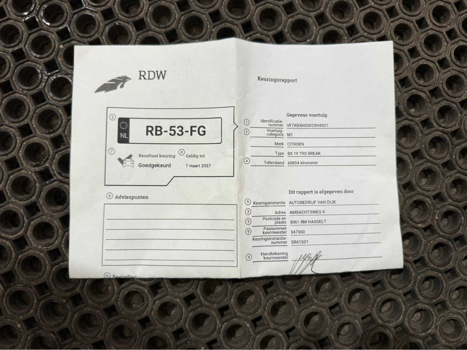- NAP - origineel Nederlandse auto - recent groot onderhoud gehad Kenteken: RB-53-FG Merk: Citroen Type: BX 19 TRS Bouwjaar: 1986 Afgelezen kilometerstand: 61164 Model: BX NAP status: Logisch Brandstof: benzine Datum eerste toelating: 1986-09-29 Datum eerste toelating (NL): 1986-09-29 APK vervaldatum: 2027-03-07 Nationaliteit documenten: Nederlands Kentekenpapieren compleet?: true Carrosserie: stationwagen Transmissie: Handgeschakeld Vermogen (pk): 102 Vermogen (kW): 75kW Emissieklasse: 0 Aantal deuren: 4 Kleur: grijs Cilinderinhoud: 1905 Aantal cilinders: 4 Ledig gewicht: 987 Self drive export possible : true