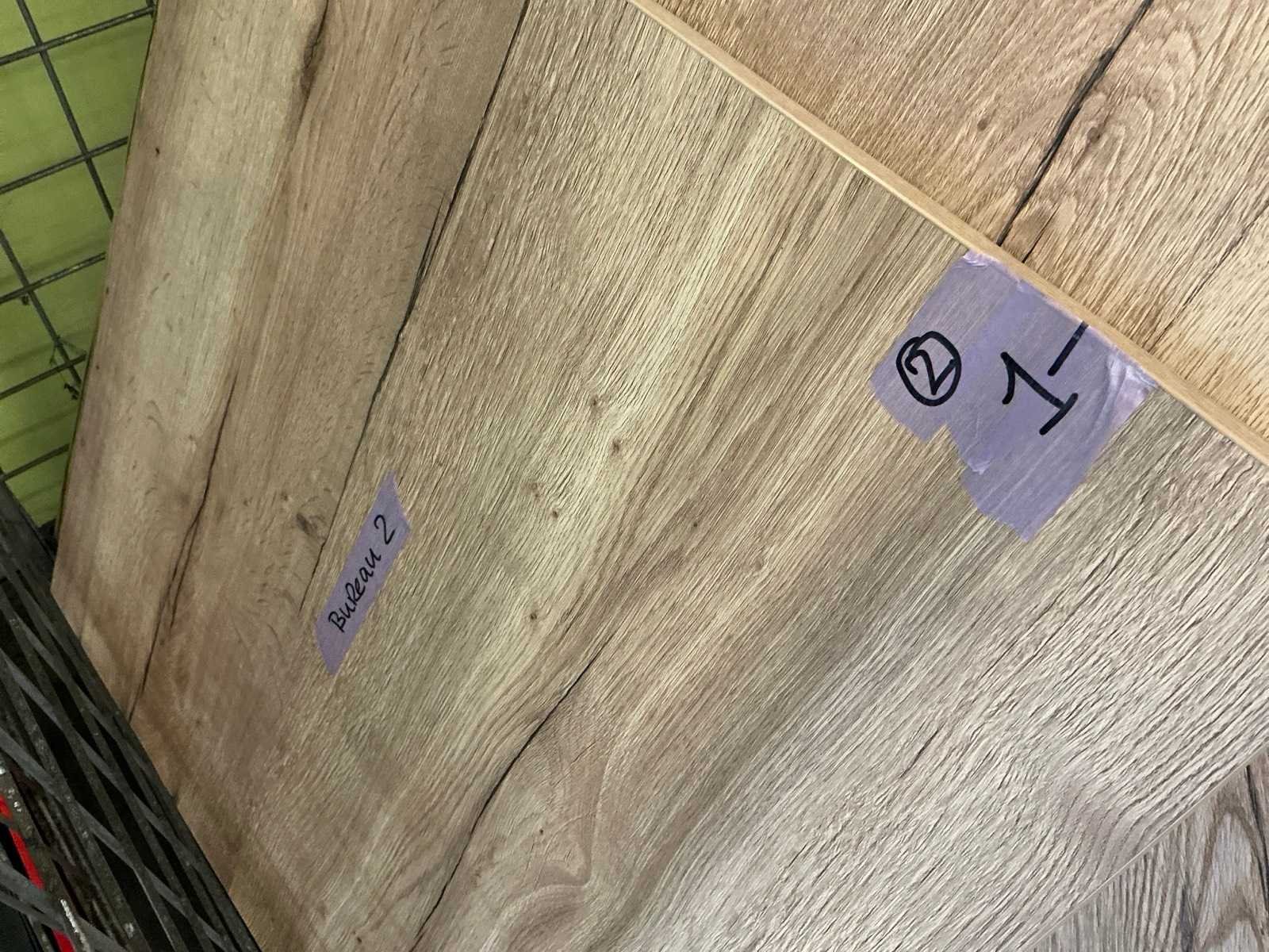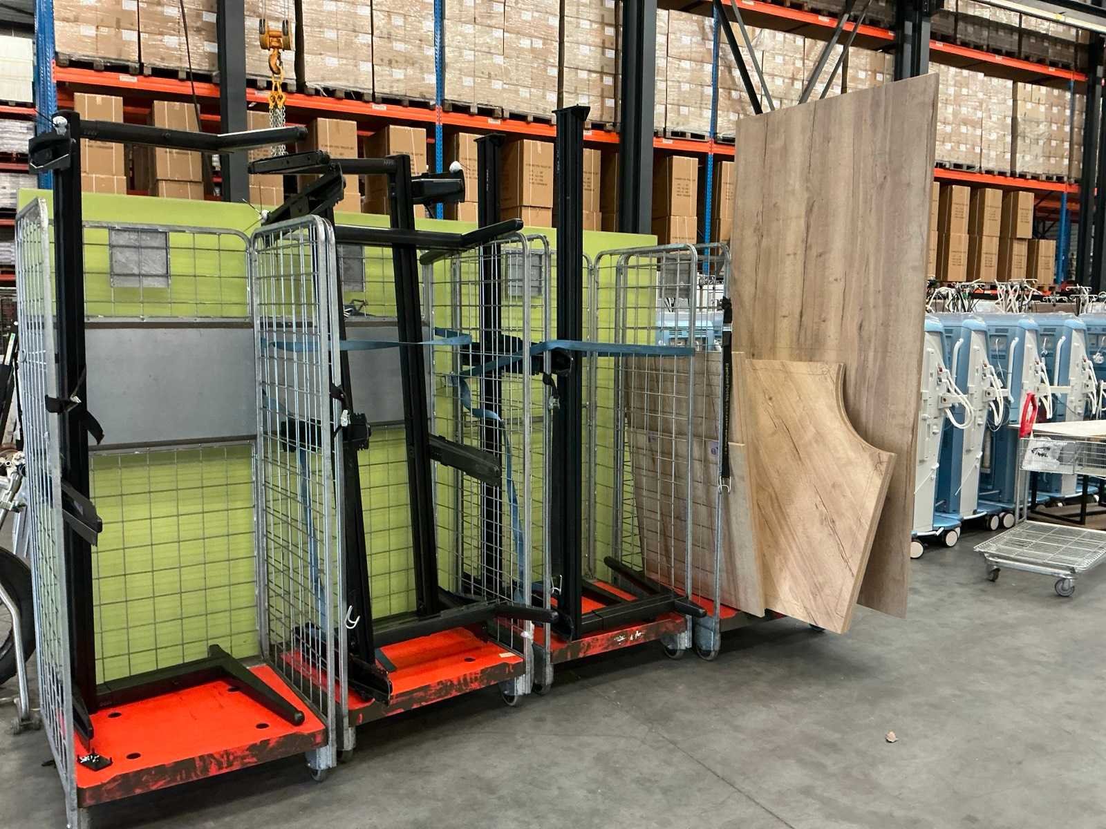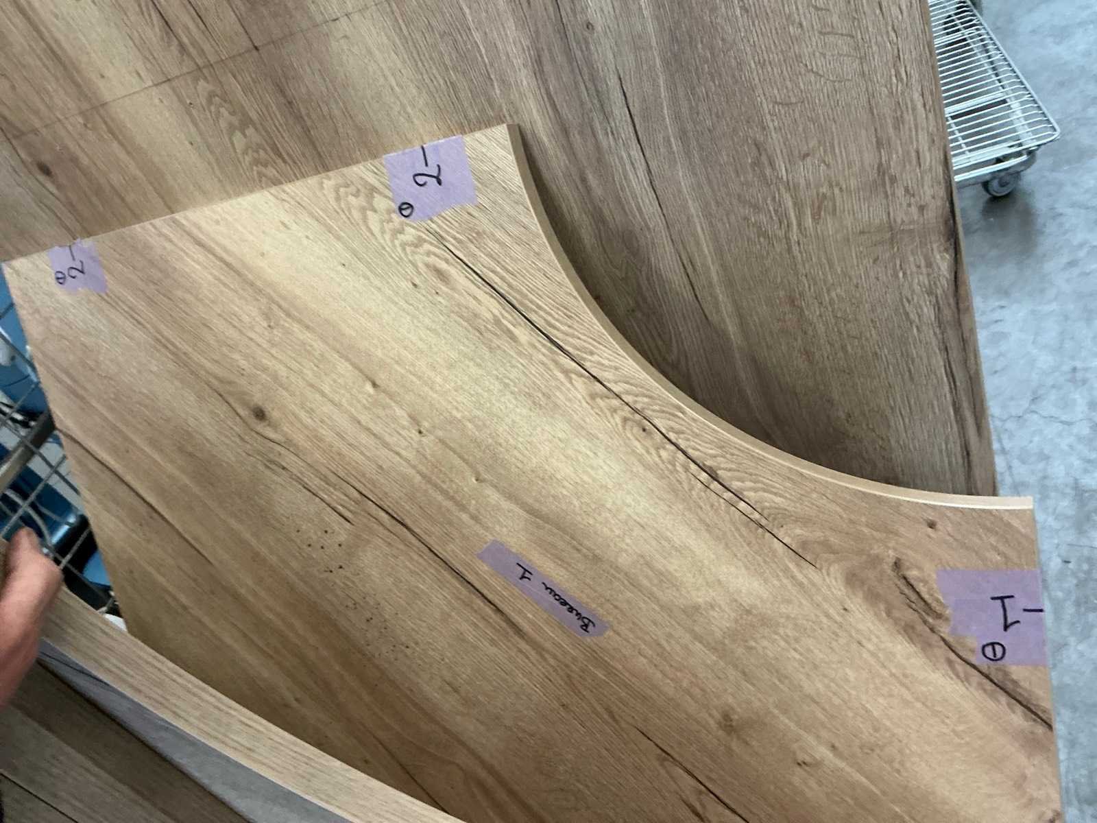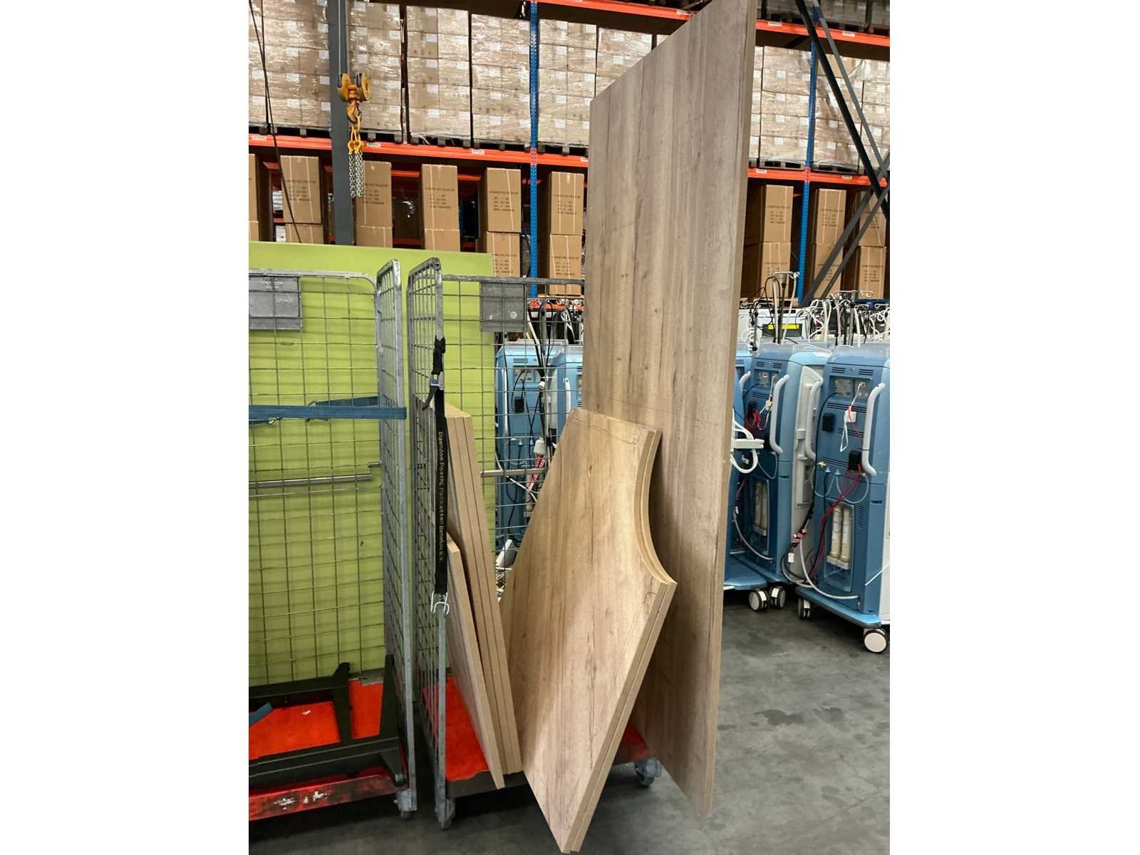 Bestaande uit 5 onderstellen en 7 bladen. Langste blad is 240cm lang en 120cm breed, de 3 kleine bladen zijn 120cm x 80cm, kleinste blad is 80cm x 80cm, blad met ronding erin is 120cm x120cm. Er staan op de tafel stickers met nummers en afbeeldingen van de tafelonderstellen