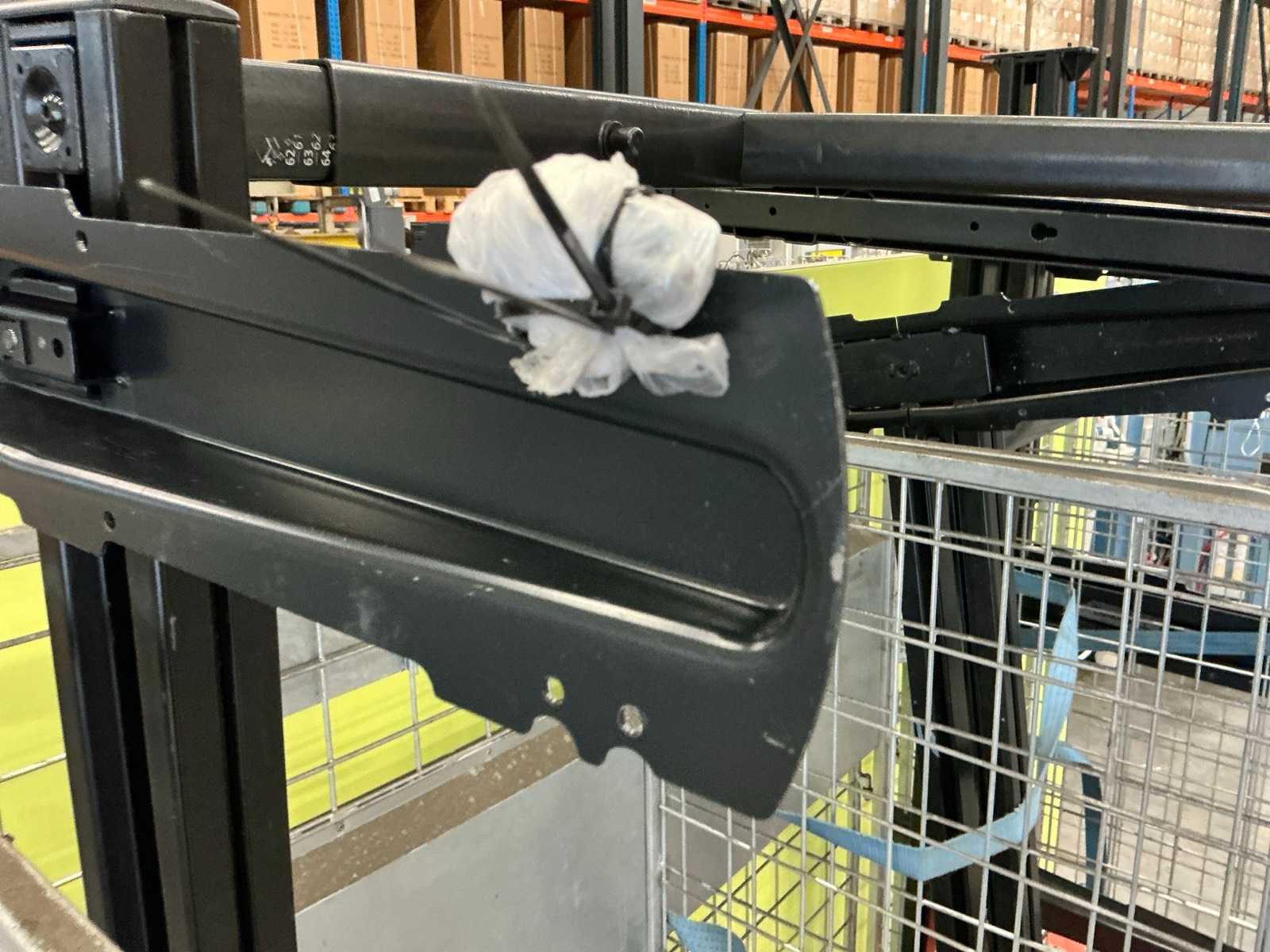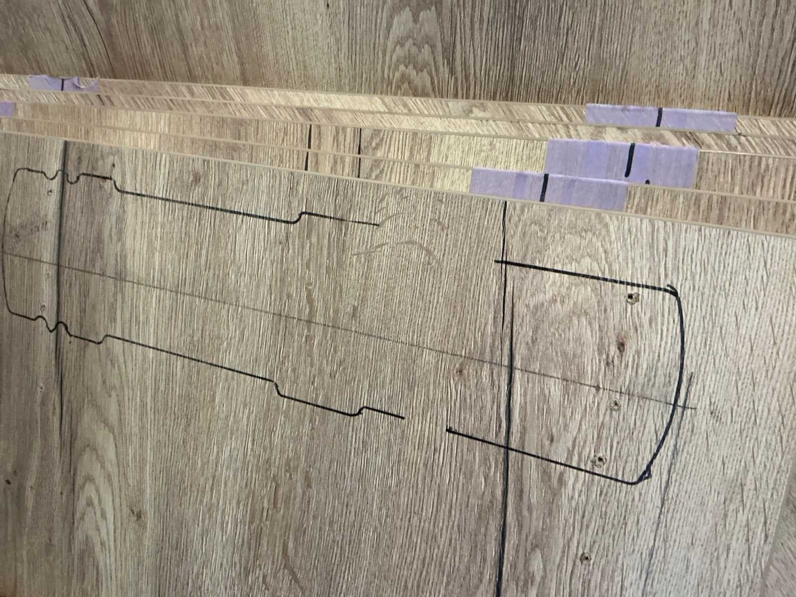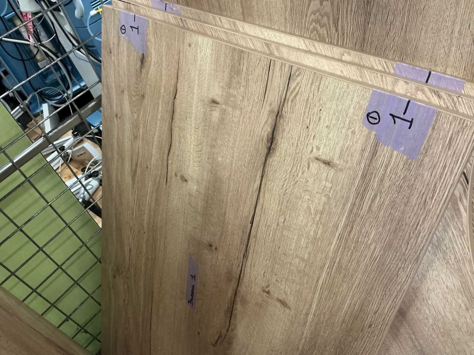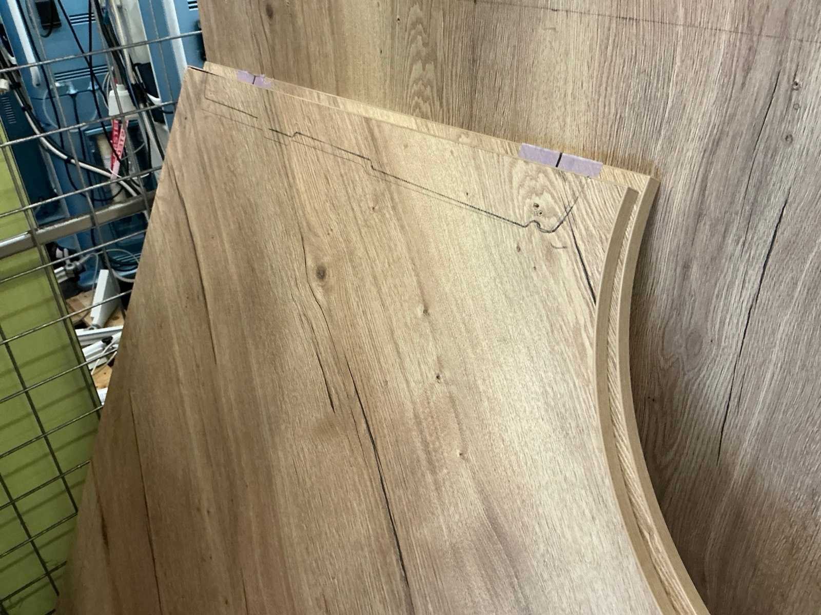 Bestaande uit 5 onderstellen en 7 bladen. Langste blad is 240cm lang en 120cm breed, de 3 kleine bladen zijn 120cm x 80cm, kleinste blad is 80cm x 80cm, blad met ronding erin is 120cm x120cm. Er staan op de tafel stickers met nummers en afbeeldingen van de tafelonderstellen