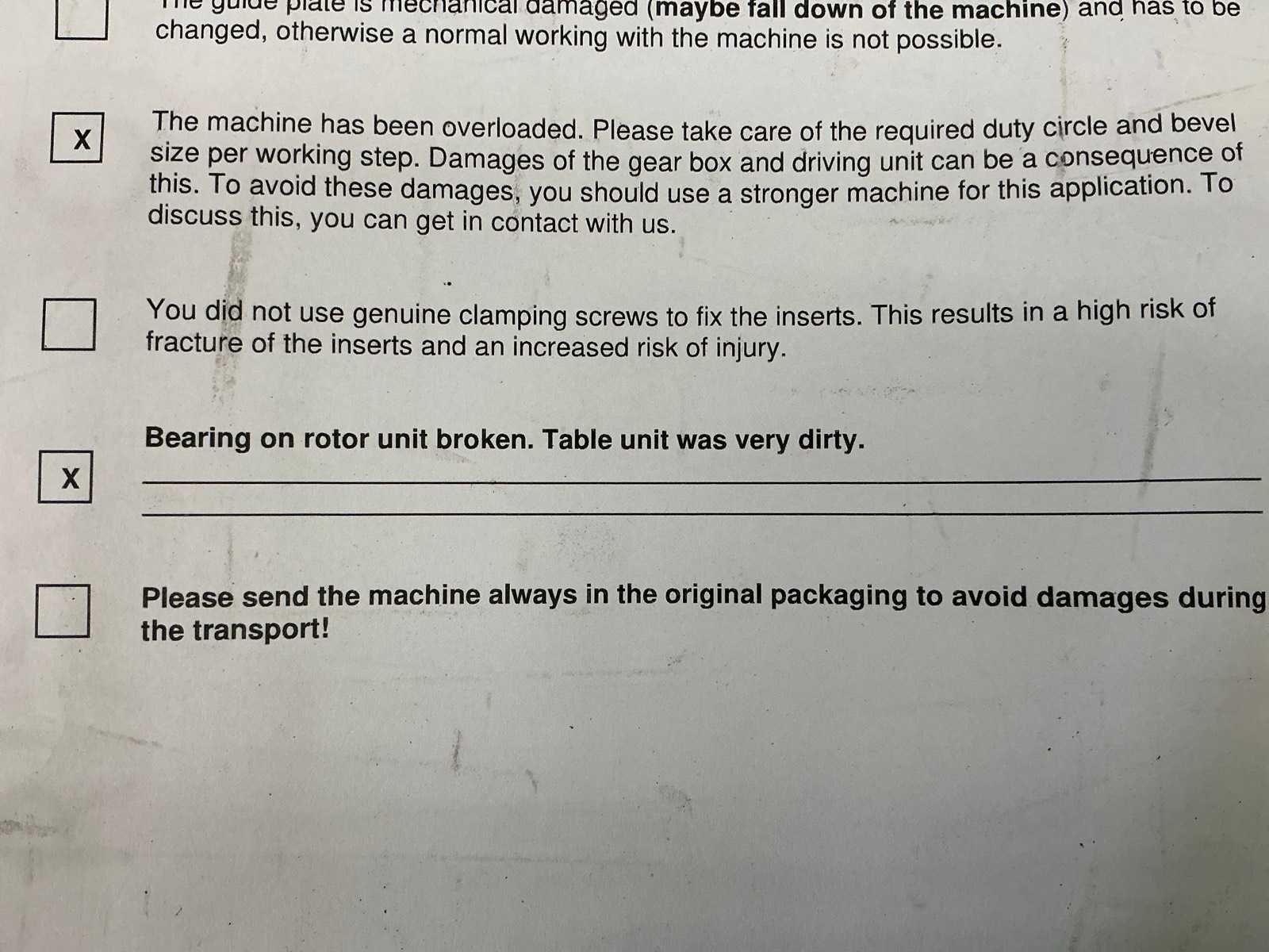 Volgens opgave is de machine overbelast. Lager rotor eenheid gebroken. Merk: GERIMA Type: SMT 30-AER Aansluiting: 230V Snelheid van n =: 7900rpm Serienummer: 22-250-00084
