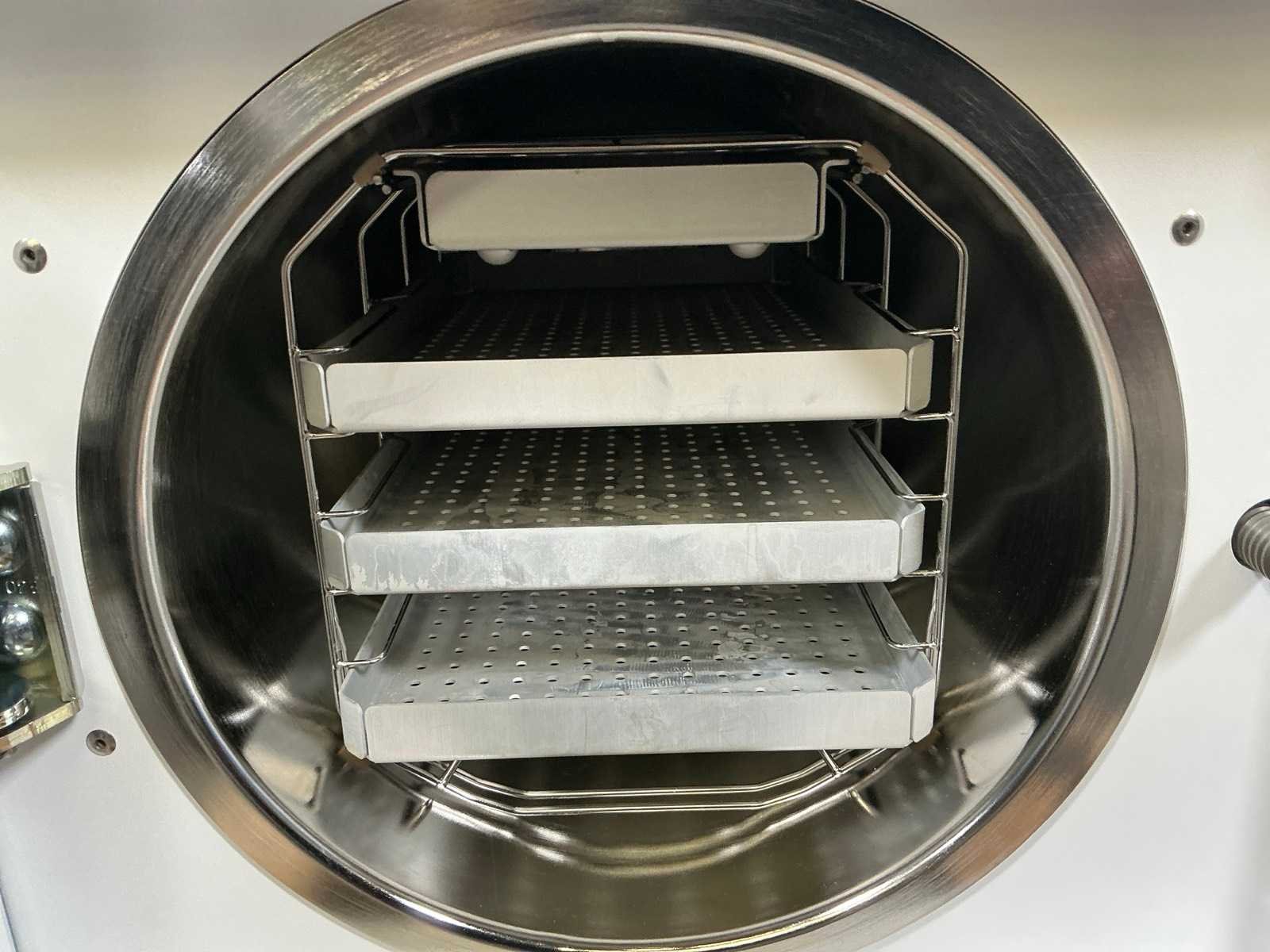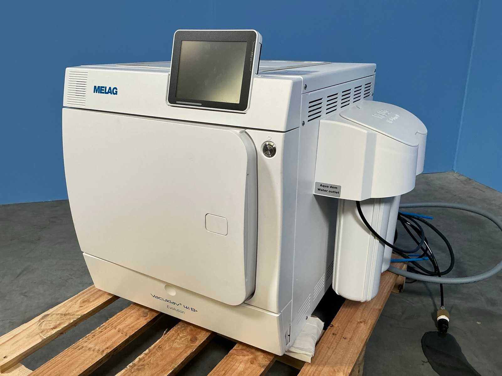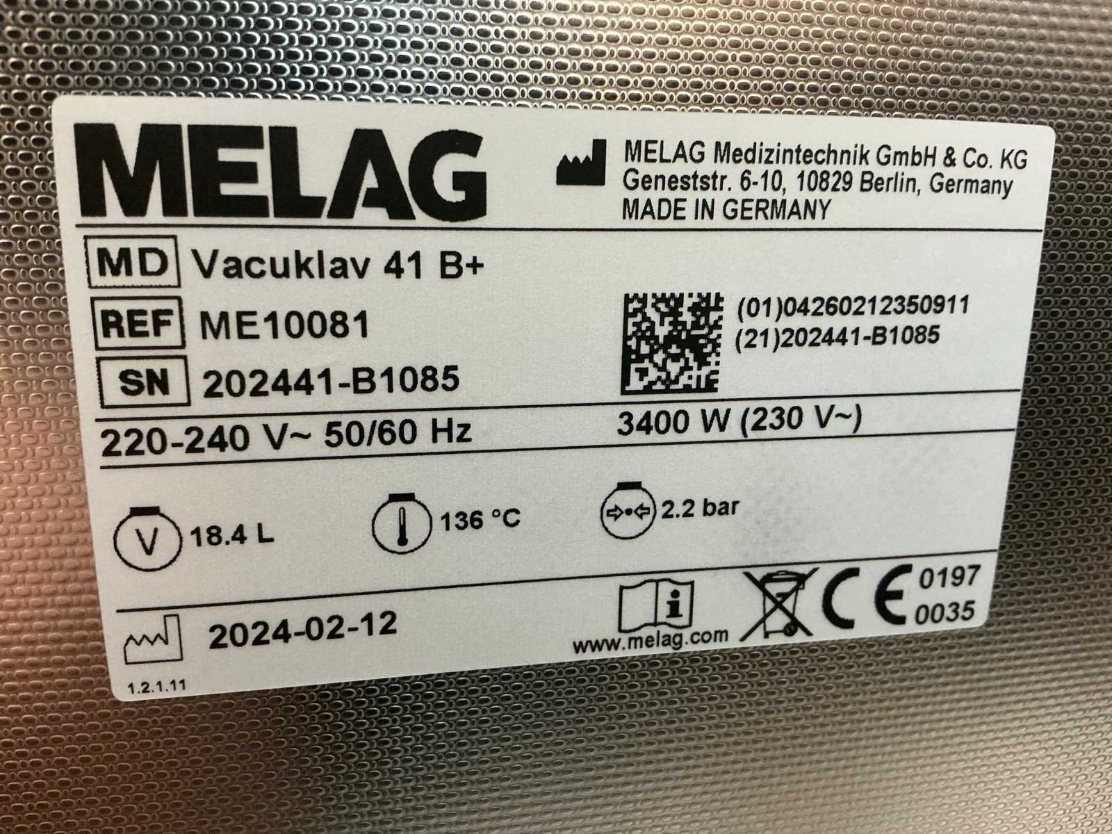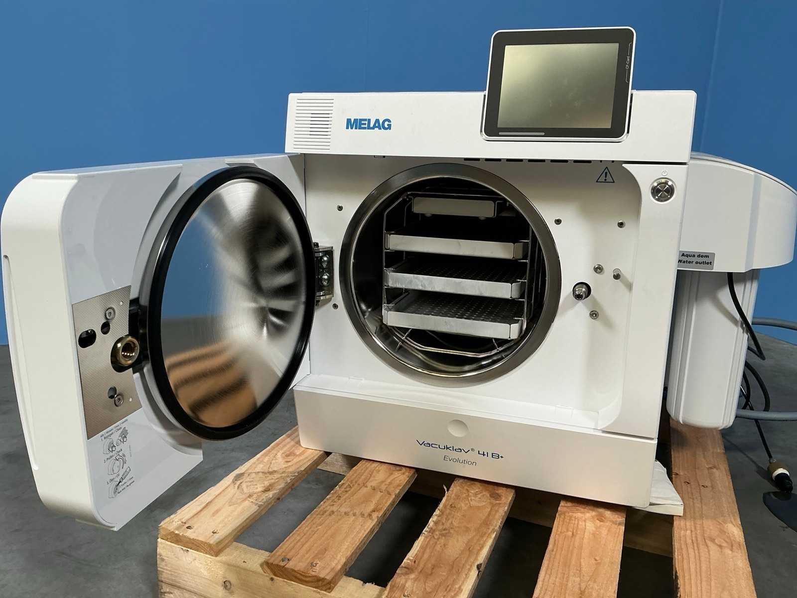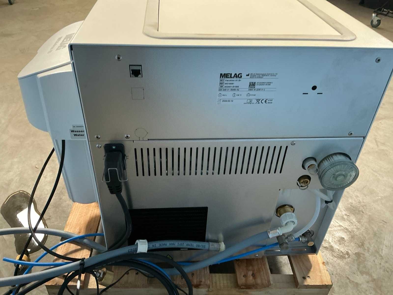 Afmeting (45x50x55cm); 230V, 3400W; Kleuren touchscreen Merk: MELAG Bouwjaar: 2024 Serienummer: 2024441-B1085 Type: Vacuklav 41B+
