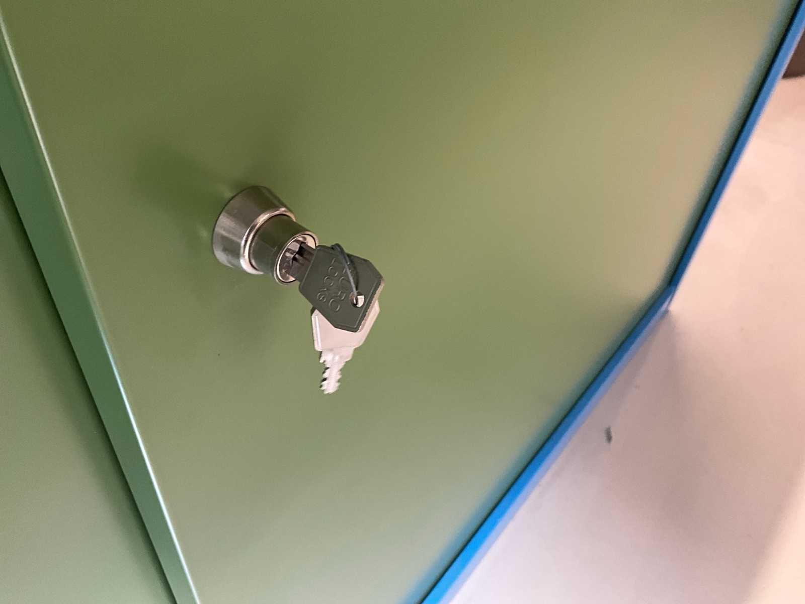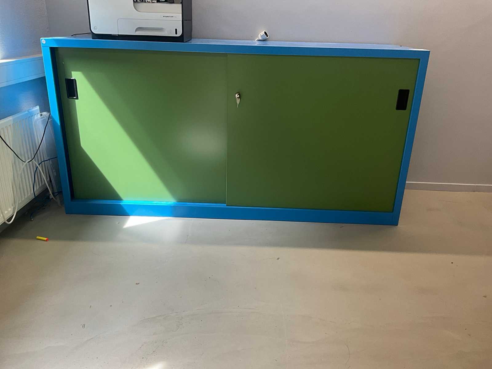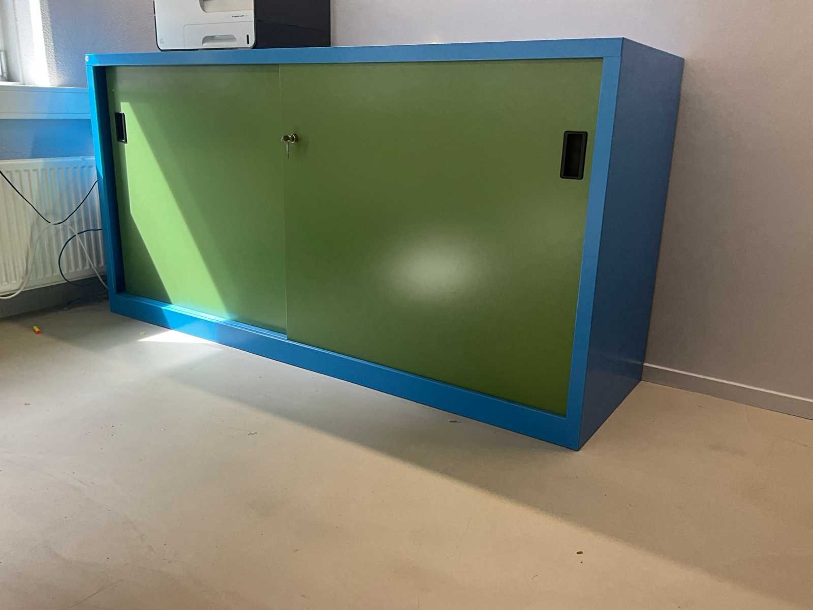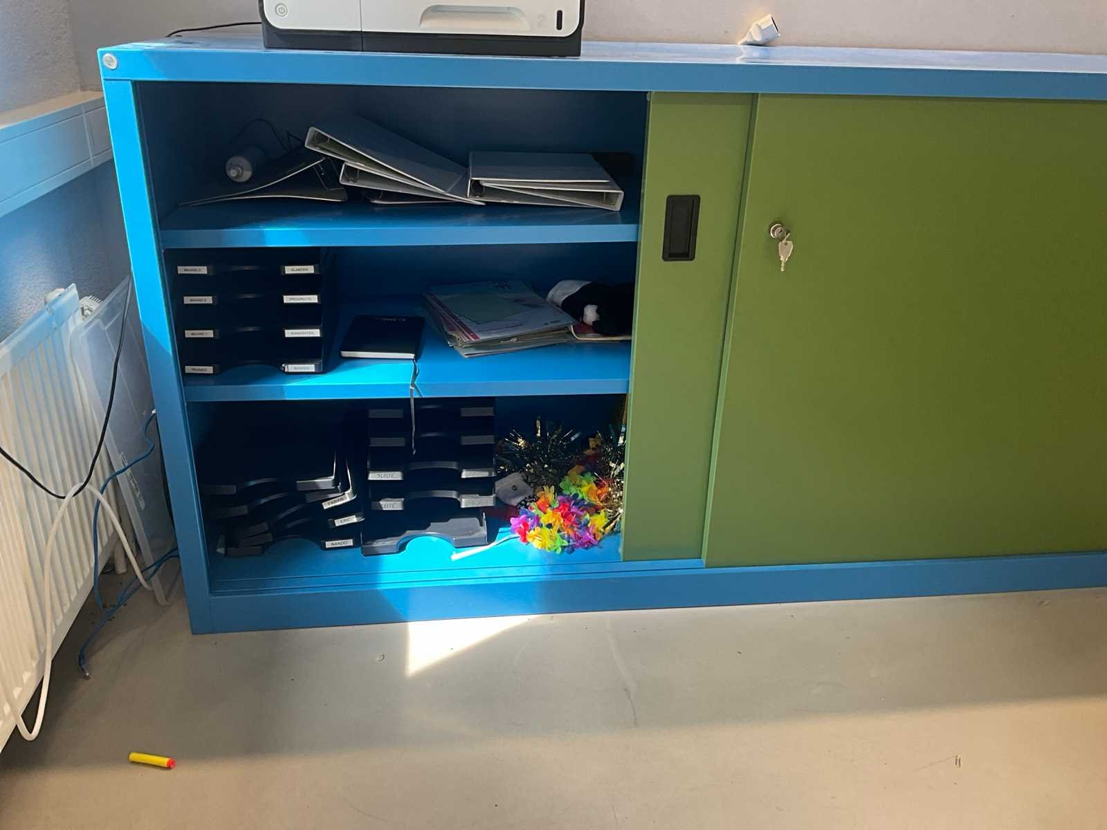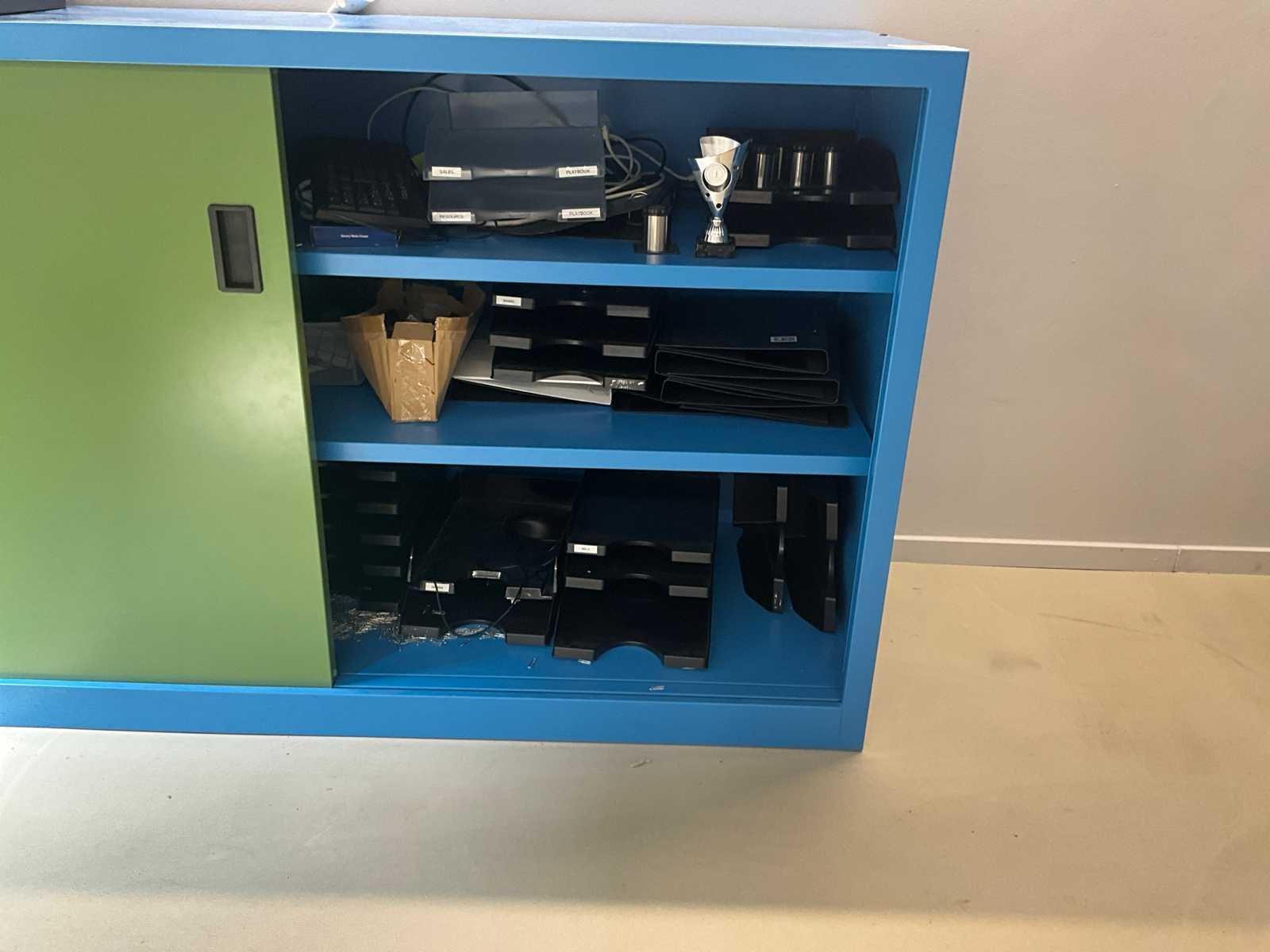 Inclusief inhoud, diverse kantoorartikelen. Kleur: Groen / blauw Lengte: 60cm Breedte: 200cm Hoogte: 100cm Materiaal: Metaal Diepte: 50cm