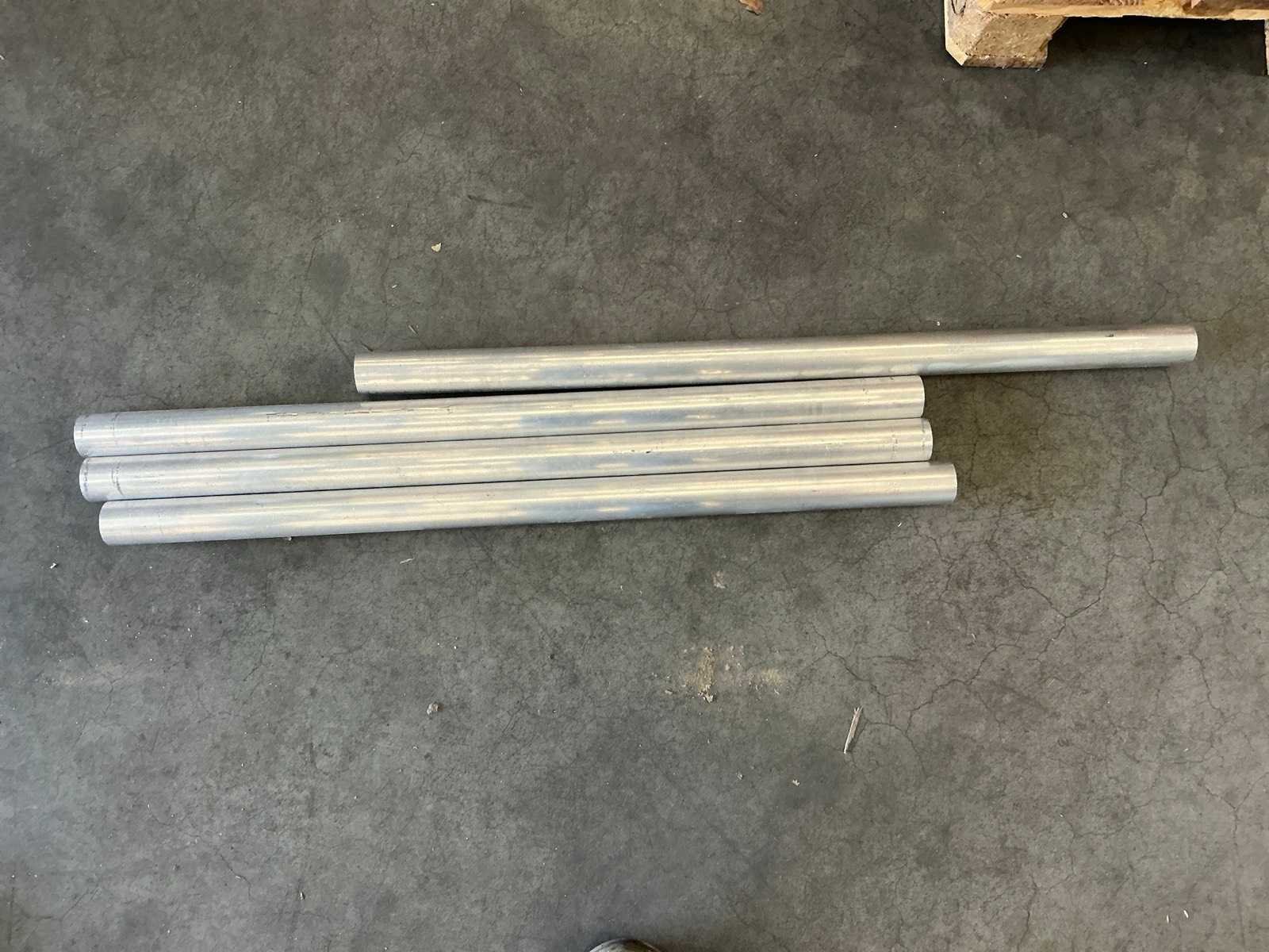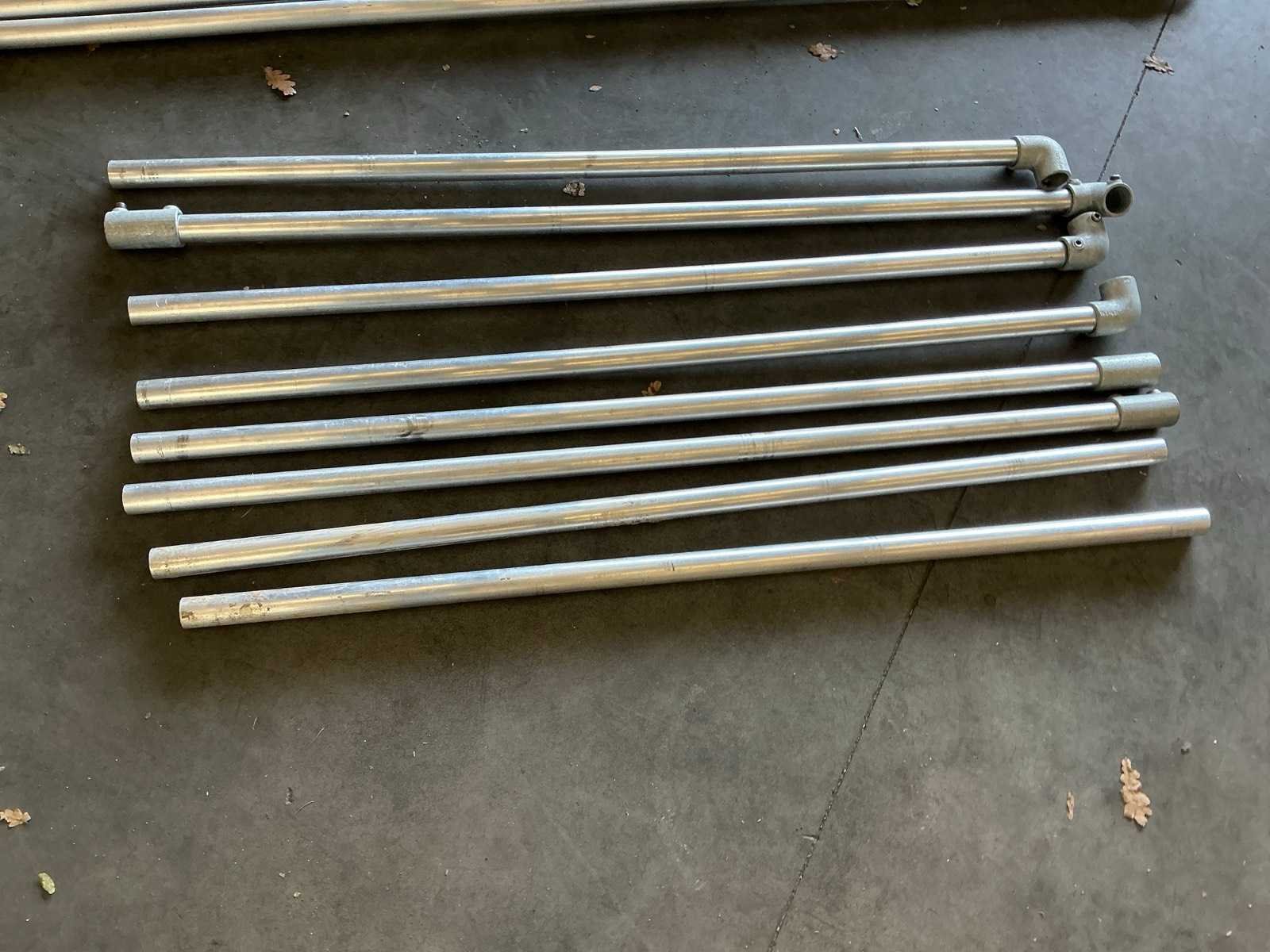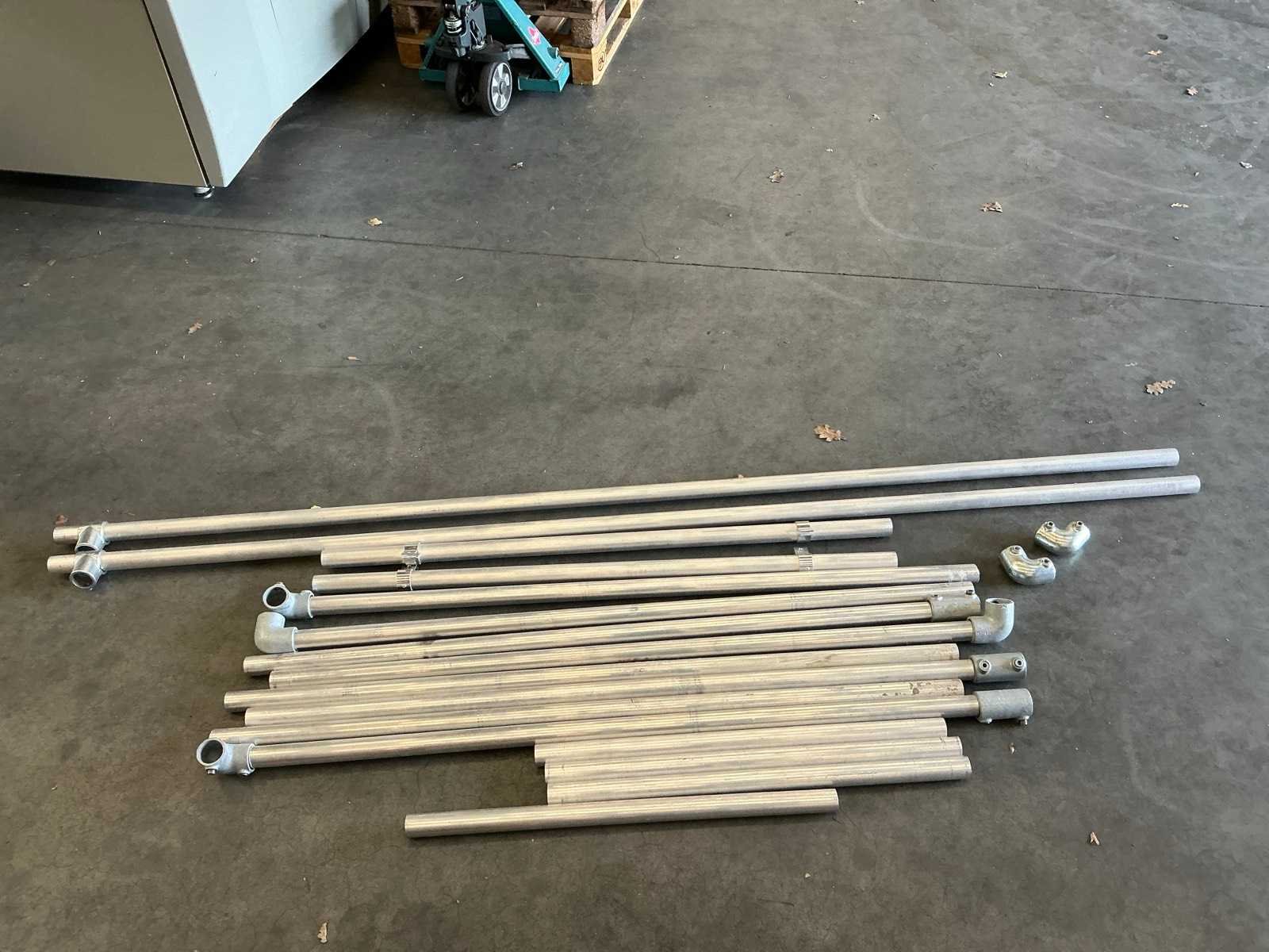 Langste stuk265cm(2x), 8 buizen van 150cm, 2 losse koppelstukken, 4 kleine buizen van 80cm, 2 buizen van 130cm