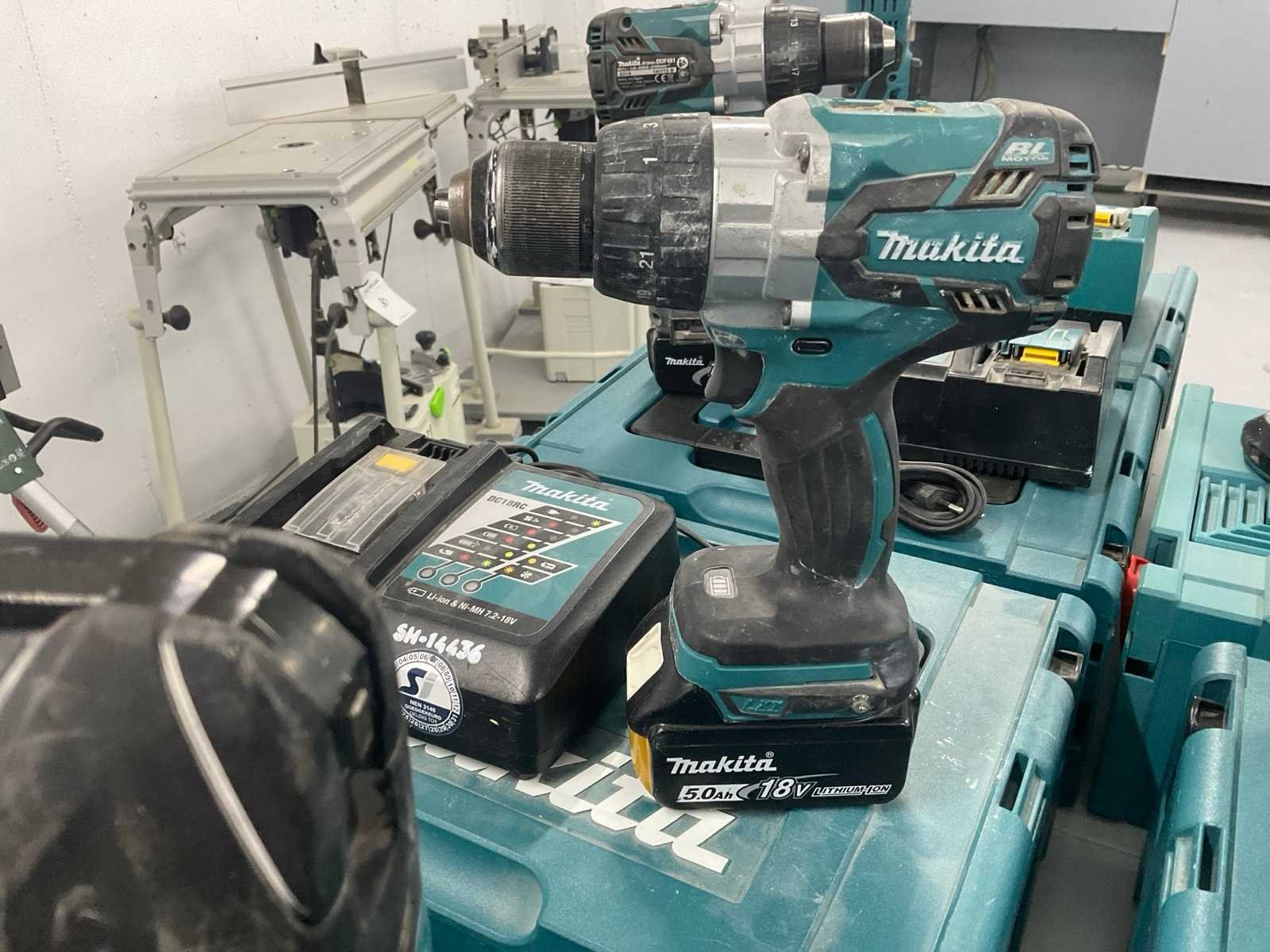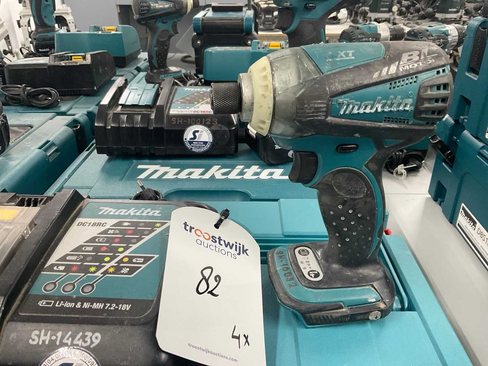 2 schroefboormachines, 1 multitool, 1 slagschroevendraaier, 4 acculaders, 2 accu’s en 4 koffers Merk: Makita Accuspanning: 18V
