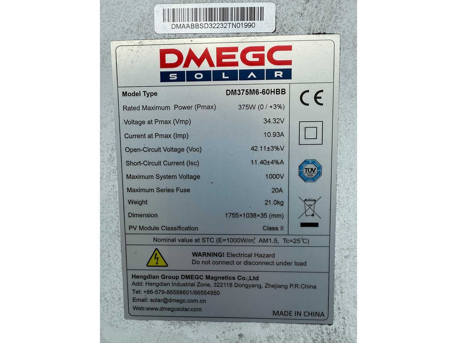 Set van 62 zonnepanelen (375 wp) met Sungrow SG20 RT 20kW Premium omvormer (3-fase) zonnepanelen: DMEGC DM375M6-60HBB omvormer: Sungrow SG20 RT Premium omvormer (3-fase) totaal vermogen: 23.250 Wp vermogen: 375 Wp per zonnepaneel conditie: nieuw Merk: DMEGC Type: DM375M6-60HBB Max. dc power: 375W Eigen gewicht: 21kg Totale afmeting L: 1755mm Totale afmeting Breedte: 1038mm Totale afmeting Hoogte: 35mm