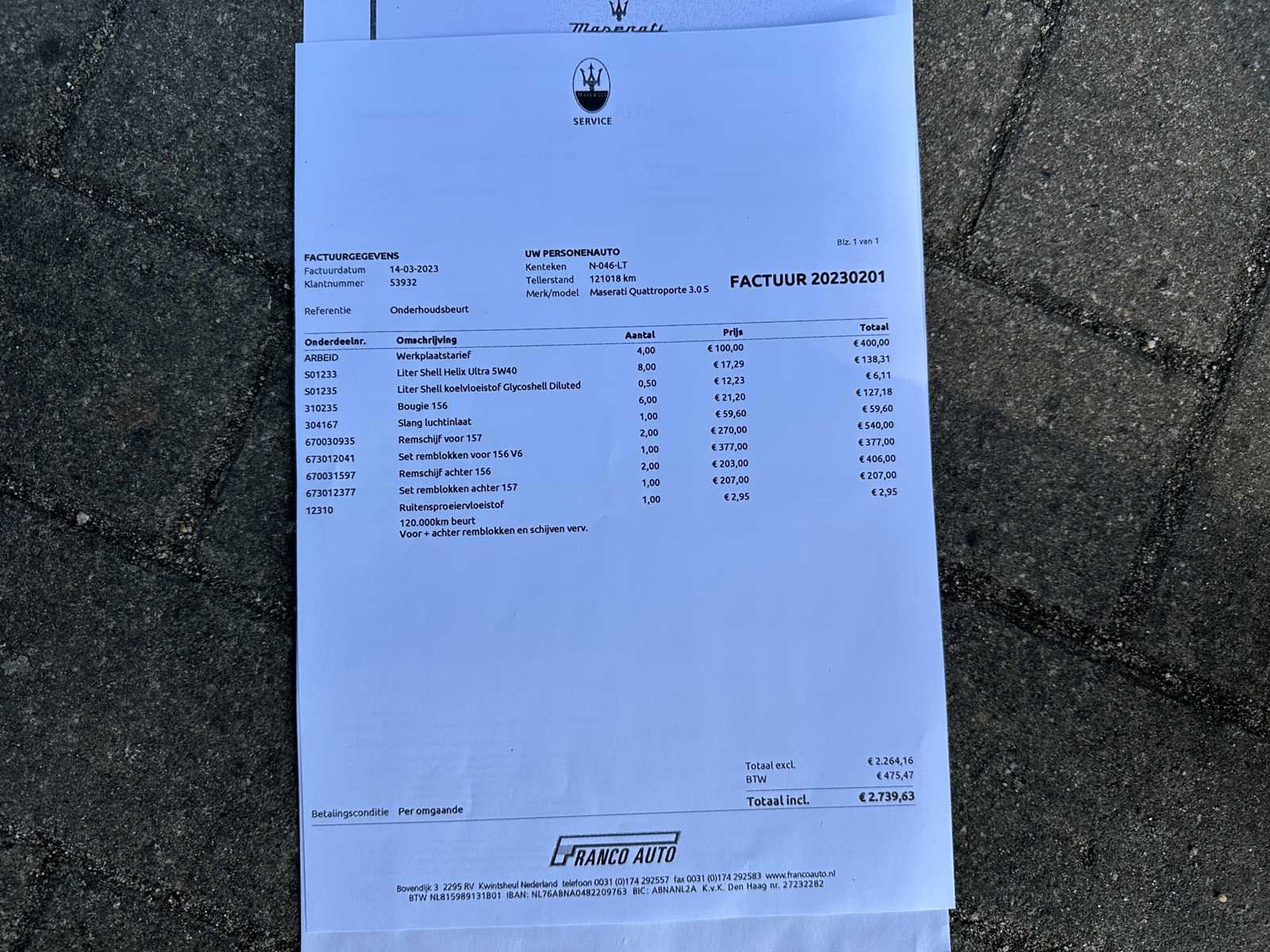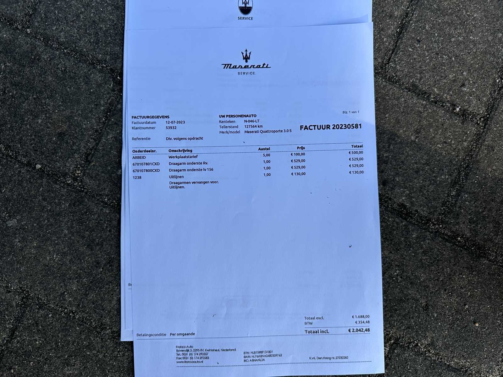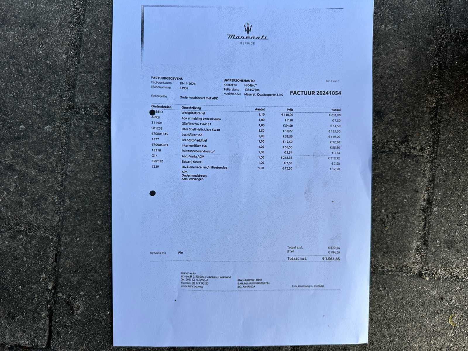LET OP!: voor Nederlandse kopers en kopers van buiten de EU komt de Rest-BPM er nog bij, deze verschijnt later op de factuur en bedraagt €1.497,-. Dus totale biedprijs + €1.497,-. De totaalprijs bij het bieden is dus excl. BPM! (This is only relevant for Dutch buyers and buyers from outside the EU) Important: international buyers (within the EU) can reclaim the remaining amount Dutch BPM tax ('rest-BPM'). For this lot, buyer pays the BPM tax as a deposit and after registering this lot in your country, the deposit will be refunded. Dutch and non-EU buyers will pay the BPM via the invoice of this lot. Kenteken: N-046-LT Merk: Maserati Model: Quattroporte Type: 3.0 S Q4 Afgelezen kilometerstand: 145590km Cilinderinhoud: 2979cc Vermogen (kW): 302kW Brandstof: Benzine Chassisnummer: ZAMRR56B001155052 Laadvermogen: 0kg NAP status: Geen oordeel Datum eerste toelating: 2015-04-13 Datum eerste toelating (NL): 2022-01-22 APK vervaldatum: 2025-11-19 Vermogen (pk): 411hp Aandrijving: Vierwielaandrijving Aantal zitplaatsen: 5 Kleur: zwart Transmissie: Automaat Stuurwiel: Links gestuurd Emissieklasse: 5 Aantal deuren: 4 Ledig gewicht: 1955kg Aantal cilinders: 6 Carrosserie: sedan Nationaliteit documenten: Nederlandse kentekendocumenten Onderhoudshistorie: ja Carfax Link: https://was.carfax.eu/v0/api/ccdid/5100016408/svc/201/vinreg/N046LT/checksum/eyJhbGciOiJIUzI1NiIsInR5cCI6IkpXVCJ9.eyJleHAiOjE3NjA4ODMyMTR9.gb0M_G6M4PpT6rQSay9sW9s9s4j9yZIMBzfcr60V3QE