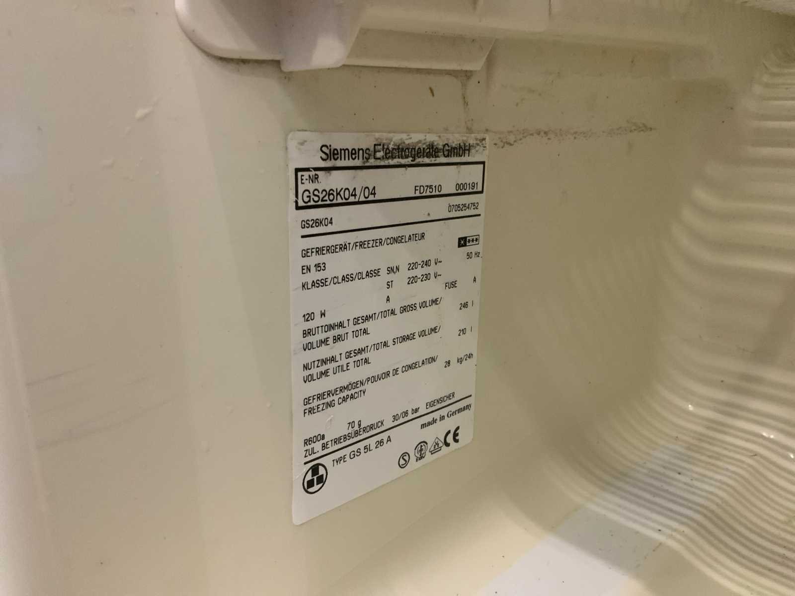 Merk: Siemens Type: GS 5L 26 A Aansluiting: 230V Serienummer: GS26K04/04 Totale afmeting L: 62cm Totale afmeting Breedte: 66cm Totale afmeting Hoogte: 147cm