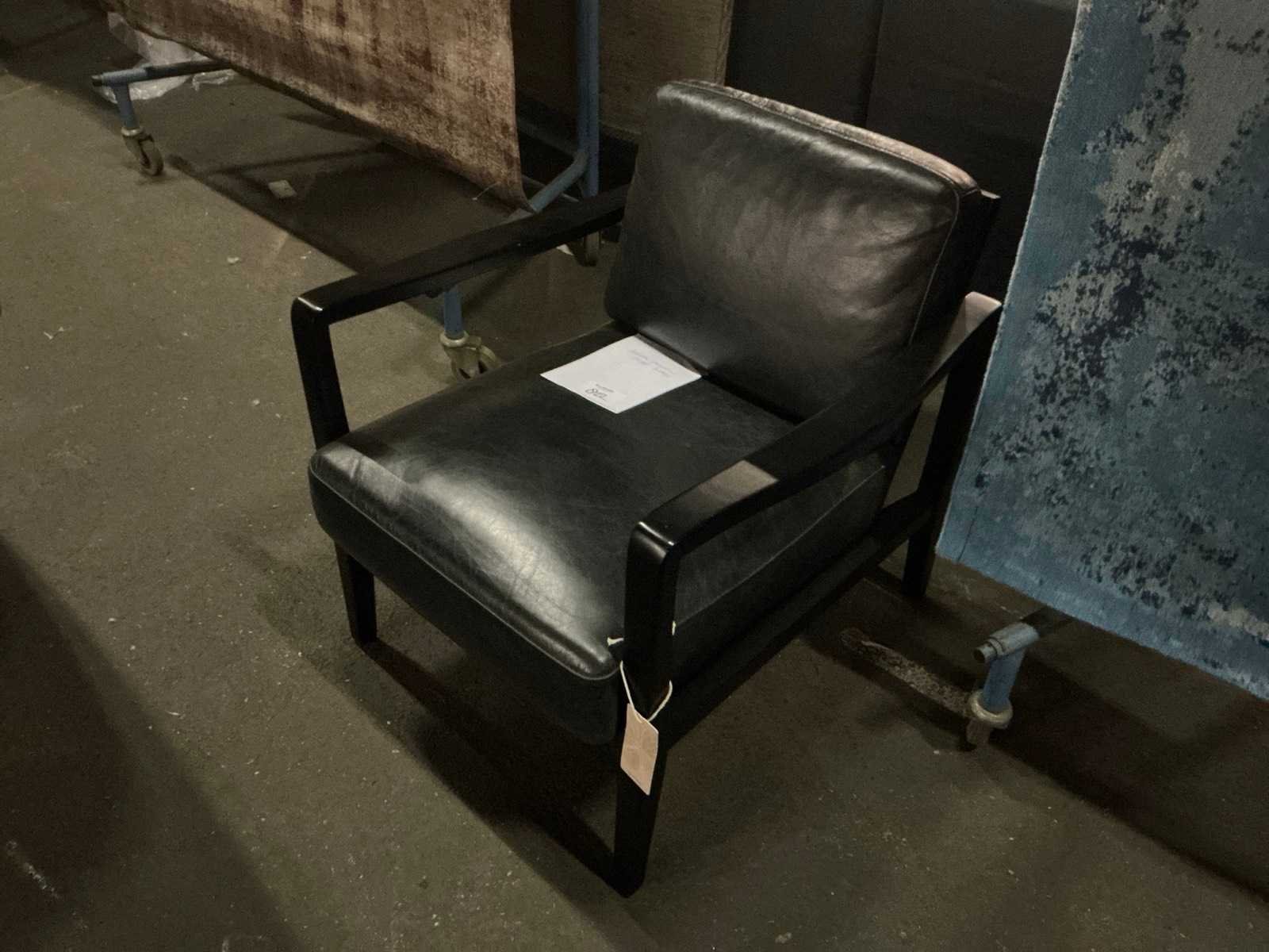 Model: Olaf Kleur: Zwart Lengte: 67cm Breedte: 75cm Hoogte: 73cm Zithoogte: 42cm Materiaal: Leder en hout