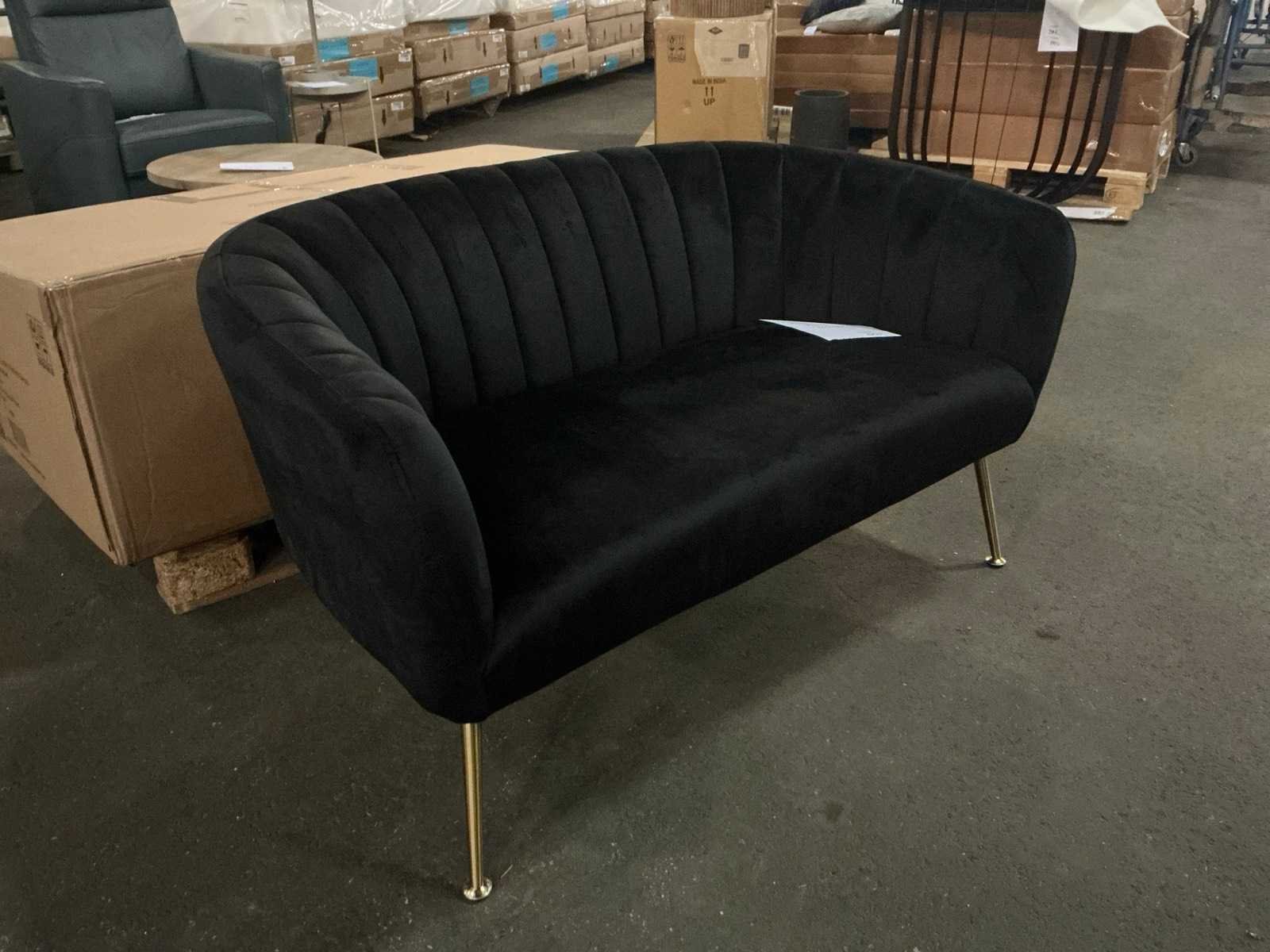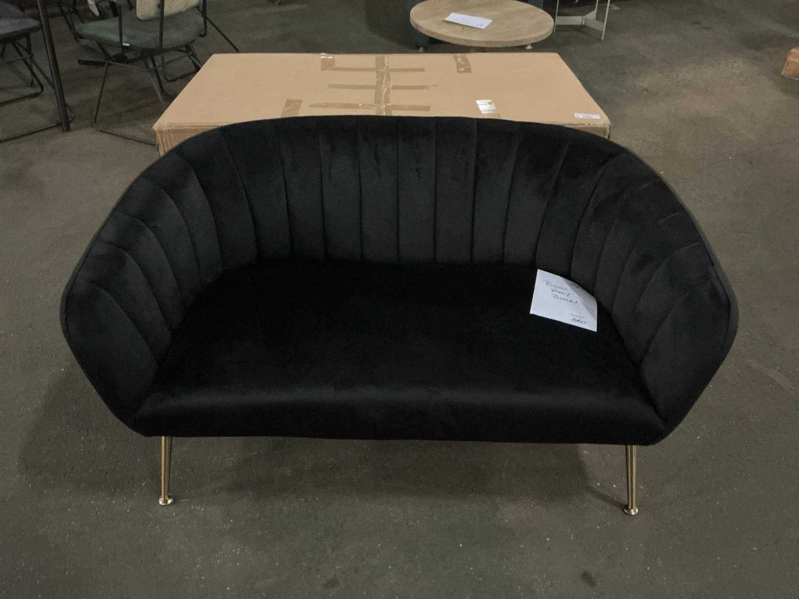 Merk: Gigameubel Model: Amy Zitplaatsen: 2 Kleur: Zwart Lengte: 127cm Breedte: 75cm Hoogte: 69cm Zithoogte: 42cm Diepte: 53cm Materiaal: Velvet stoffen bekleding op goudkleurige poten