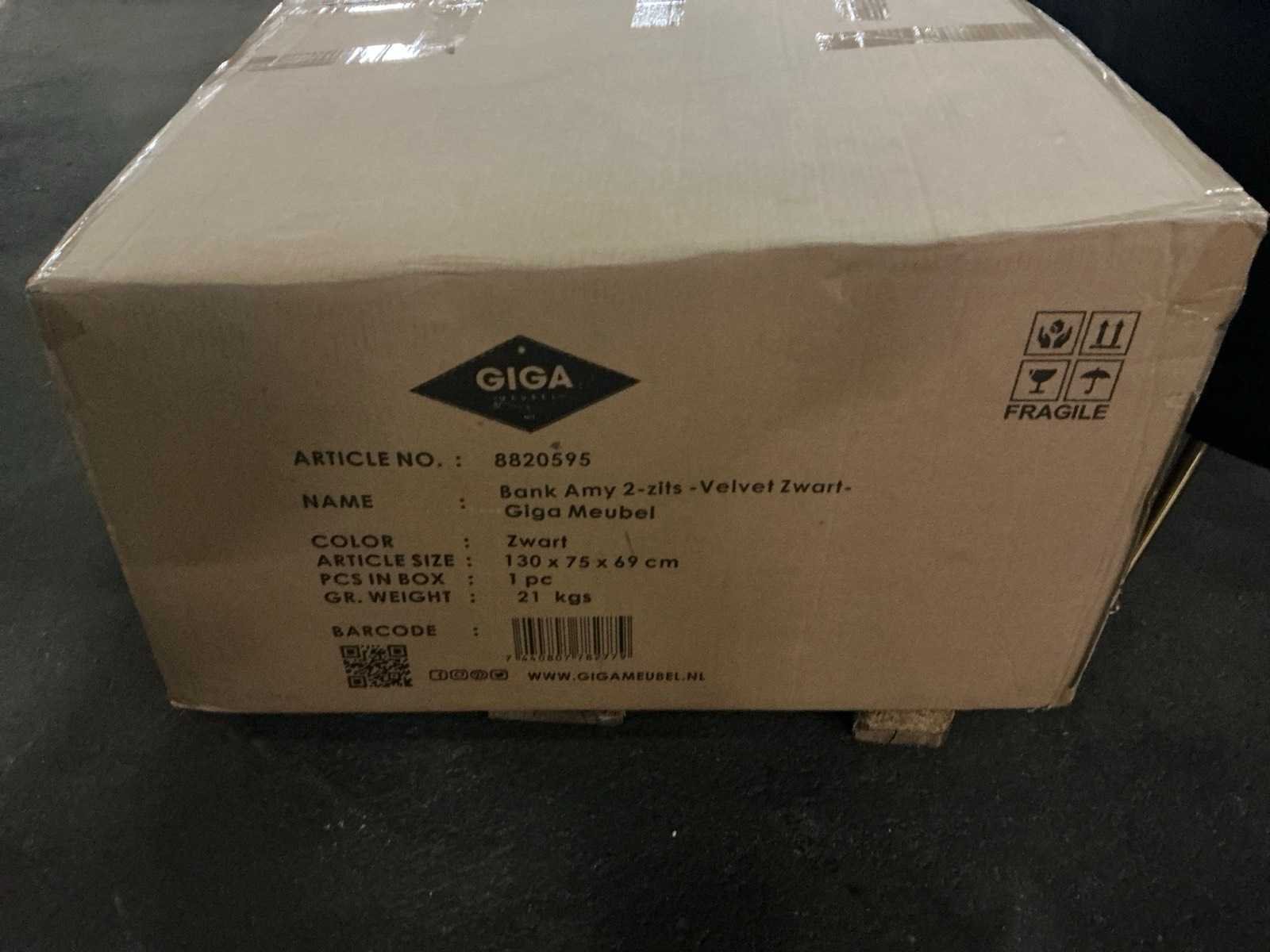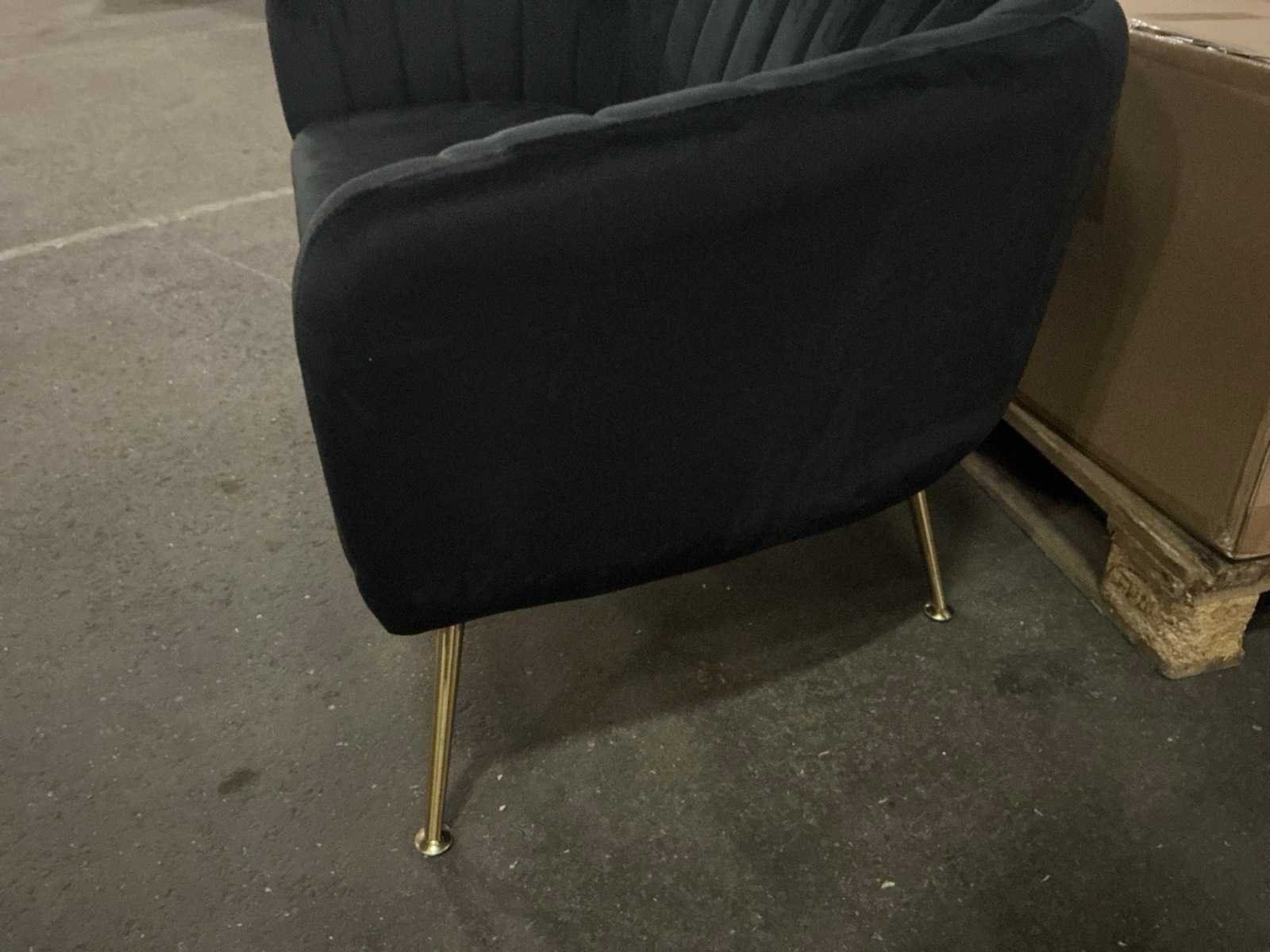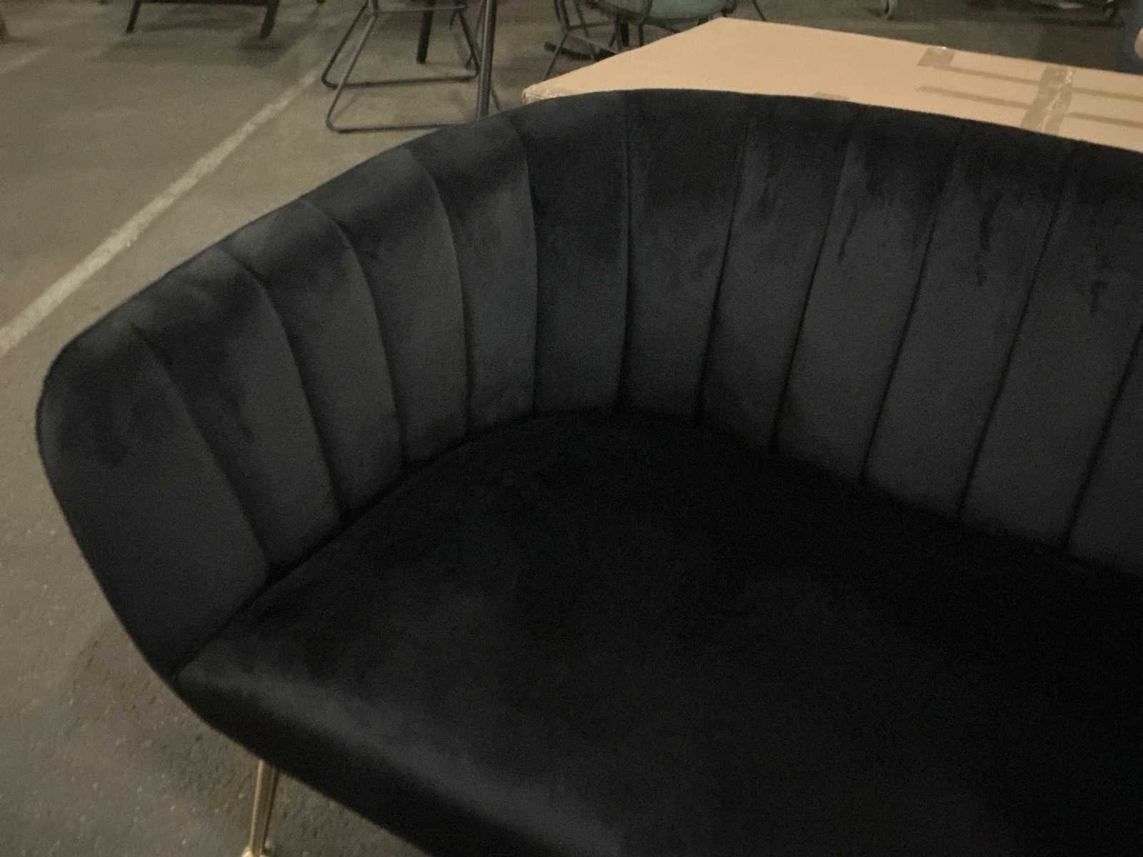 Merk: Gigameubel Model: Amy Zitplaatsen: 2 Kleur: Zwart Lengte: 127cm Breedte: 75cm Hoogte: 69cm Zithoogte: 42cm Diepte: 53cm Materiaal: Velvet stoffen bekleding op goudkleurige poten