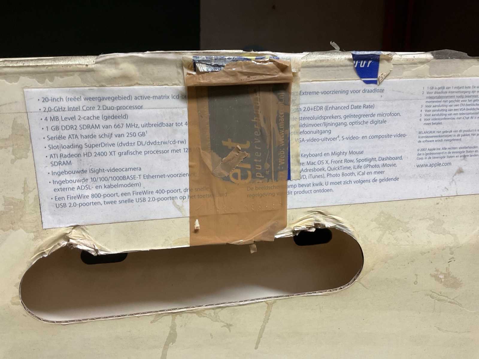 Zonder verdere toebehoren. Merk: Apple Type: iMac Processor type: Core 2 Duo Processor snelheid: 2Ghz Type datadrager: Seriële ATA Serienummer: W87478QUX85 RAM Geheugen: 1GB RAM Geheugen Type: DDR2 Opslagcapaciteit: 250GB Type videokaart: ATI Radeon HD2400XT Kleur: Zilver Beelddiagonaal: 20''