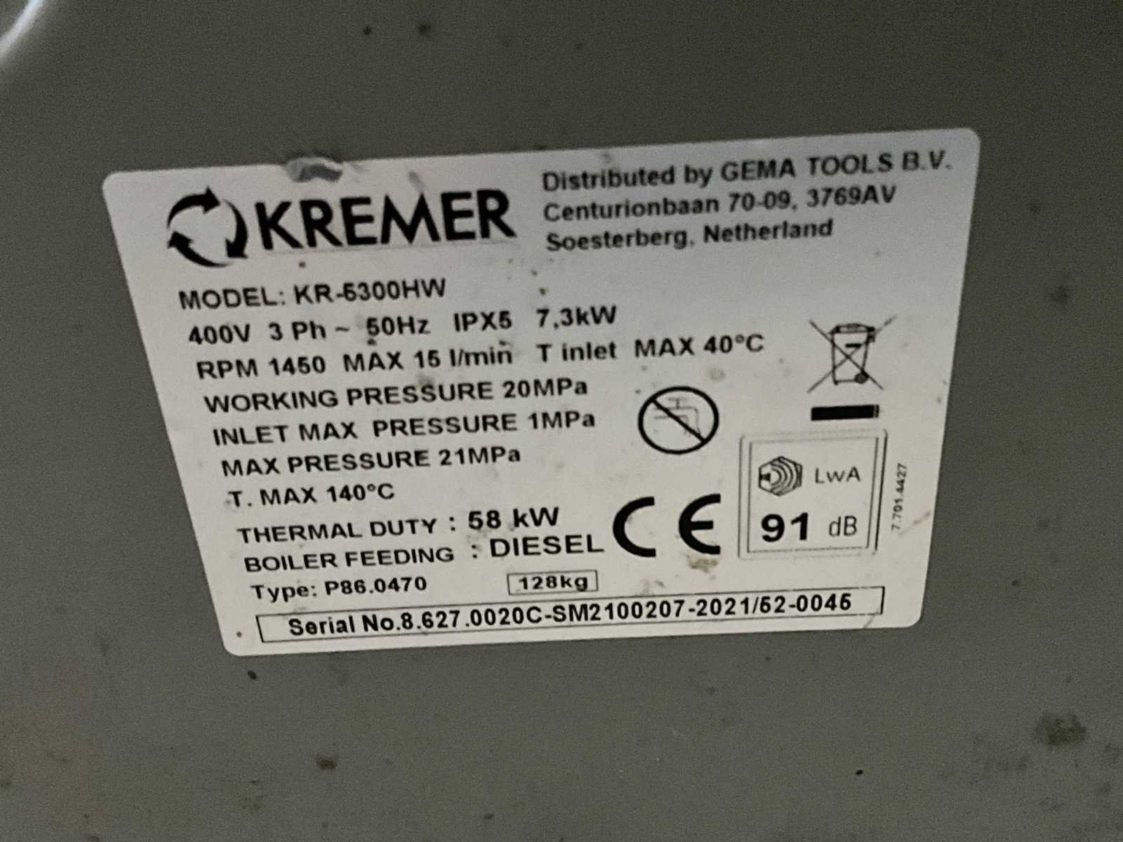 Merk: Kremer Type: KR-5300 HW Bouwjaar: 2021 Serienummer: 8.627.0020C-SM2100207-2021/52-0045 Maximale werkdruk: 21bar Temperatuurbereik max.: 140°c Capaciteit.: 900l/hr Dieselgestookt: true Mobiel: true Aansluiting: 400V Eigen gewicht: 128kg Totale afmeting L: 1200mm Totale afmeting Breedte: 800mm Totale afmeting Hoogte: 860mm