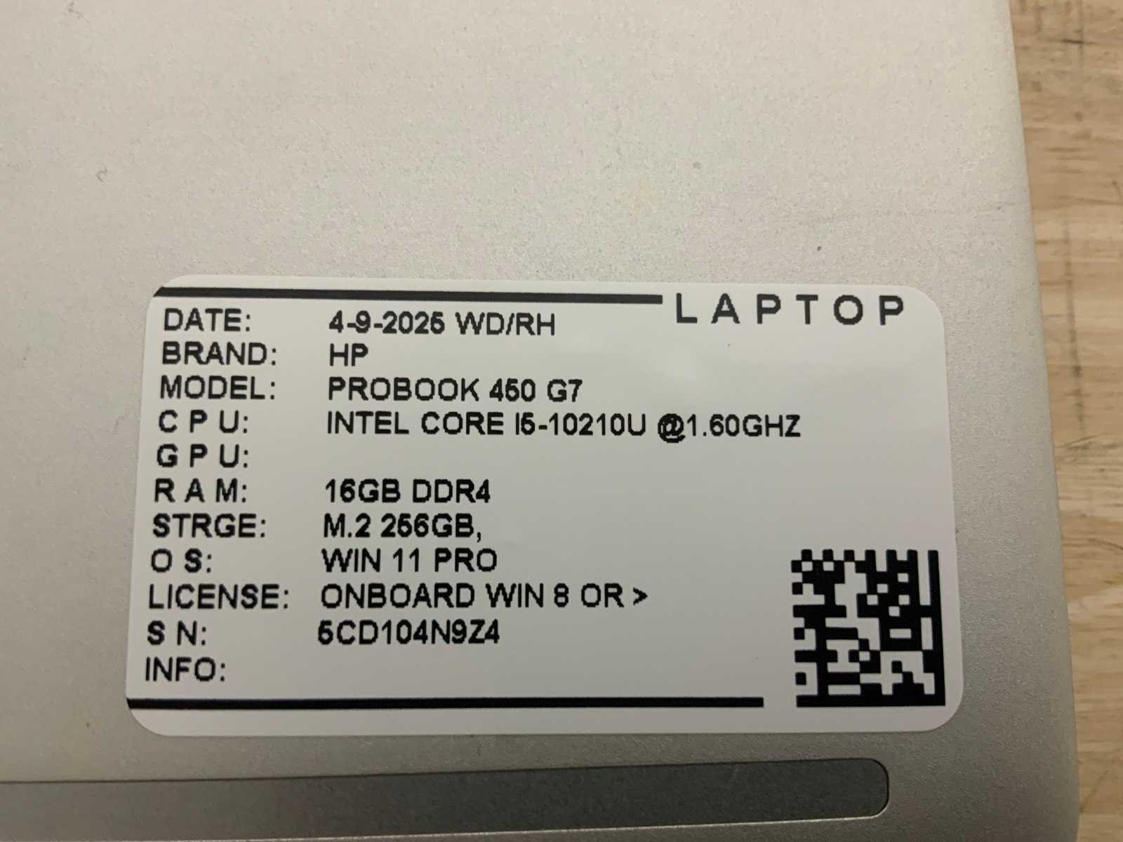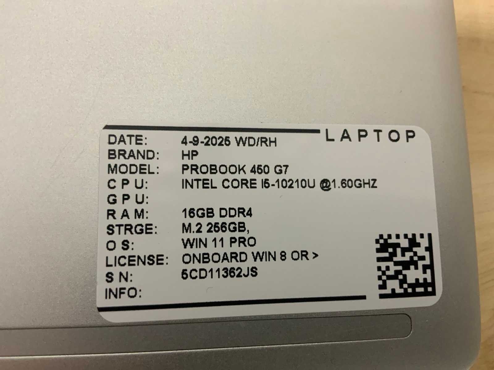 Merk: Hp Type: ProBook 450 G7 Processor type: Intel core i5-10210U Processorsnelheid Ghz: 1,60 RAM Geheugen: 16GB RAM Geheugen Type: DDR4 Totale opslagcapaciteit: 256GB Type datadrager: M.2 SSD Aantal datadragers: 1 Besturingssysteem: Windows 11 Pro Licentie: Onboard Zonder adapter: true Wifi: true Bluetooth: true Ethernet: 1 USB-Type: USB-A & USB-C USB poorten: 4 Card reader: true Koptelefoon aansluiting: true Webcam: true Toetsenbord: QWERTY HDMI: 1